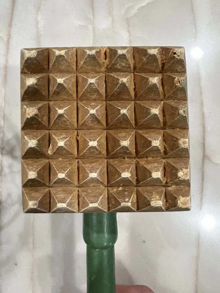 Culture: NA Handle Material: Wood Number of Items in Set: 1 Model: NA Style: Vintage/Retro Country/Region of Manufacture: Unknown Brand: Kitchen Original/Licensed Reproduction: Original MPN: NA Item Length: 11.5 in Set Includes: Mallet Modified Item: No Material: Wood UPC: Does not apply Handle Pattern: NA Occasion: NA gtin13: Does not apply Handmade: No Theme: NA Color: Green Bundle Description: NA Features: Reusable Franchise: NA Time Period Manufactured: 1920-1949 Finish: Matte Wood Tone: Light Yellow Wood Item Weight: 12 oz Character: NA Type: Mallet Custom Bundle: No Department: Adults Service For: NA