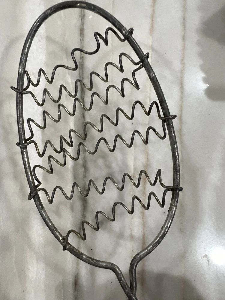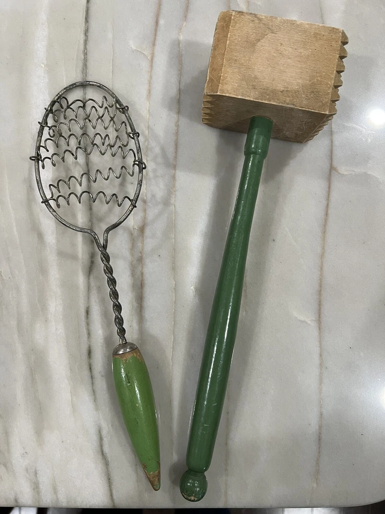 VTG 1930's Wood Meat Tenderizer Kitchen Mallet Utensil, Green Handle, Strainer