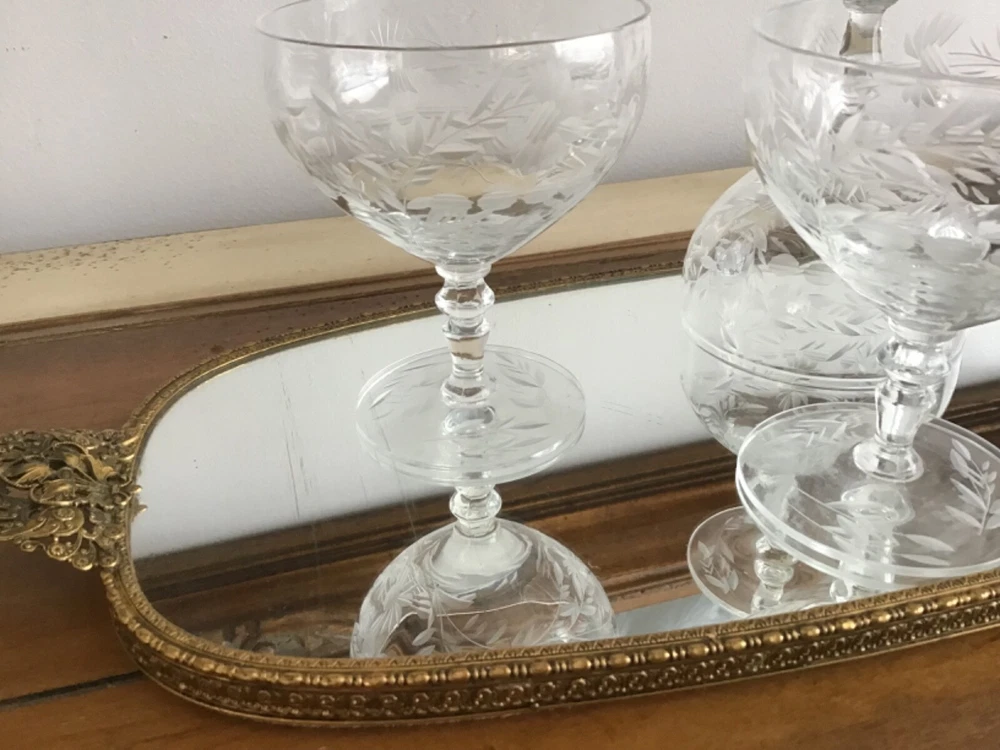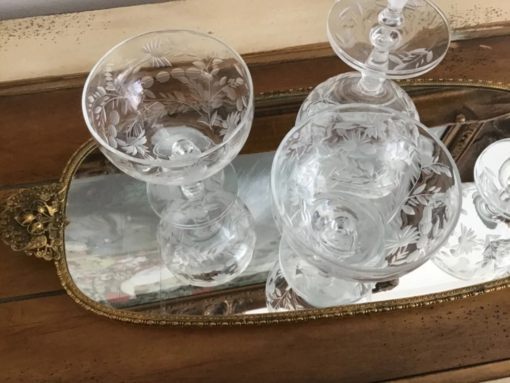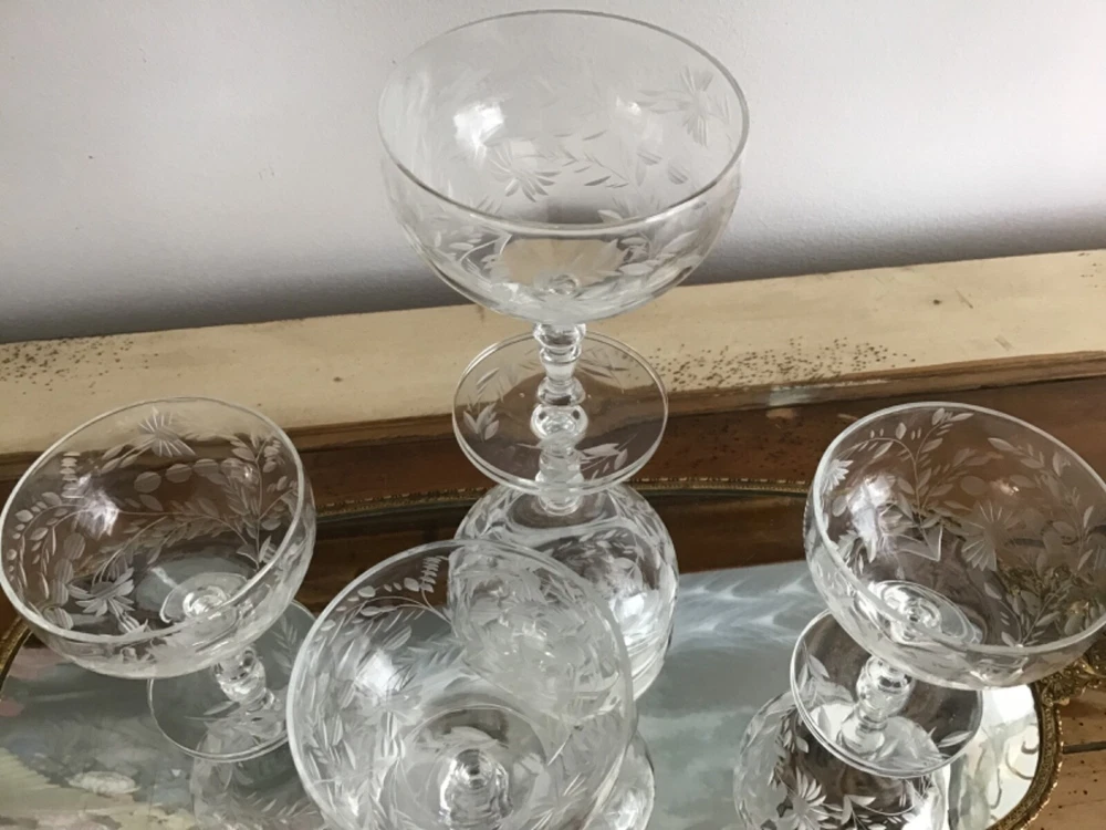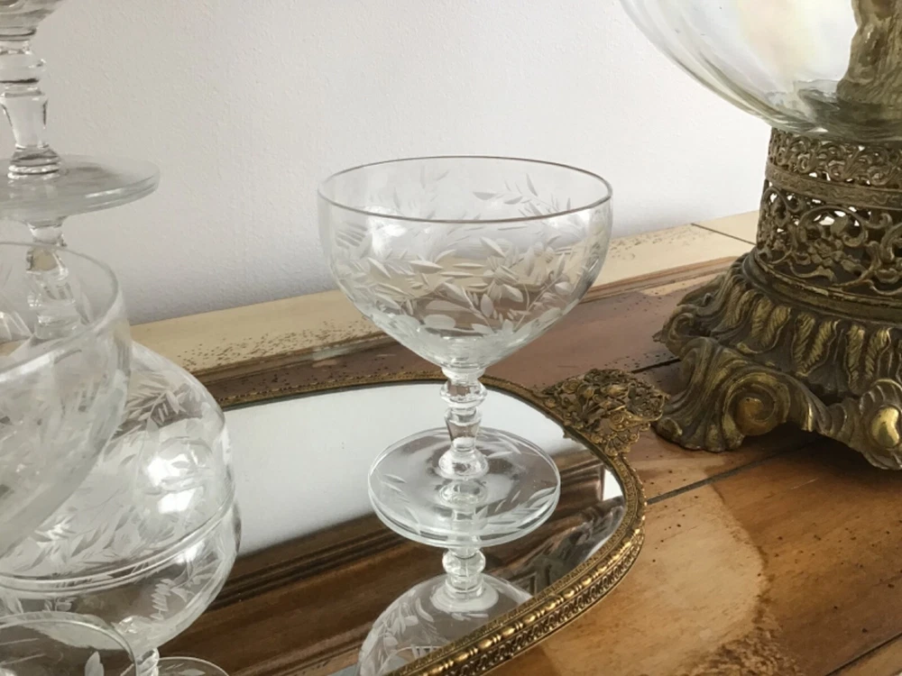 This vintage set of 1950's etched crystal stemmed glasses is perfect for all occasions. The cocktail glasses feature an elegant American Empire style with a clear crystal material and etched design. Manufactured in the 1950s, these glasses are part of the Wildflower product line and showcase a timeless sophistication. The unmarked brand adds to the charm of these licensed reproduction glasses, making them a beautiful addition to any drinkware collection. 4 1/8 x 3 3/8”