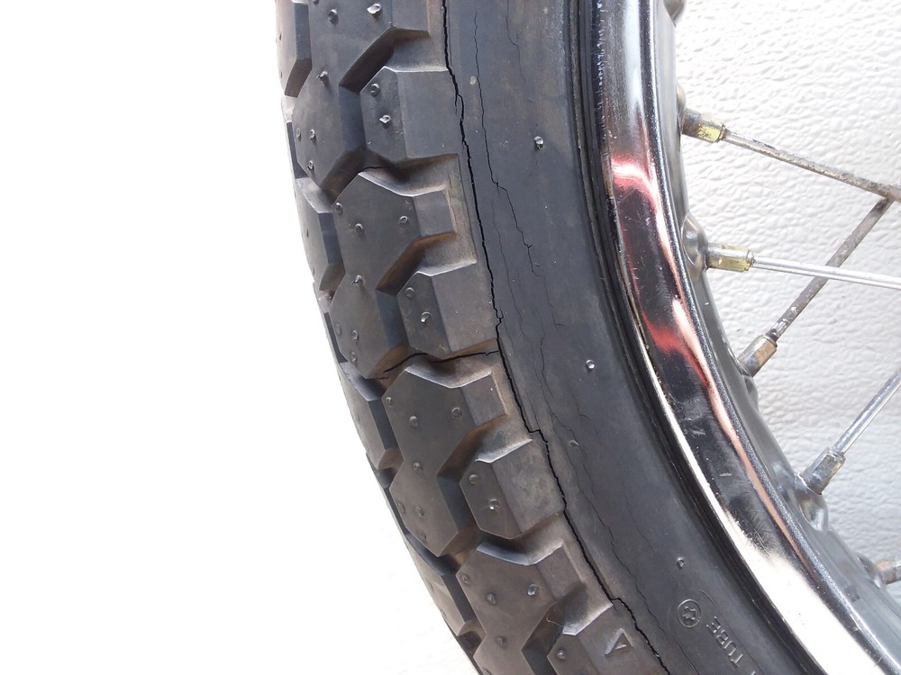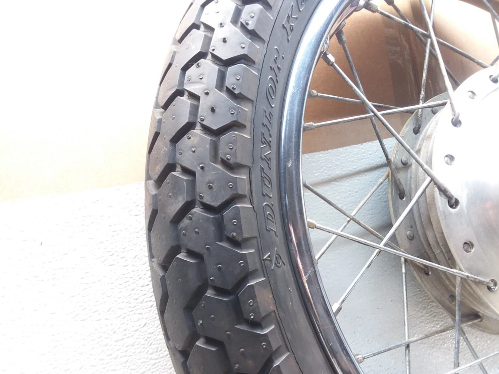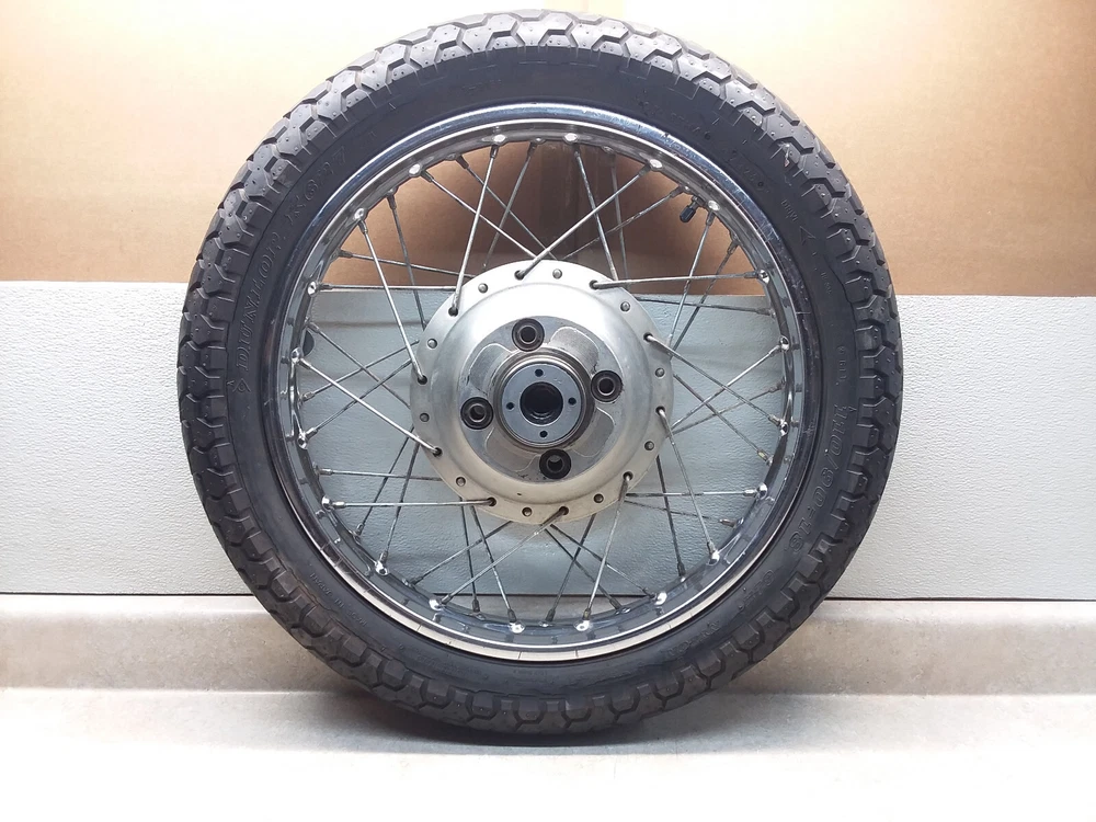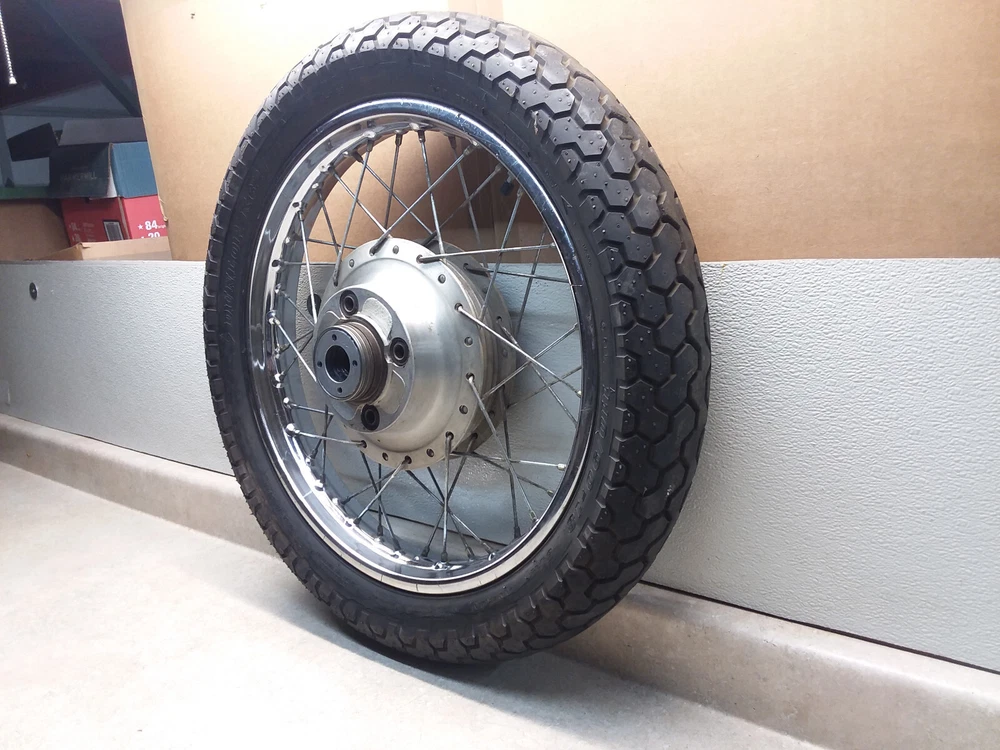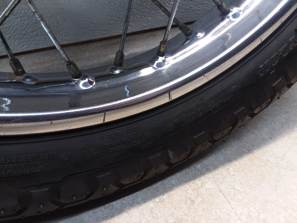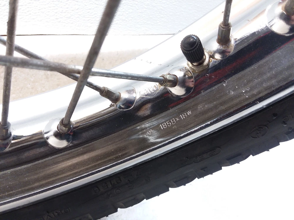 *Used item advertised entirely per pictures, please read the below description and view all pictures carefully. Thanks! TIRE IS BAD, CRACKING FROM OLD AGE. NOT HOLDING AIR. CHROME LOOKS DECENT. SOME SCUFFS, SCRATCHES TIRE IRON MARKS , PITTING AND RUST IS VISIBLE. WHEEL BEARINGS MOVE FREELY. WHEEL SPINS PRETTY STRAIGHT BUT NOT PERFECT. ITEMS MAY HAVE DAMAGE! SEE PICTURES! Could be in the form of scrapes, scratches, road rash, scuffs, spots of corrosion or surface rust, pits, pit specks, oxidation spots/stains from moisture and age, dirt/grime spots or build up, oil residue spots, breaks, cracks, dents, dings, holes, punctures, missing pieces. Or other types of blemishes usually caused from normal use, wear and age. SEE PICTURES DUE TO THE NATURE OF USED MOTORCYCLE PARTS AND THEIR CONDITIONS' BEING SO DIVERSE WE FEEL THE BEST AND MOST EFFICIENT WAY TO SELL AN ITEM IS TO SELL AS IT IS SEEN IN REAL LIFE, PER PICTURES! WE TAKE MANY PICTURES TO SHOW AND ADVERTISE EACH ITEM IN ITS ENTIRETY! NO ADDITIONAL INSPECTIONS, PICTURES OR MEASUREMENTS WILL BE AVAILABLE. WE APOLOGIZE FOR ANY INCONVENIENCES. IMPORTANT! PLEASE READ! Payments are due within 4 days of purchase. ATTENTION INTERNATIONAL CUSTOMERS!!: Import duties, taxes and charges are not included in the item price or shipping charges. These charges are the buyer's responsibility. These charges are normally collected by the delivering freight (shipping) company or when you pick the item up – do not confuse them for additional shipping charges. Please check with your country's customs office to determine what these additional costs will be prior to bidding/buying. ATTENTION!!! Please contact us if the parts you received are not as described. We will do our best to solve any problems. Thank you so much for your interest and viewing our parts!!