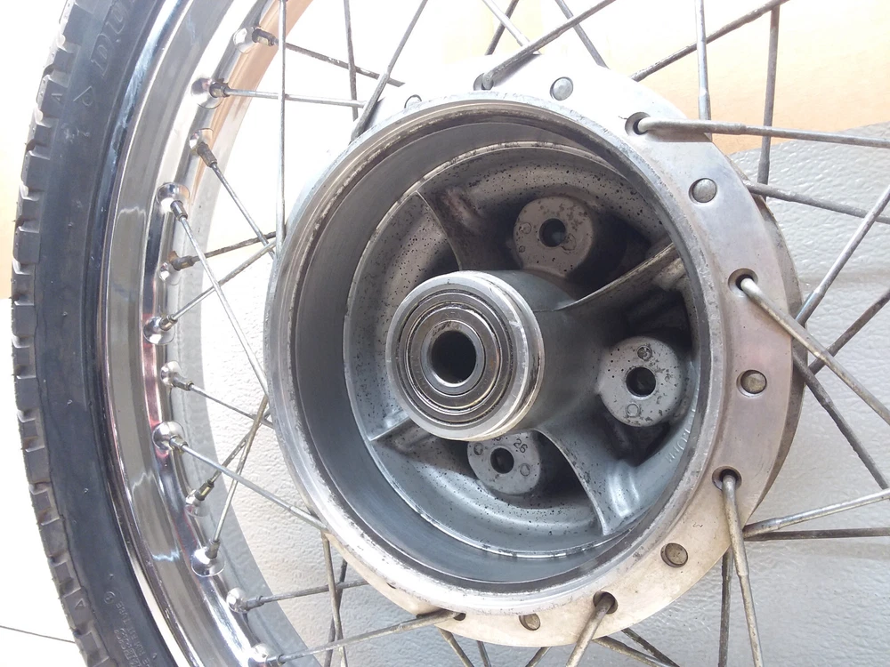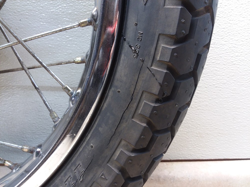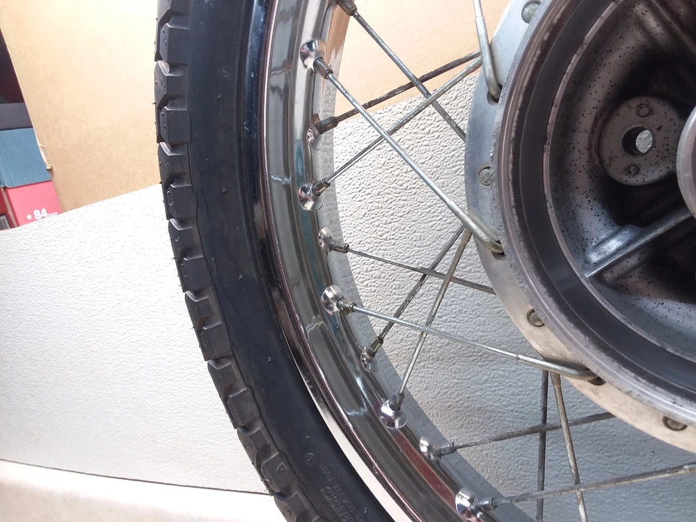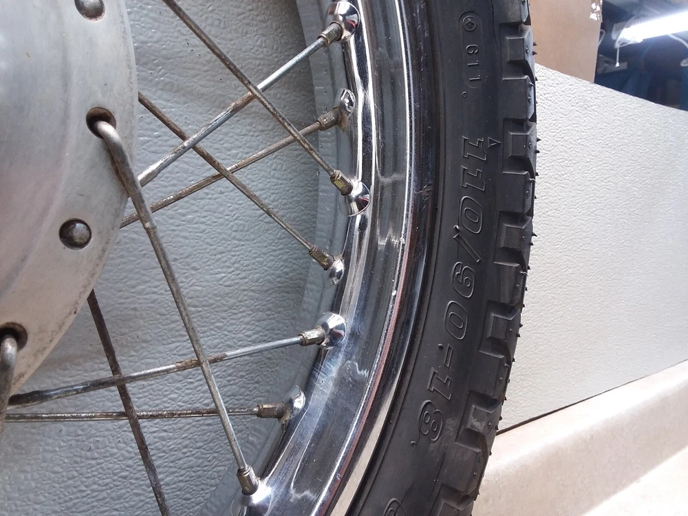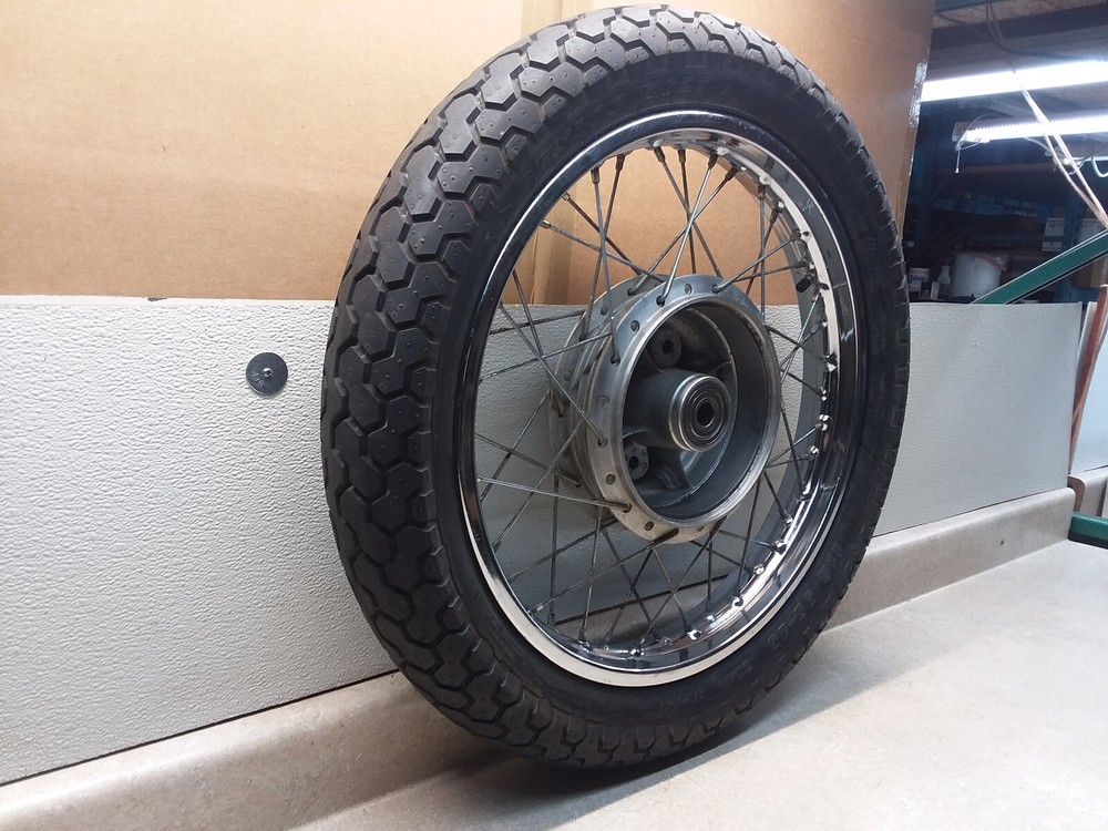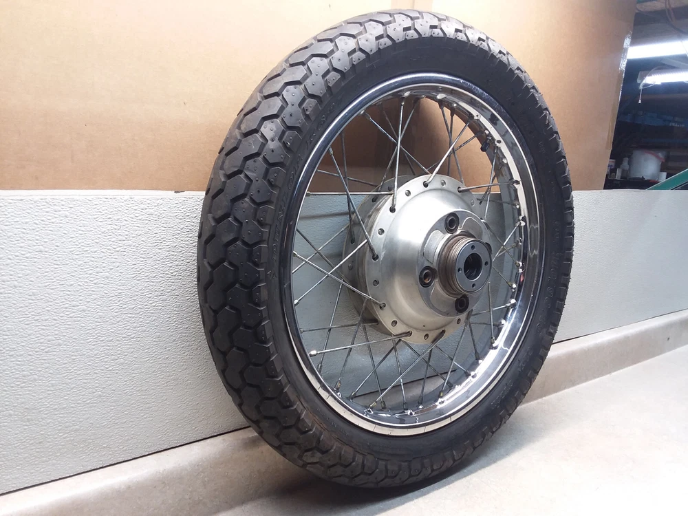 *Used item advertised entirely per pictures, please read the below description and view all pictures carefully. Thanks! TIRE IS BAD, CRACKING FROM OLD AGE. NOT HOLDING AIR. CHROME LOOKS DECENT. SOME SCUFFS, SCRATCHES TIRE IRON MARKS , PITTING AND RUST IS VISIBLE. WHEEL BEARINGS MOVE FREELY. WHEEL SPINS PRETTY STRAIGHT BUT NOT PERFECT. ITEMS MAY HAVE DAMAGE! SEE PICTURES! Could be in the form of scrapes, scratches, road rash, scuffs, spots of corrosion or surface rust, pits, pit specks, oxidation spots/stains from moisture and age, dirt/grime spots or build up, oil residue spots, breaks, cracks, dents, dings, holes, punctures, missing pieces. Or other types of blemishes usually caused from normal use, wear and age. SEE PICTURES DUE TO THE NATURE OF USED MOTORCYCLE PARTS AND THEIR CONDITIONS' BEING SO DIVERSE WE FEEL THE BEST AND MOST EFFICIENT WAY TO SELL AN ITEM IS TO SELL AS IT IS SEEN IN REAL LIFE, PER PICTURES! WE TAKE MANY PICTURES TO SHOW AND ADVERTISE EACH ITEM IN ITS ENTIRETY! NO ADDITIONAL INSPECTIONS, PICTURES OR MEASUREMENTS WILL BE AVAILABLE. WE APOLOGIZE FOR ANY INCONVENIENCES. IMPORTANT! PLEASE READ! Payments are due within 4 days of purchase. ATTENTION INTERNATIONAL CUSTOMERS!!: Import duties, taxes and charges are not included in the item price or shipping charges. These charges are the buyer's responsibility. These charges are normally collected by the delivering freight (shipping) company or when you pick the item up – do not confuse them for additional shipping charges. Please check with your country's customs office to determine what these additional costs will be prior to bidding/buying. ATTENTION!!! Please contact us if the parts you received are not as described. We will do our best to solve any problems. Thank you so much for your interest and viewing our parts!!
