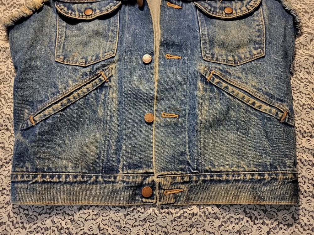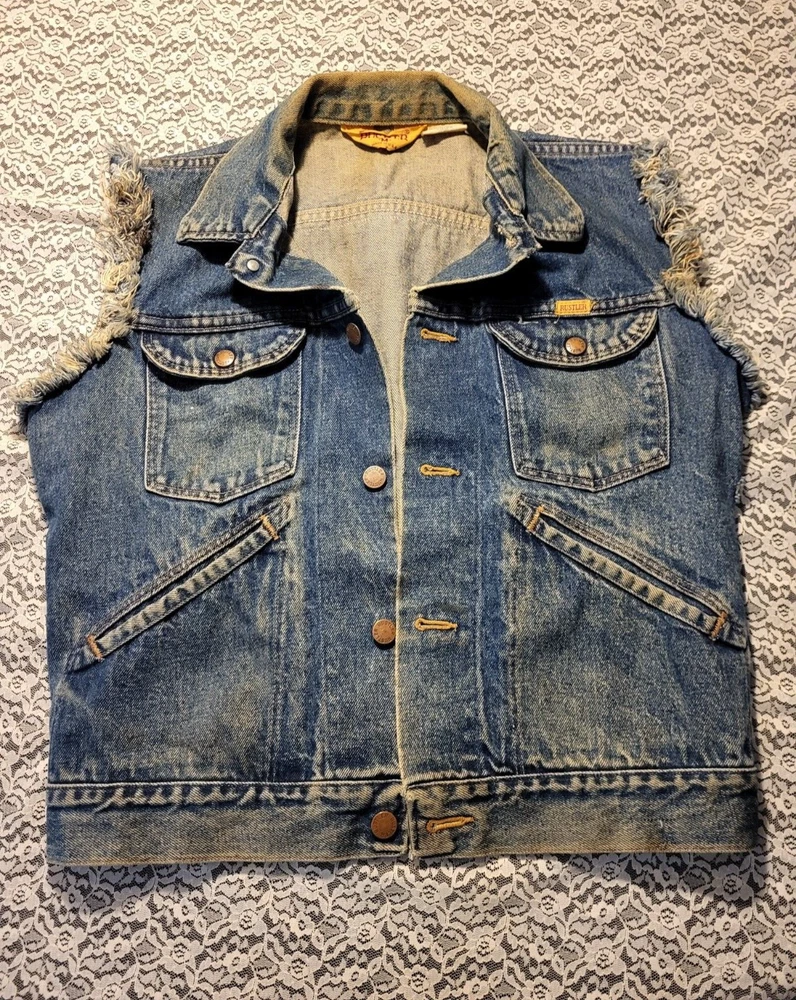 VTG 1980's-RUSTLER JEAN JACKET VEST-SIZE M MENS-WARRIOR-UNICORN BACK PATCH MEASURES 44" AROUND CHEST 35" AROUND WAISTBAND 36" TOP OF SHOULDERS 22" TOP TO BOTTOM VERY COOL APPLIED FABRIC ON BACK. A BEAUTY RIDING A UNICORN AND A MUSCULAR WARRIOR WITH SWORD. VTG 1980's-RUSTLER JEAN JACKET VEST-SIZE M MENS-WARRIOR-UNICORN BACK PATCH PLEASE CHECK- MY OTHER LISTINGS, I HAPPILY COMBINE WONDERFUL ADDITION TO ANY COLLECTION. R SHIPPING INCLUDES DELIVERY CONFIRMATION AND TRACKING NUMBER. PLEASE CHECK MY OTHER LISTINGS, I HAPPILY COMBINE. THANKS FOR LOOKING AND GOOD LUCK! PLEASE BE AWARE THAT MOST ITEMS I SELL ARE VINTAGE, THEY ARE ACQUIRED FROM RUMMAGE SALES, YARD SALES AND AUCTIONS. MY HOME IS A NON SMOKING HOME, BUT I DO HAVE 2 WELL LOVED KITTY'S. I DO NOT KNOW THE ORIGINS NOR ENVIRONMENT FROM WHICH THE ITEMS I BUY COME FROM. THEY HAVE BEEN IN A HOME WITH PETS...THEY ALSO MAY HAVE BEEN FROM A SMOKERS HOME.