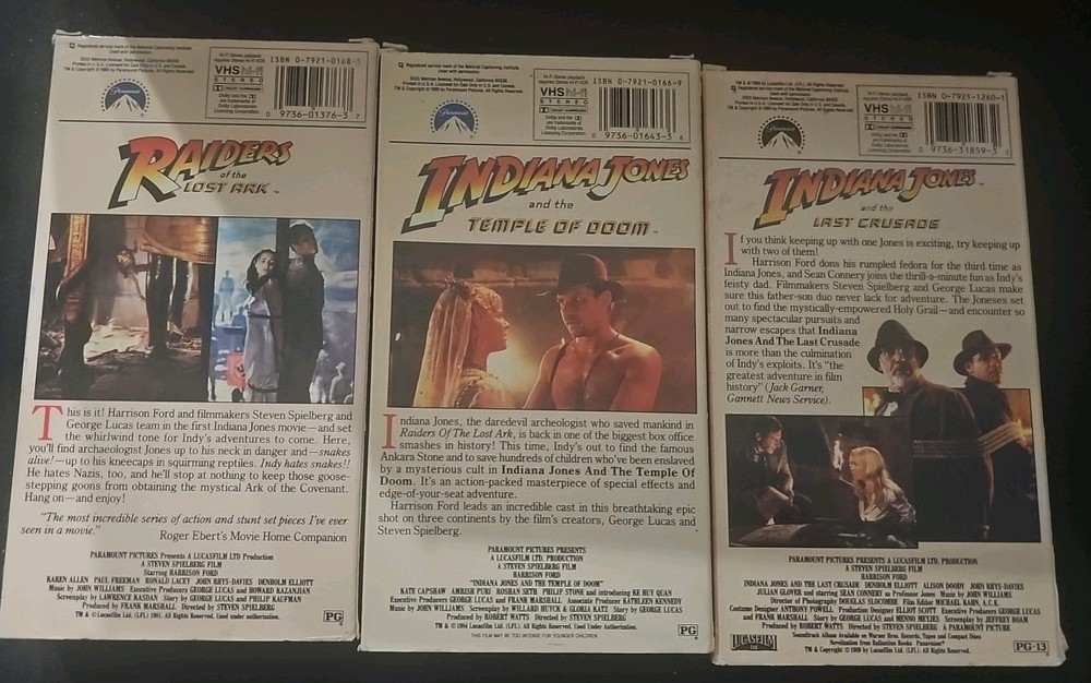The VTG 1989 Indiana Jones Movie Trilogy VHS 3-Tape Box Set includes the original Paramount release of the iconic Raiders of the Lost Ark trilogy directed by Steven Spielberg and George Lucas. Starring action hero Harrison Ford, this collector's edition set features three classic VHS tapes in English language, offering fans of adventure, sci-fi, fantasy, and comedy genres a nostalgic viewing experience. Perfect for retro movie enthusiasts, this box set transports viewers to the thrilling world of Indiana Jones with its epic storytelling and thrilling action sequences. This VHS set is in great condition except for some wear on the paper case. Please refer to pictures.