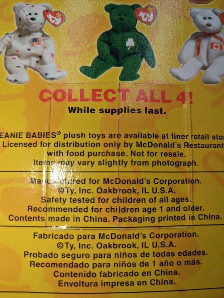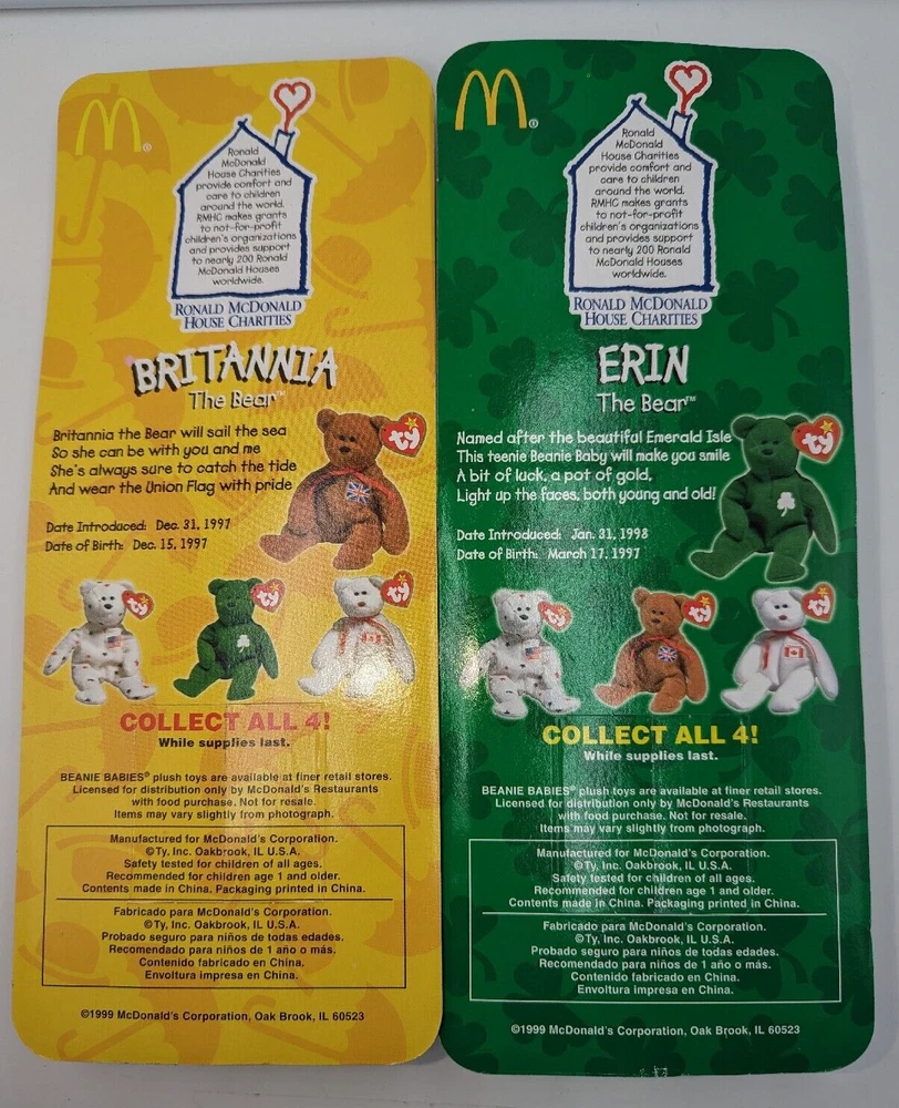 VTG 1999 McDonald's Ty Beanie Babies Erin & Britannia New in Package. These beanie babies are in very nice condition. There is very little wear on the packages, almost none actually. The blister packs do have some dents but nothing major. The paper on the Britannia Bear is opened at the perforation but the bear has never been removed from the package - at any rate the package stays closed. See the last photo for that and see all the photos for condition and reference. All of my items are carefully packed for shipping, no matter their value - $5 items are wrapped with the same care as a $200 item. My goal is to have your purchase arrive safely. I use recycled packaging when possible but mostly use new, high-quality products so your item will arrive intact without damage. Large, heavy and fragile items are harder to use combined shipping with but just ask if you would like to purchase more than one item and I am more than happy to do so if feasible. If not, maybe we can work out a shipping discount. Measurements are approximate or as close as I can get. Also, the color you see many not be the exact color depending on your computer or phone settings. I do my best to make sure that the colors look as accurate as possible on my end. Thank you and hopefully you will visit my store again!
