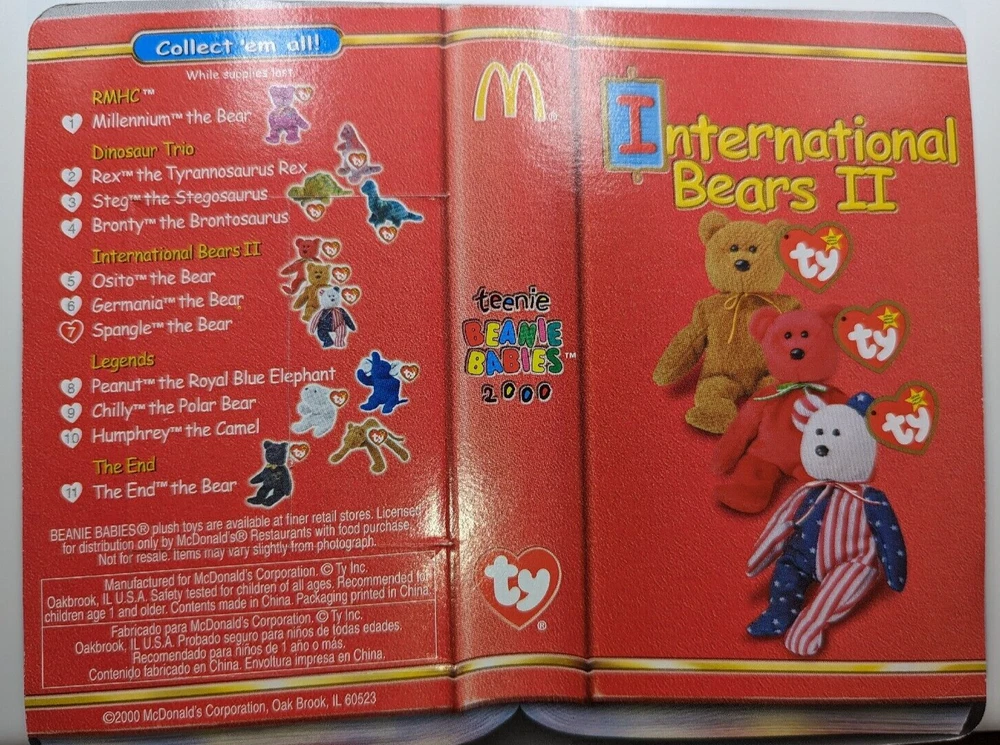 VTG 2000 McDonalds TY Teenie Beanie Baby Special Edition Spangle New in Package. This bear is in excellent shape. The box has some minor wear - The blister pack is starting to peel up on one corner and there is a slight bend in one of the corners of the paper. The plastic on the blister pack is starting to yellow. Please see the photos for reference. The box says it was made in 2000 and the introduction date is 1999. Date of birth is June 14, 1999. All of my items are carefully packed for shipping, no matter their value - $5 items are wrapped with the same care as a $200 item. My goal is to have your purchase arrive safely. I use recycled packaging when possible but mostly use new, high-quality products so your item will arrive intact without damage. Large, heavy and fragile items are harder to use combined shipping with but just ask if you would like to purchase more than one item and I am more than happy to do so if feasible. If not, maybe we can work out a shipping discount. Measurements are approximate or as close as I can get. Also, the color you see many not be the exact color depending on your computer or phone settings. I do my best to make sure that the colors look as accurate as possible on my end. Thank you and hopefully you will visit my store again!