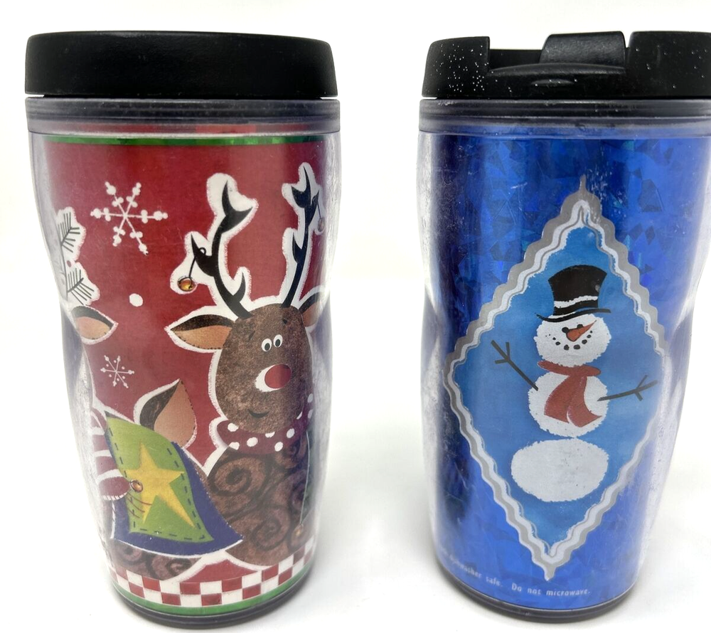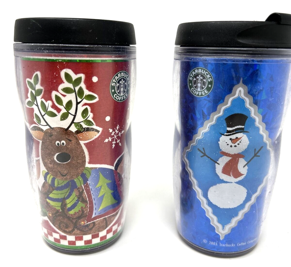 VTG 2001 STARBUCKS 8 OZ Barista Christmas Mugs Cups Tumblers Lidded Lot of 2 Very good pre-owned condition.