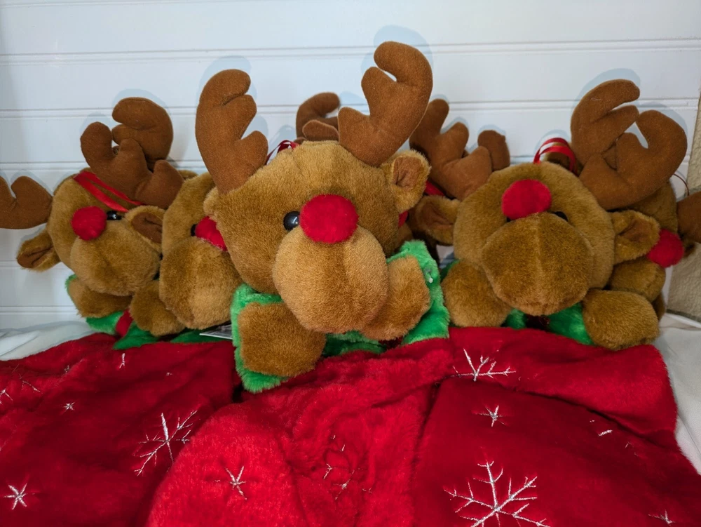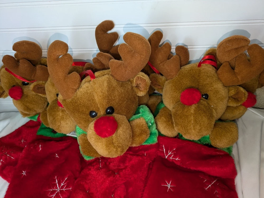 They have a button to light up and play music but they're dead and need batteries but are definitely cute the way they are. Get ready to add a touch of Christmas spirit to your home with this vintage 3D Rudolph Reindeer Stuffed Plush Red Green Velour Christmas Stocking. Measuring 22 inches in height, this medium-sized stocking is perfect for filling with festive treats and decorations. Made from soft velour material, this stocking features a solid pattern and a reindeer shape, making it the perfect addition to your holiday décor. Whether you're looking for a stocking to hang on your fireplace mantle or one to display in your home, this Rudolph Reindeer stocking is sure to bring a smile to your face. It's reusable, vintage, and comes with polyester fibers filling, making it a great choice for kids and adults alike. Add a touch of holiday cheer to your home with this charming stocking.