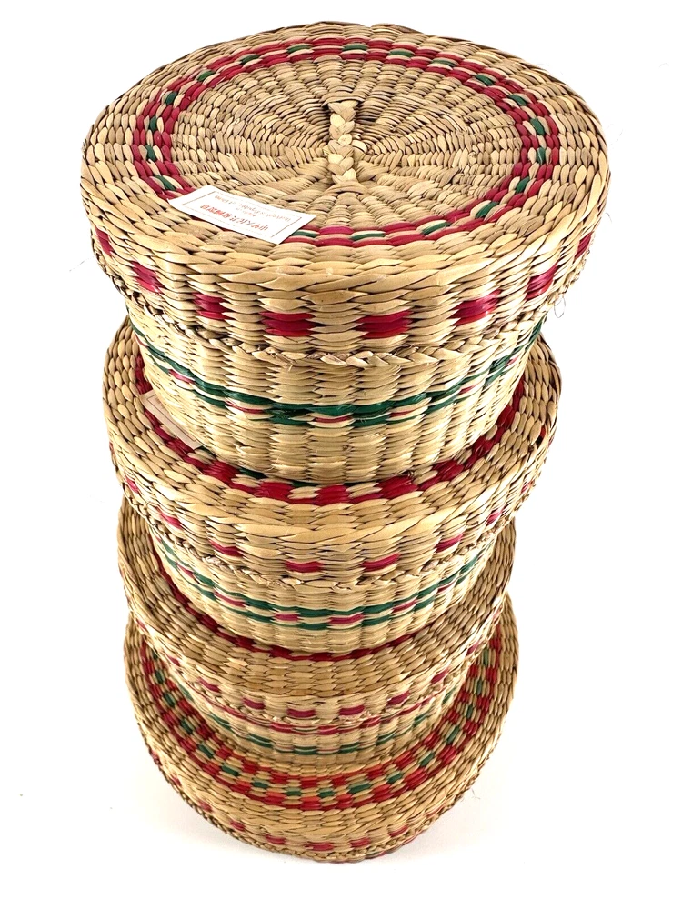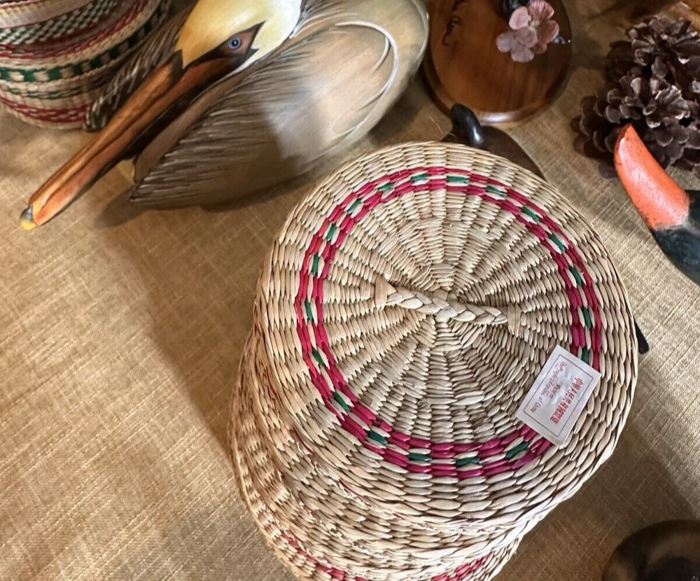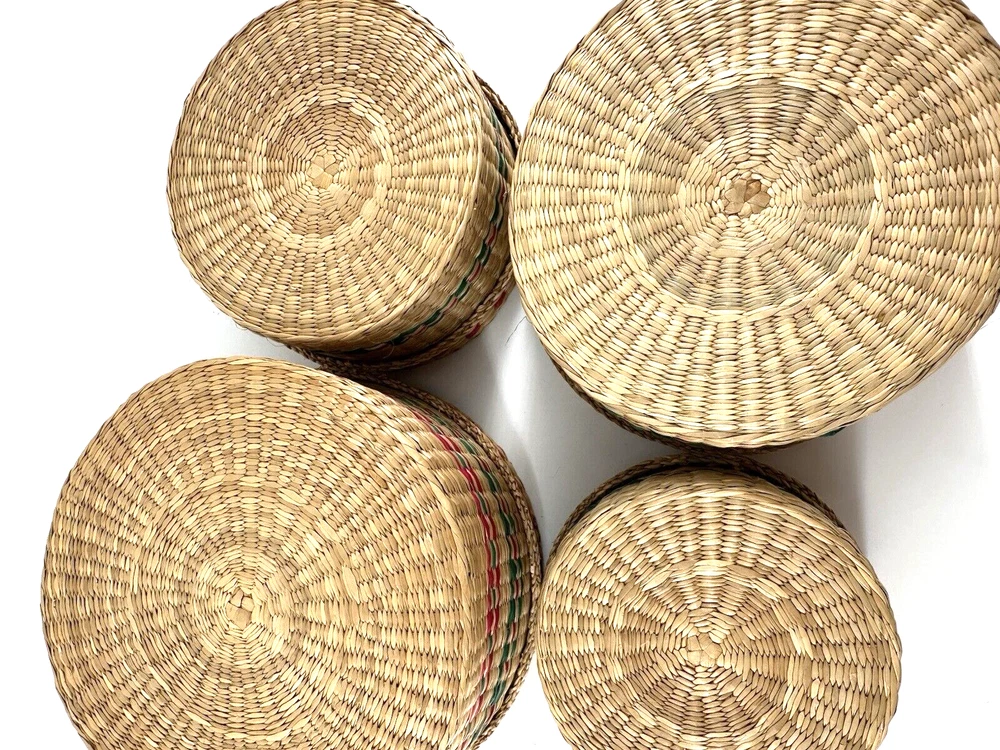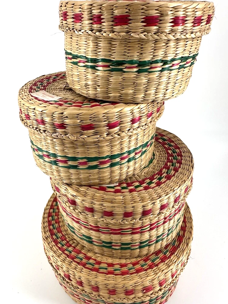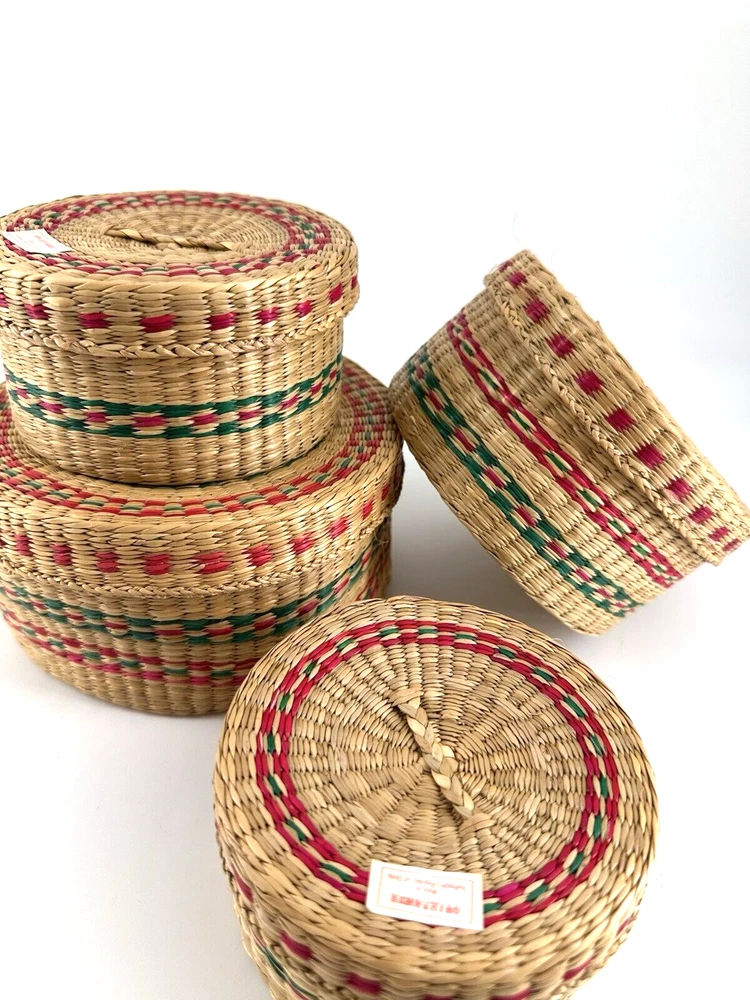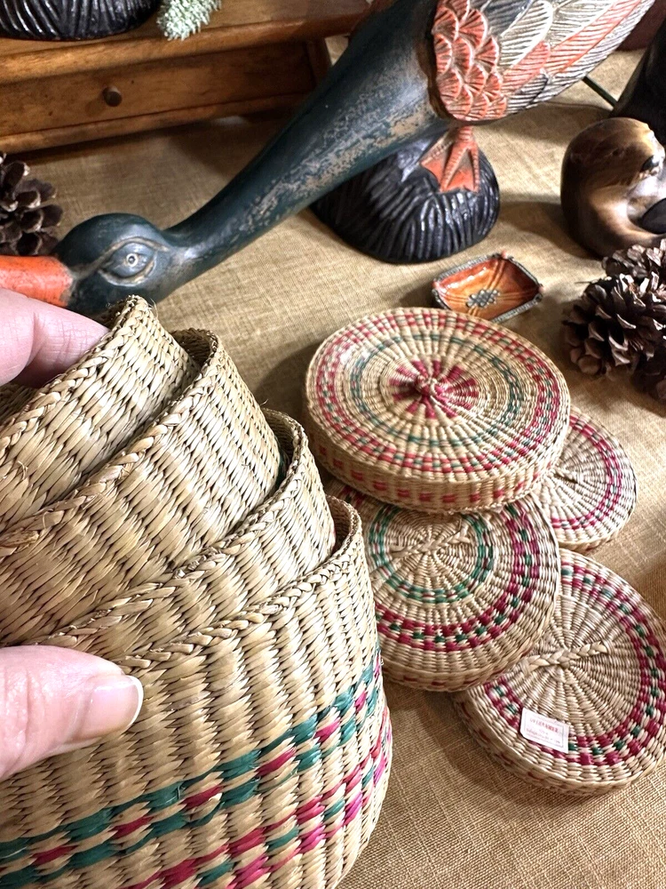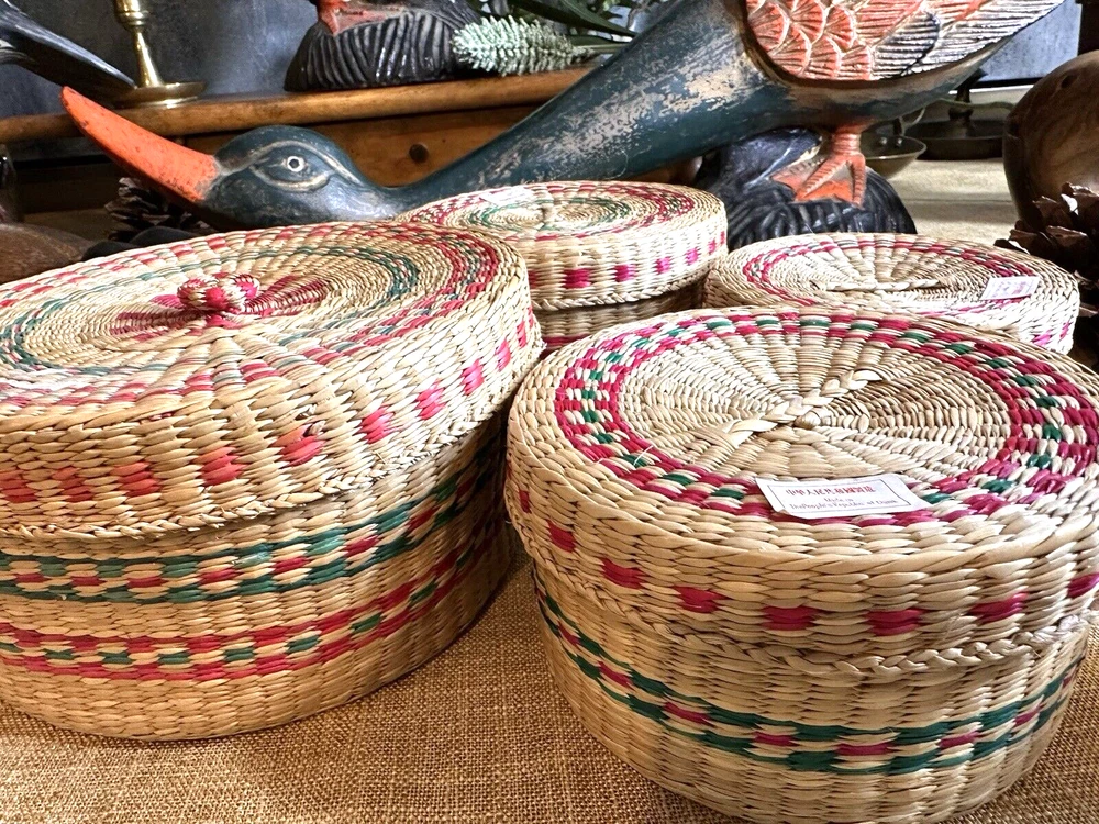 Closure Type: lid Room: Any Room Pattern: Woven Character Family: Woven Baskets Finish: Natural Brand: Cottage / Cabin Core Item Height: 4.5 Care Instructions: Clean with Damp Cloth Year Manufactured: 1949 Material: sweetgrass Character: Cottage Country Cabin Core decor Original/Reproduction: Original Style: Boho Item Width: 6 inches Size: Medium Production Technique: Weaving Shape: Round Engraved: No Type: Nantucket Basket Time Period Manufactured: Modern Color: Multi - color Occasion: All Occasions Suitable For: Storage UPC: N/A Listed by: YouBeYou LLC Item Length: 6 in Customized: No Department: Kids, Teens, Adults Era: Mid 20th Century (1941-1969) gtin13: N/A Country/Region of Manufacture: United States Number in Pack: 4 Features: With Handle, lidded, Comes with lid, woven lidded baskets, Boho, Hand woven, Country Cabin Cottage Core Style, LOT OF FOUR (4), The peoples republic of China -- very old Handmade: Yes Theme: Country Cottage Cabin core Fill Material: none
