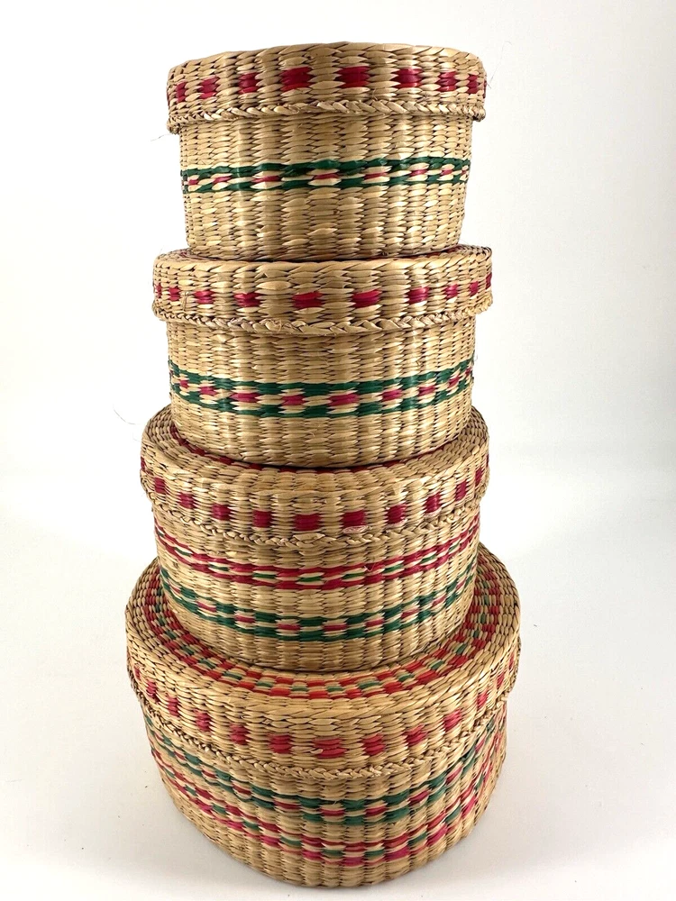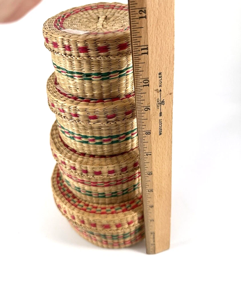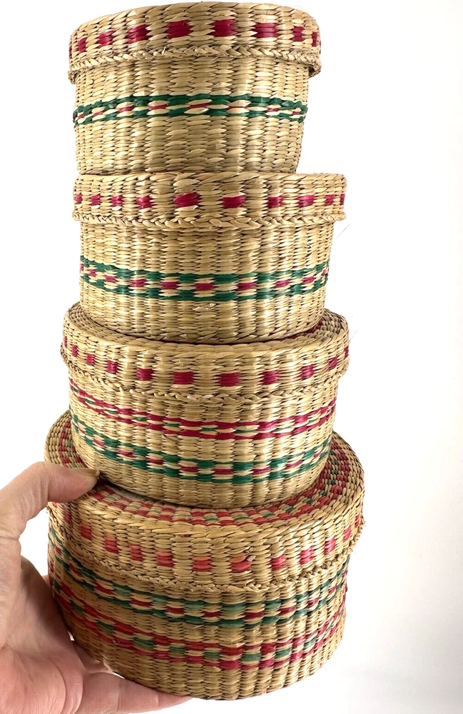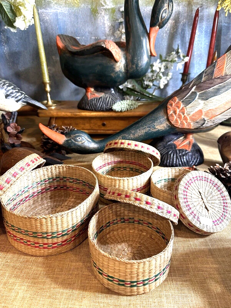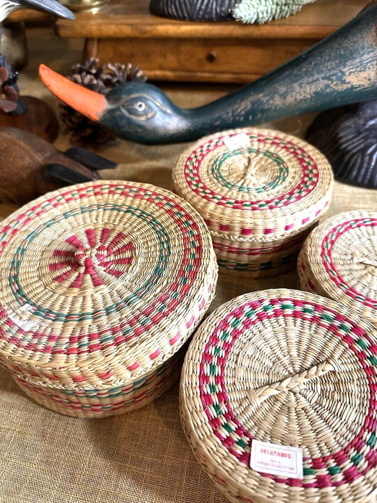 Total of four. Cottage core vibe! SEE VIDEO to appreciate these four beautiful (very) vintage nesting baskets. These date back to 1949 as The "PEOPLES REPUBLIC OF" or its abbreviation P.R.O.C. in Western or Chinese characters was added from 1949. There are three of the baskets that have the original sticker --- for collectors, this means a lot as you rarely see the original stickers from back in the 40's. I am totally amazed by these nesting baskets and the condition is extremely good. These are over 75 years old and gorgeous! This set includes four vintage Nantucket-style baskets with a Boho and Cottage Core aesthetic. Handmade in 1949, these round, medium-sized baskets are woven from sweetgrass in a multi-color pattern. Each basket has different measurements and the largest measures at approximately 6 inches in width, and 4.5 inches in height, featuring a lid and a handle for easy storage. With a charming Country Cabin Core style, these baskets are suitable for various rooms and occasions, adding a rustic touch to any space. You may see other items in the background. If you are new here, these items in the background that are not included are items that will be in my Ebay shop either this week or next week. So, you get a sneak peak of what is coming up next!! :)). Here is my Ebay shop: YouBeYou LLC Now back to your beautiful baskets...... Each basket comes with a lid whereas the larger one has the round handle and the nesting baskets has the braided handles. The set is ideal for those who are wanting to add some texture to their decor. Not only can they be used for storage, they add a touch of Cottage Core to any room with their handwoven design and charming appearance. These baskets are called nesting baskets and each of them nest inside the other. You will receive a lot of four (4) vintage baskets. The tones of the sweetgrass baskets have a boho style to them. These vintage Nantucket-style baskets offer a charming addition to any room with their round shape and boho cottage core design. Handwoven from sweetgrass in the late 40's, this set of nesting baskets features a gorgeous pattern. These handmade baskets are a unique find for those who appreciate woven basketry craftsmanship. I love to add baskets to my decor to add texture and they too give a multi-use as they can be used for storage. That a great find for you!! If you have any questions even after you have purchased the item --- I am here for you to answer any questions that you may have! I strive to work diligently with every buyer to ensure they are a satisfied buyer, so please contact me anytime. This is a pre-owned item and I take great care to accurately describe the item but please see the pictures for full details. While we do our best to list every item in detail, these are vintage and pre-owned items, and some flaws are to be expected. Please see all photos/ video as they are a large part of the description of our items. Items come from a smoke-free environment. Each item is described in accurate detail with multiple measurements and various photos at different angles front and back, side to side, top and bottom. I have additional similar items that I have yet to list that you may be interested in. Feel free to follow my store ( YouBeYou LLC ) to see those when posted. Please see all photos/ video as they are a large part of the description of our items. I strive to make every purchase a pleasant experience. Please feel confidence in you purchase that I'll make every effort to correct any issues that may arise. If used, there are always some signs of wear -- well, because it is used, vintage, or antique. Most items are used -- Each item is inspected for quality. It is very important to us that you have a happy Ebay experience! Thank you for supporting a small business like ours! (Note: pictures may include measurements, and some have a video.)