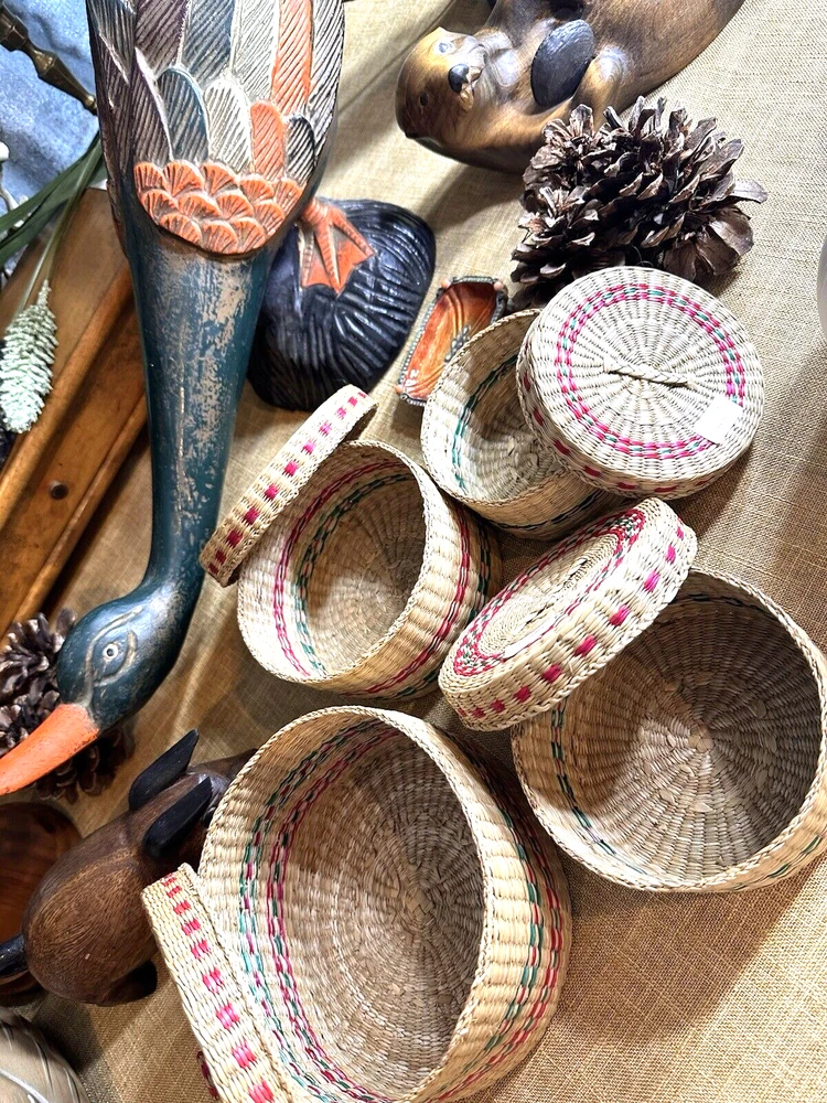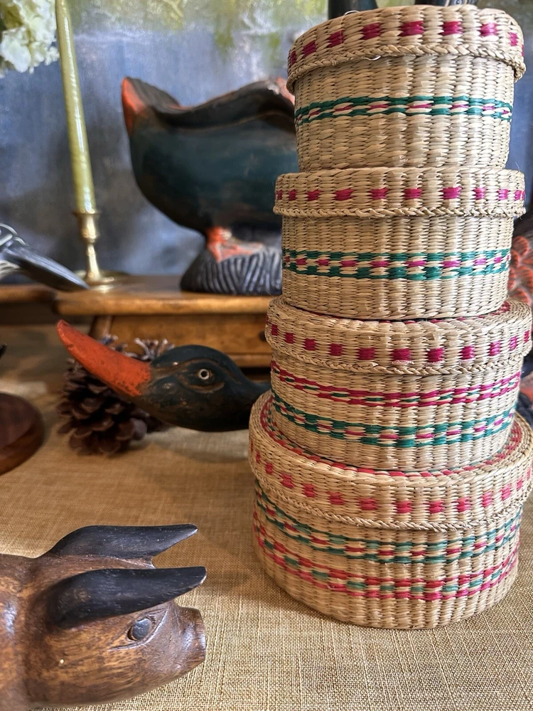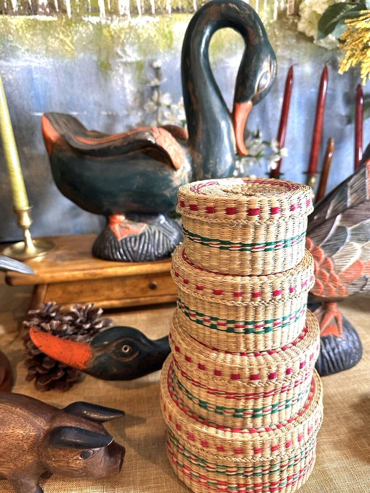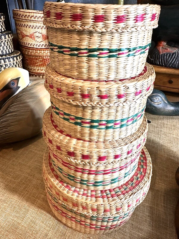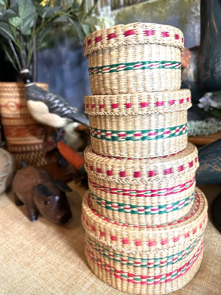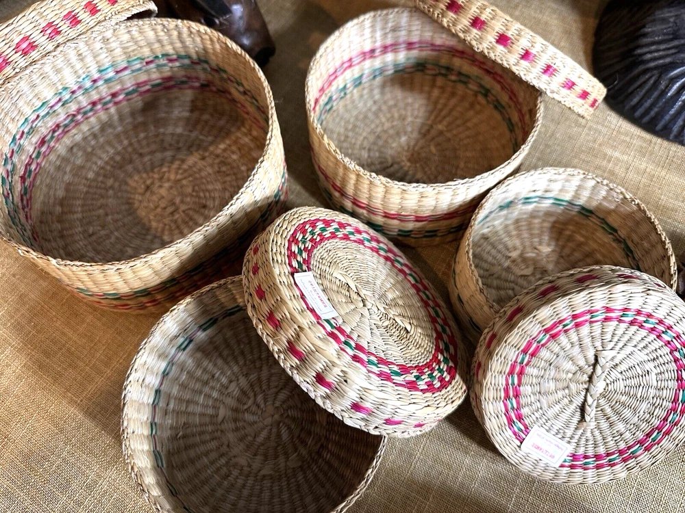 Total of four. Cottage core vibe! SEE VIDEO to appreciate these four beautiful (very) vintage nesting baskets. These date back to 1949 as The "PEOPLES REPUBLIC OF" or its abbreviation P.R.O.C. in Western or Chinese characters was added from 1949. There are three of the baskets that have the original sticker --- for collectors, this means a lot as you rarely see the original stickers from back in the 40's. I am totally amazed by these nesting baskets and the condition is extremely good. These are over 75 years old and gorgeous! This set includes four vintage Nantucket-style baskets with a Boho and Cottage Core aesthetic. Handmade in 1949, these round, medium-sized baskets are woven from sweetgrass in a multi-color pattern. Each basket has different measurements and the largest measures at approximately 6 inches in width, and 4.5 inches in height, featuring a lid and a handle for easy storage. With a charming Country Cabin Core style, these baskets are suitable for various rooms and occasions, adding a rustic touch to any space. You may see other items in the background. If you are new here, these items in the background that are not included are items that will be in my Ebay shop either this week or next week. So, you get a sneak peak of what is coming up next!! :)). Here is my Ebay shop: YouBeYou LLC Now back to your beautiful baskets...... Each basket comes with a lid whereas the larger one has the round handle and the nesting baskets has the braided handles. The set is ideal for those who are wanting to add some texture to their decor. Not only can they be used for storage, they add a touch of Cottage Core to any room with their handwoven design and charming appearance. These baskets are called nesting baskets and each of them nest inside the other. You will receive a lot of four (4) vintage baskets. The tones of the sweetgrass baskets have a boho style to them. These vintage Nantucket-style baskets offer a charming addition to any room with their round shape and boho cottage core design. Handwoven from sweetgrass in the late 40's, this set of nesting baskets features a gorgeous pattern. These handmade baskets are a unique find for those who appreciate woven basketry craftsmanship. I love to add baskets to my decor to add texture and they too give a multi-use as they can be used for storage. That a great find for you!! If you have any questions even after you have purchased the item --- I am here for you to answer any questions that you may have! I strive to work diligently with every buyer to ensure they are a satisfied buyer, so please contact me anytime. This is a pre-owned item and I take great care to accurately describe the item but please see the pictures for full details. While we do our best to list every item in detail, these are vintage and pre-owned items, and some flaws are to be expected. Please see all photos/ video as they are a large part of the description of our items. Items come from a smoke-free environment. Each item is described in accurate detail with multiple measurements and various photos at different angles front and back, side to side, top and bottom. I have additional similar items that I have yet to list that you may be interested in. Feel free to follow my store ( YouBeYou LLC ) to see those when posted. Please see all photos/ video as they are a large part of the description of our items. I strive to make every purchase a pleasant experience. Please feel confidence in you purchase that I'll make every effort to correct any issues that may arise. If used, there are always some signs of wear -- well, because it is used, vintage, or antique. Most items are used -- Each item is inspected for quality. It is very important to us that you have a happy Ebay experience! Thank you for supporting a small business like ours! (Note: pictures may include measurements, and some have a video.)