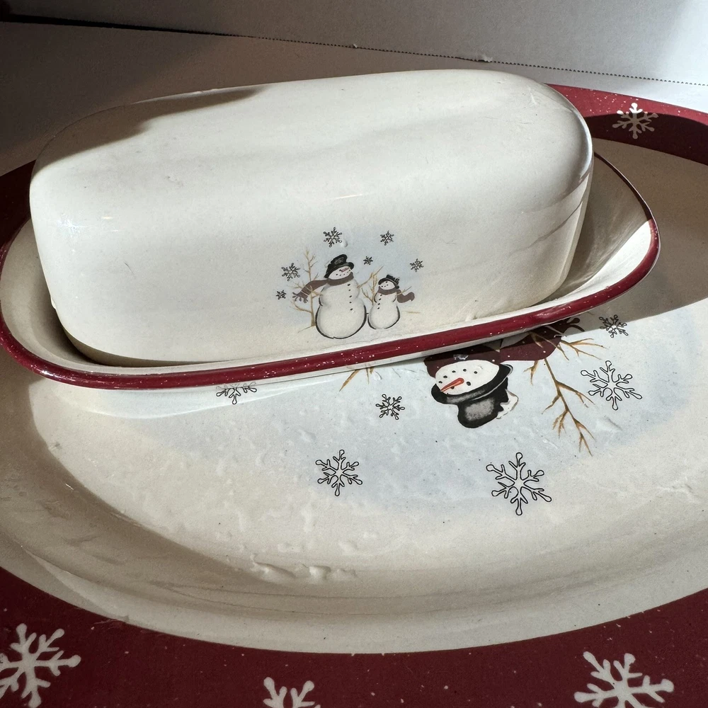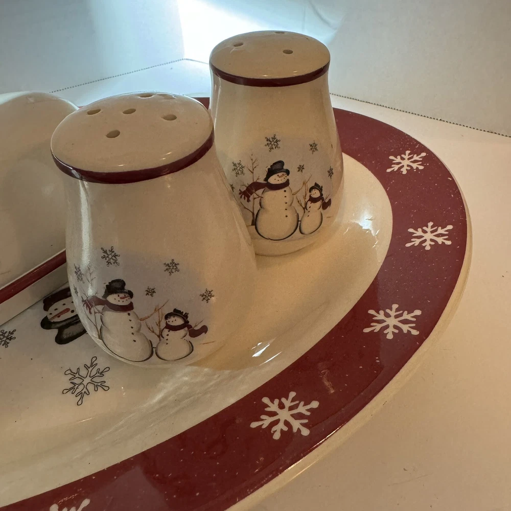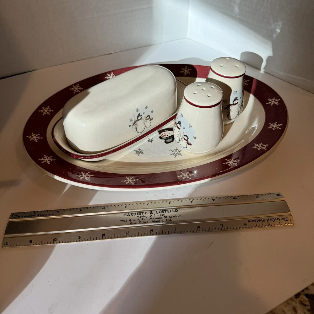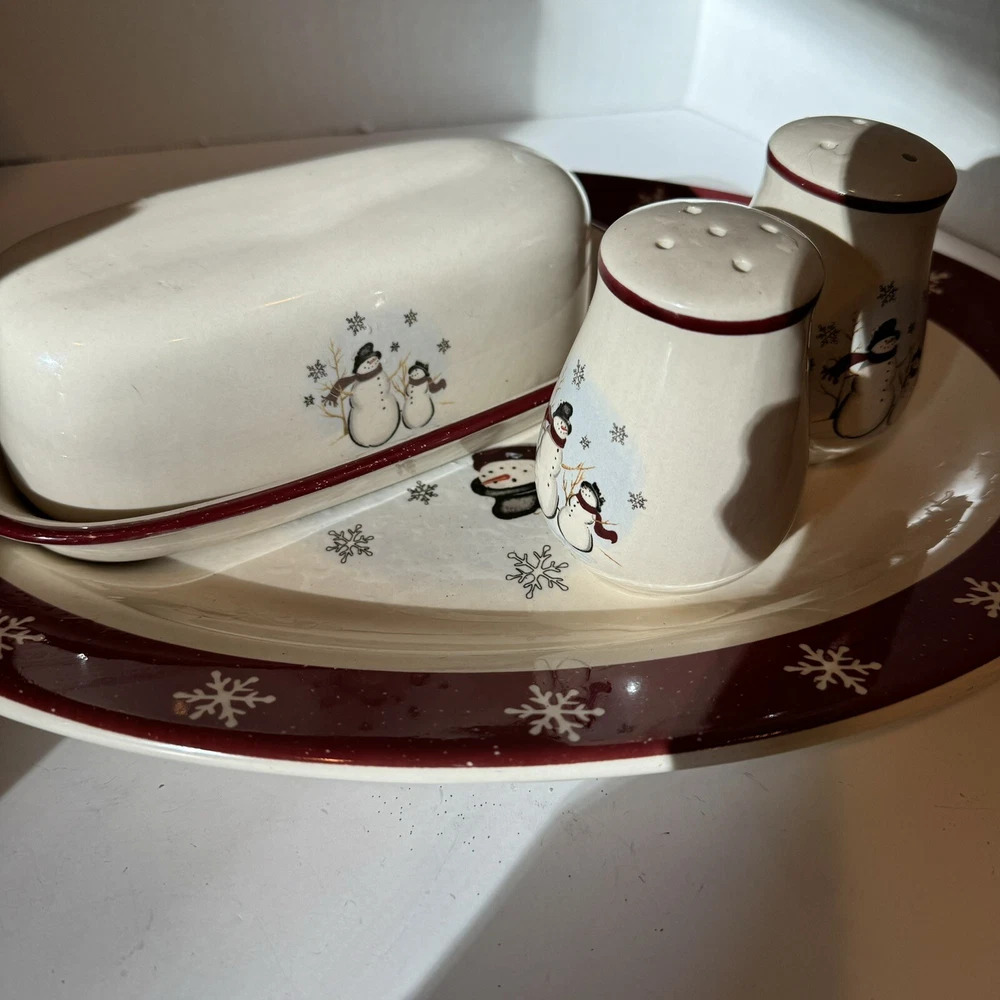 Title: Royal Seasons 5-Piece Snowman Christmas Set - 14” Platter, Salt & Pepper Shakers, Butter Dish Description: Bring festive cheer to your holiday table with this charming Royal Seasons snowman-themed set! This five-piece collection includes a 14-inch platter, salt and pepper shakers, and a butter dish, all adorned with delightful snowman and snowflake designs on a red and white background. Perfect for holiday dinners and gatherings, this set is a must-have for creating a warm, seasonal atmosphere. Condition: Excellent, with no chips or cracks. Photos show the actual items you’ll receive, so please examine them closely for details on condition and design. I ship within 24 hours of purchase, except on weekends and holidays. I also offer combined shipping, so be sure to check out my other listings! Follow my store, VintageWowzers, for daily updates as I add more vintage treasures. Keywords: Royal Seasons snowman set, Christmas dinnerware, holiday platter, vintage holiday decor, seasonal tableware, snowman butter dish, salt and pepper shakers, festive serveware, snowflake platter, holiday kitchen decor