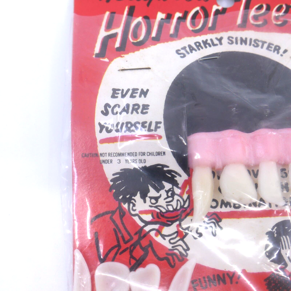1 pair of vintage Halloween Horror Teeth These are unused. Dice in 2nd picture for size PERFECT for your vintage halloween display- how great are those vintage graphics!?!