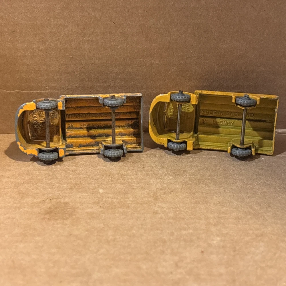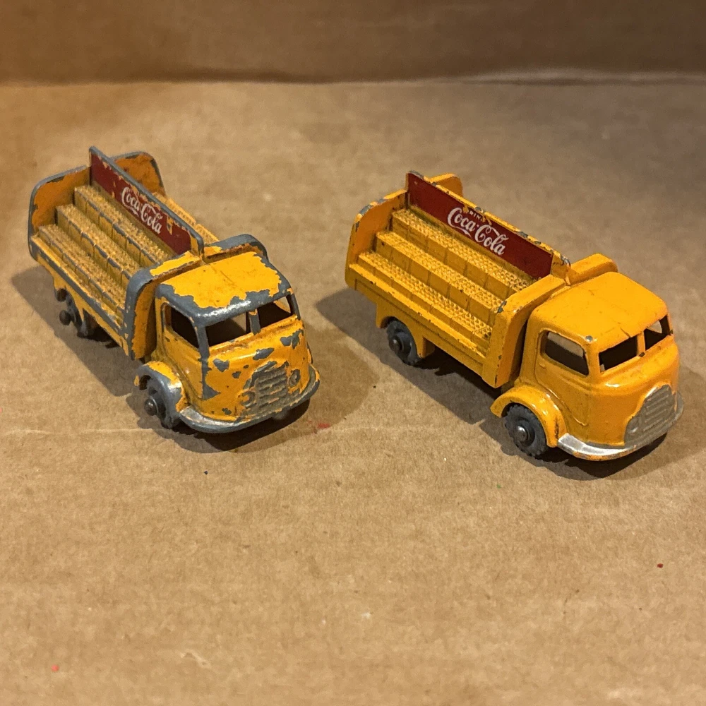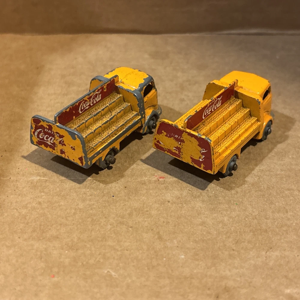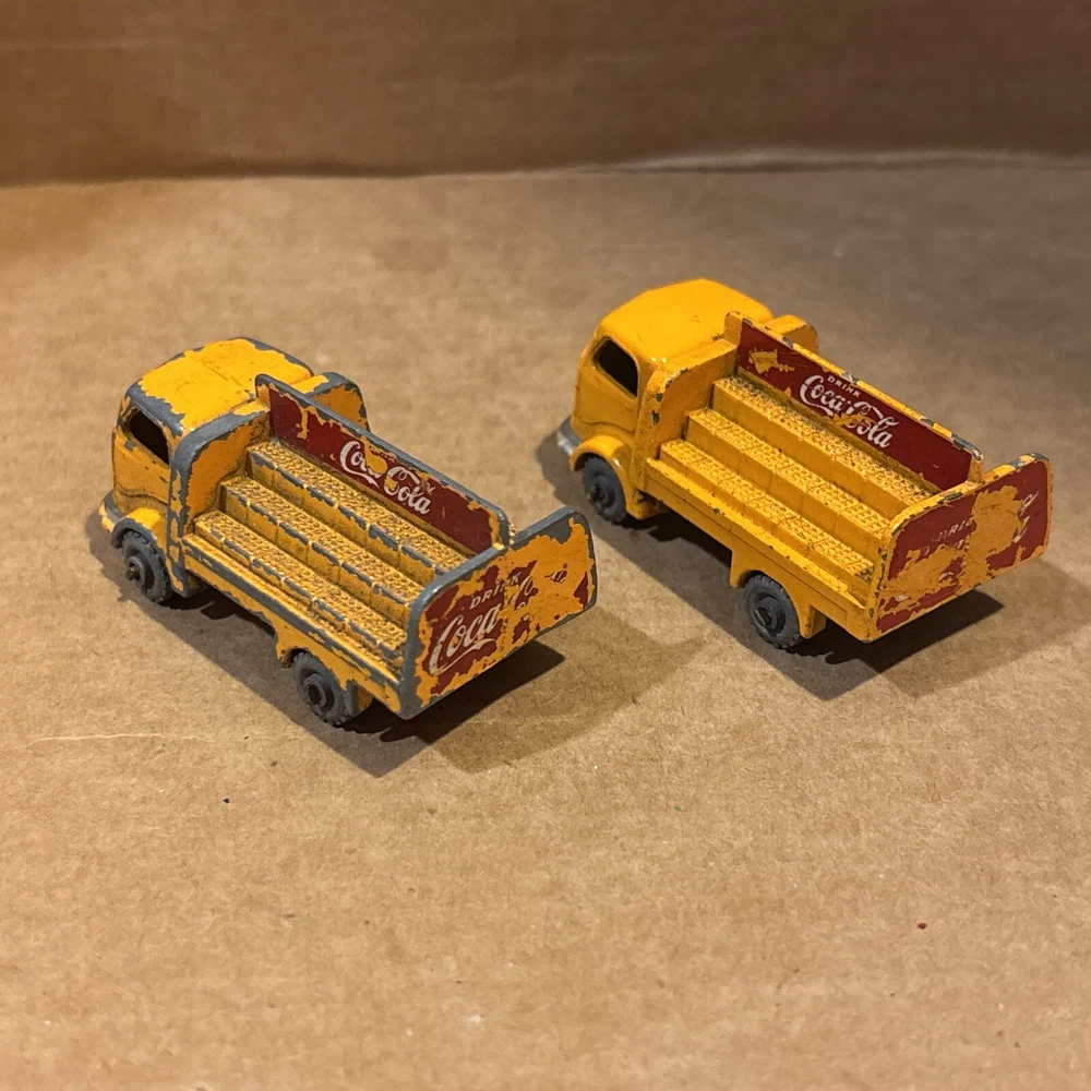 Vintage Pair of 1960s Matchbox Lesney No 37 Karrier Bantam 2 Ton Lorry Coca Cola Made England - see photos for wear and tear - grey wheels - ships usps ground advantage.