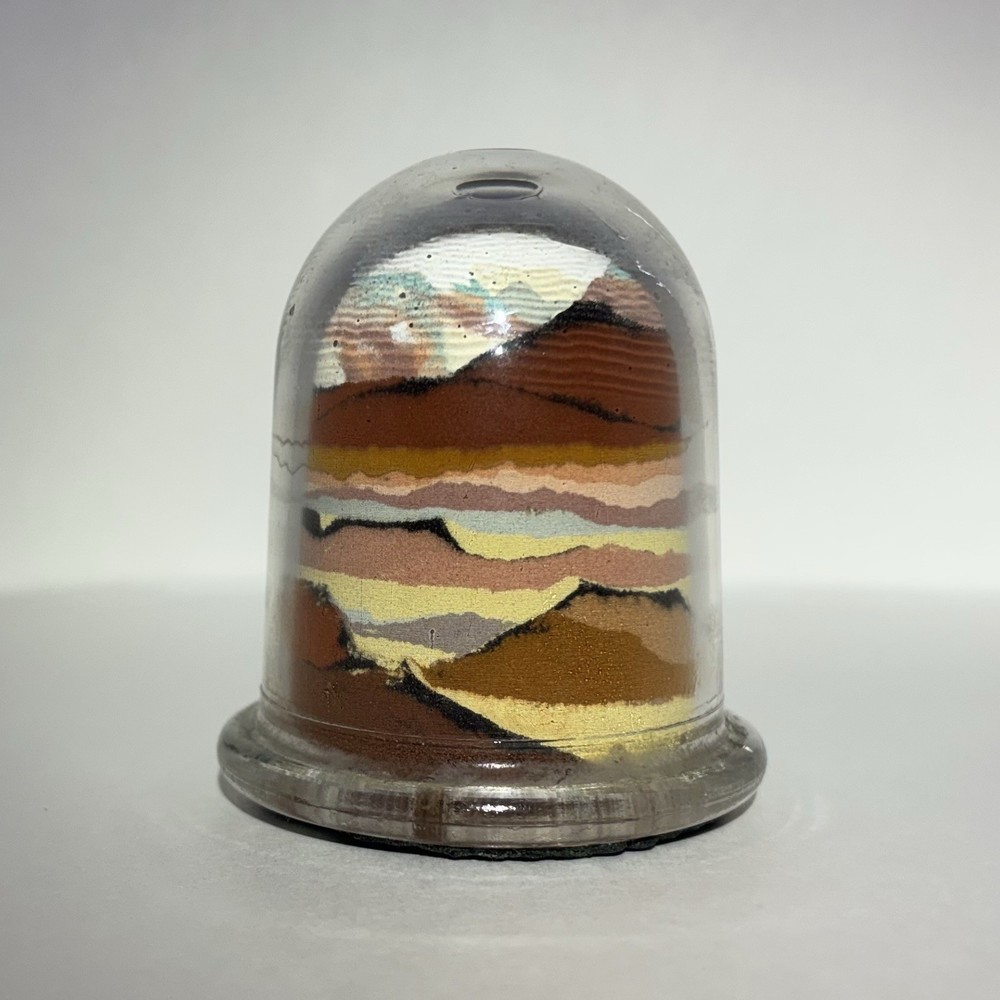 Add a pop of nostalgic Southwest charm to your shelf or collection with this vintage 1970s miniature sand art sculpture. Housed in a clear Lucite dome, this 2-inch tall piece features beautifully layered colored sands that form a desert landscape scene—complete with mesas, canyons, and sunset tones. ✅ Handmade vintage piece ✅ Dome-shaped Lucite container with green felt base ✅ Likely American Southwest souvenir ✅ Great for collectors of vintage kitsch, miniatures, or roadside Americana Condition: Excellent vintage condition with no cracks or leaks. Felt base shows age-appropriate wear. Ships safely with care. Message with questions or bundle requests!