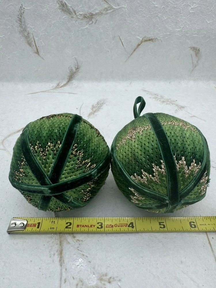 π Add some vintage charm to your Christmas decorations with this lot of two handmade crocheted sweater ornaments. π These round balls have a 3-inch diameter and feature a knit sweater pattern with velvet ribbon accents. π The green and gold color combination adds a festive touch to any holiday display. π These ornaments are perfect for collectors or anyone looking for a unique and personalized holiday decoration. π They are vintage and handmade, making each one-of-a-kind. Whether you're adding them to your ornament collection or using them as a thoughtful gift, these crocheted sweater balls are sure to bring joy and warmth to any Christmas occasion. ππ Preowned vintage condition. NOTE: one has minor discoloration/stain. SOLD AS IS π Please view photos for closer inspection and more details. Thanks for shopping π