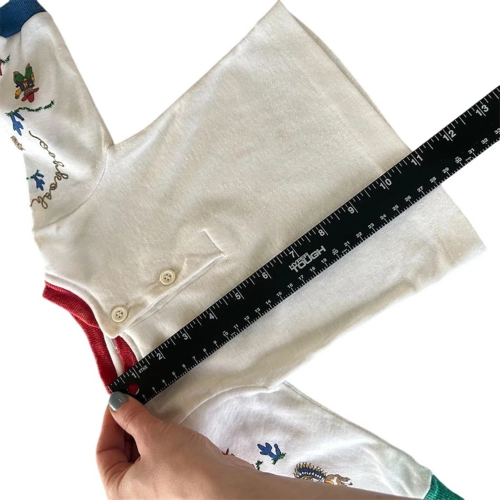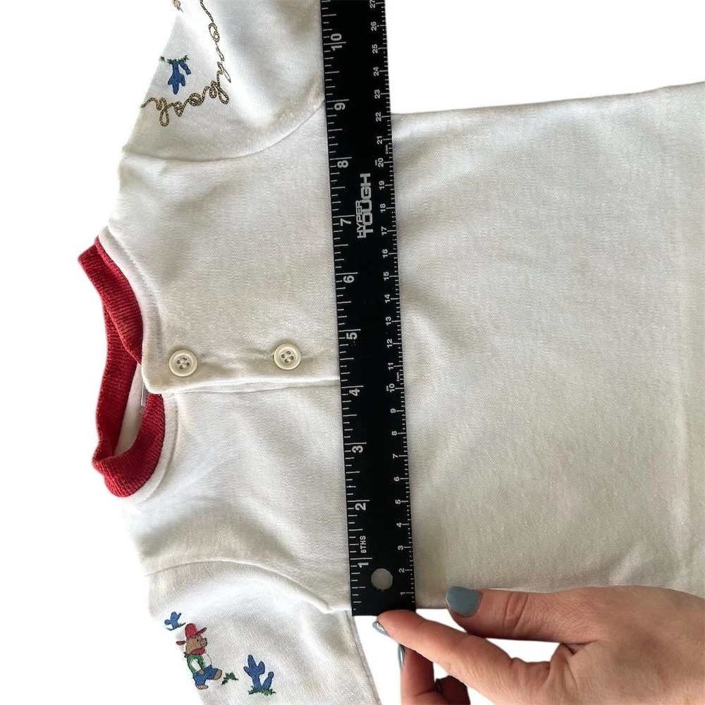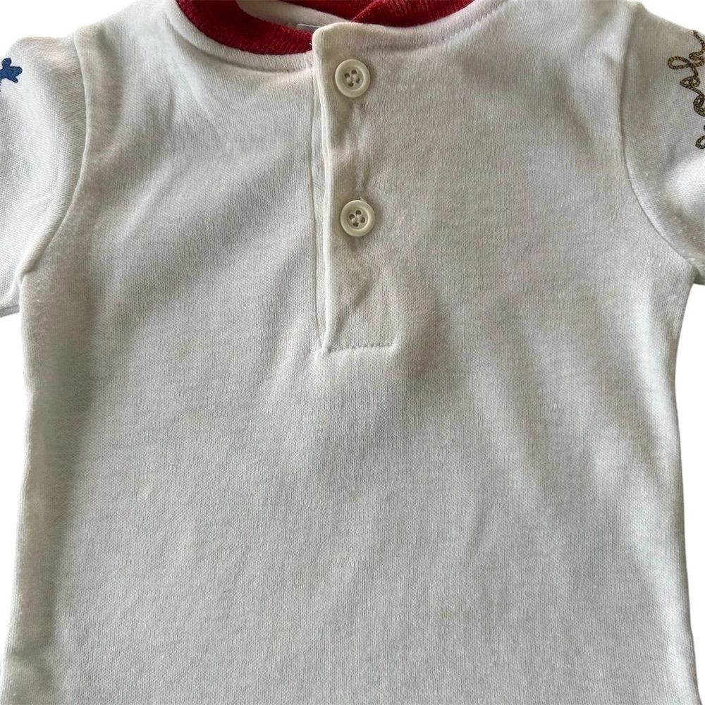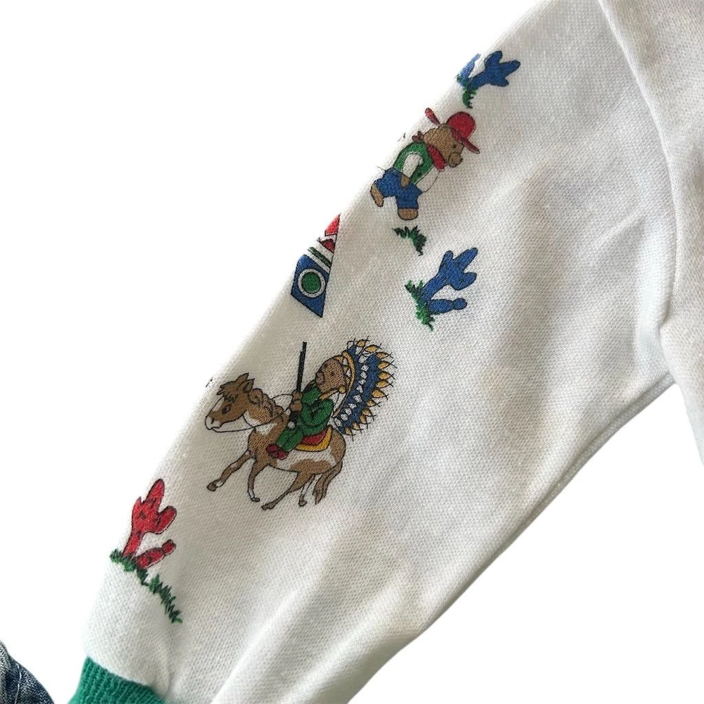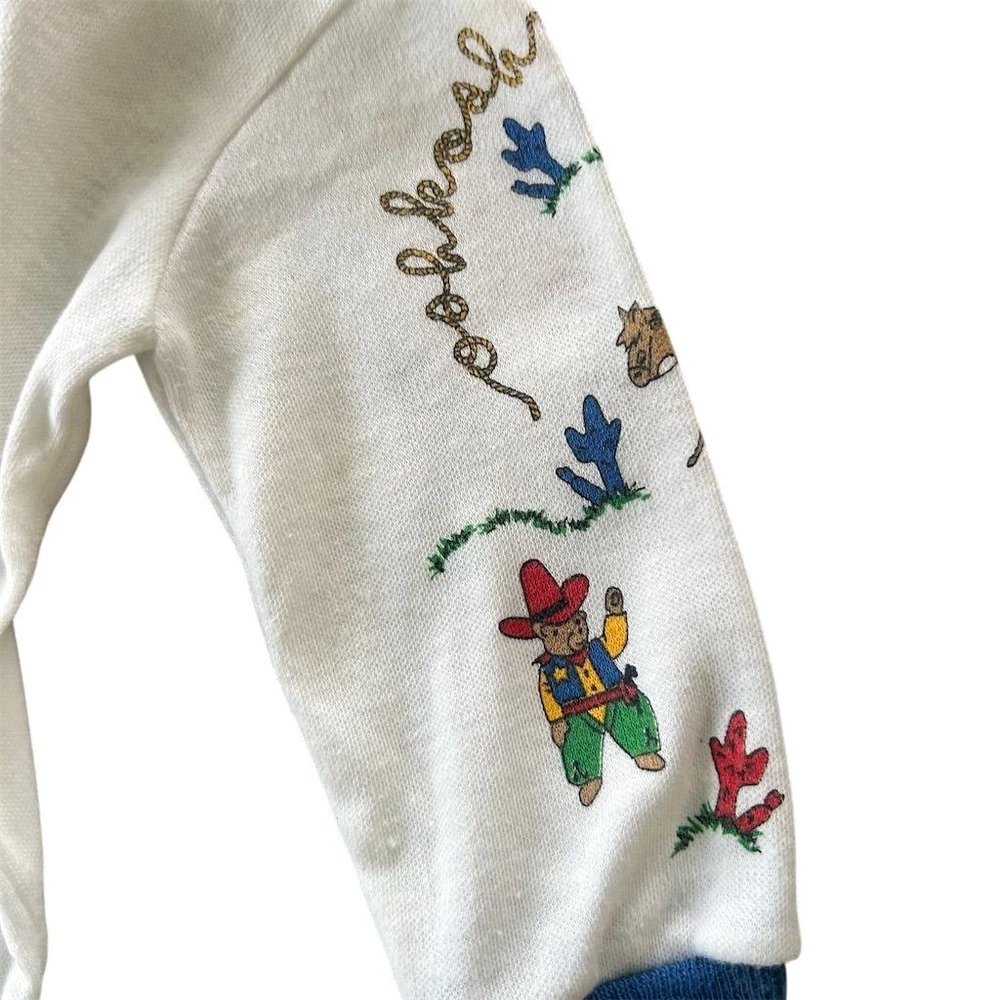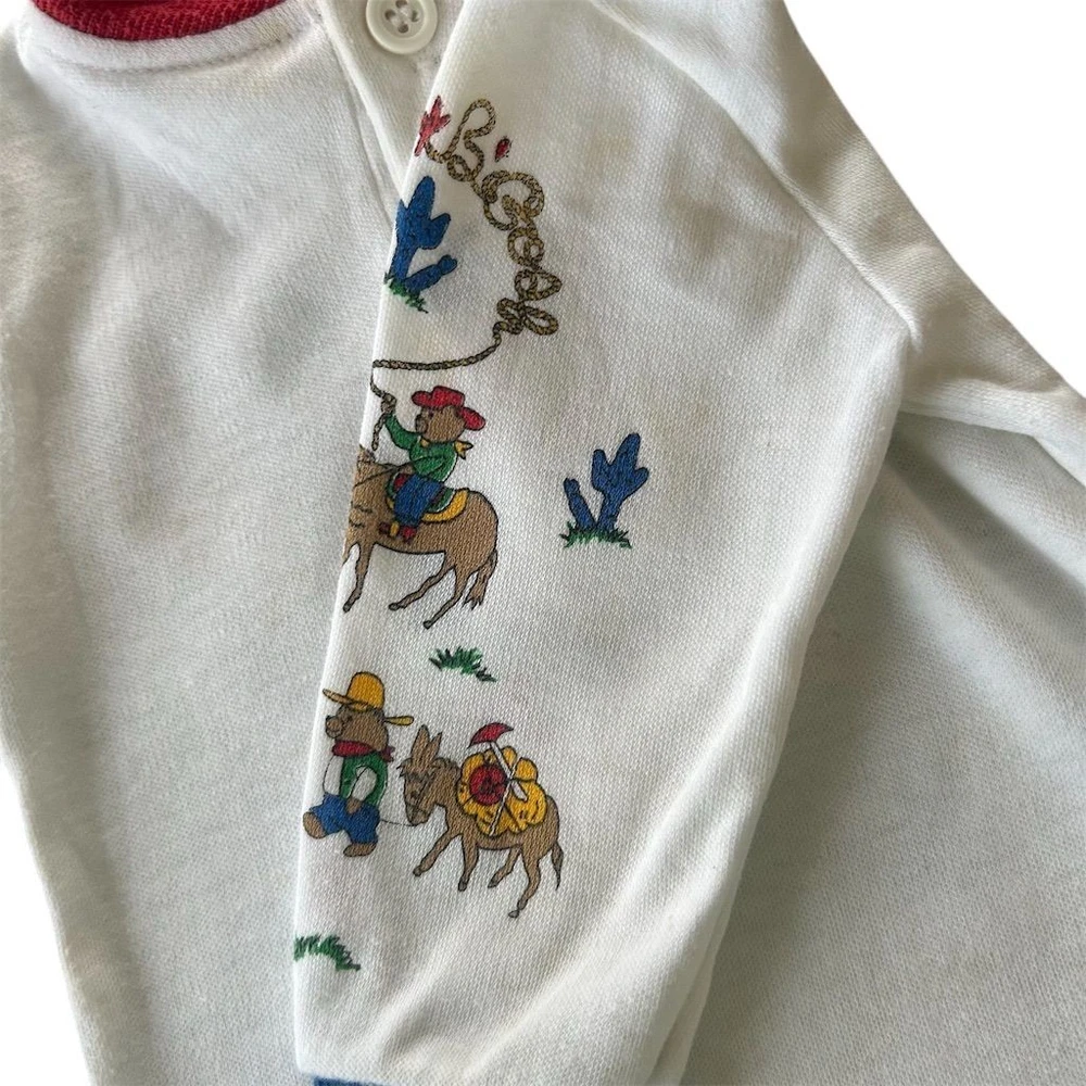This vintage OshKosh B’Gosh baby Western cowboy outfit is a nostalgic 2-piece set featuring long sleeve with overalls with a square neckline and snap closure. The overall style and theme of the outfit is perfect for a young boy who loves the Wild West. Please note items are both vintage but top is older. Sizes are both different on top and overalls but measure for graphs on child’s size for 6 months. Please review photos. Wear noted some fading present. Few stains on top.