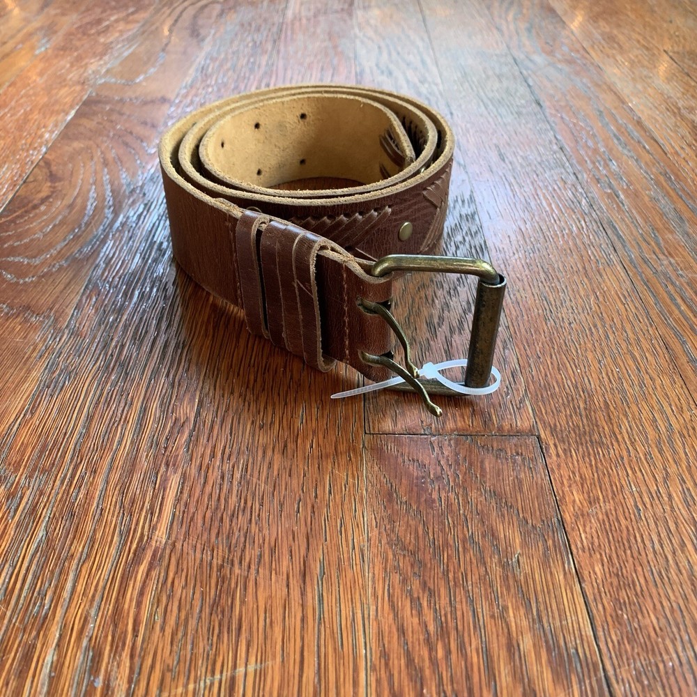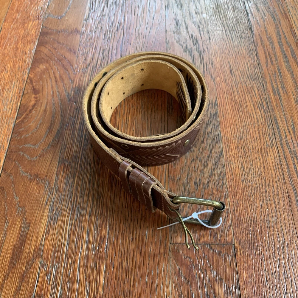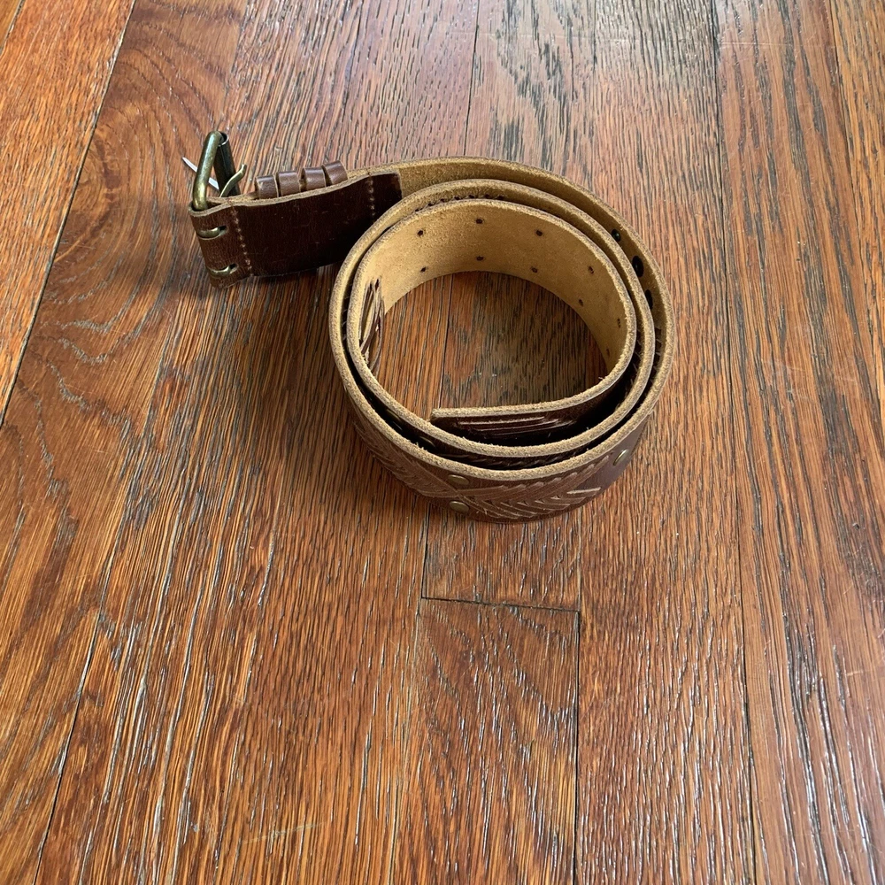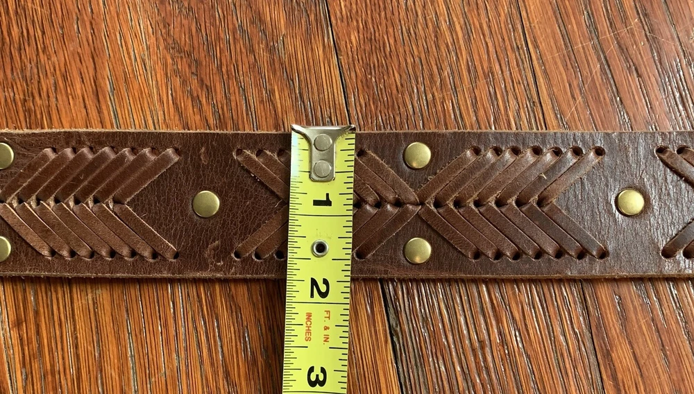 This vintage Betsey Johnson belt from the 90s is made of genuine brown leather with brass hardware. The belt features embellishments such as studs, giving it a boho style. It is a medium-sized belt with an adjustable buckle, making it suitable for regular-sized women. This Y2K studded belt adds a touch of retro and edgy flair to any outfit, perfect for those looking for a unique accessory with a vintage vibe. In EXCELLENT CONDITION!