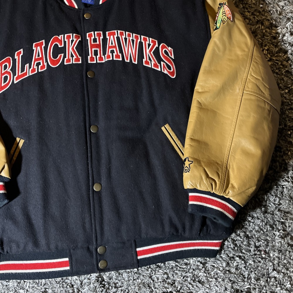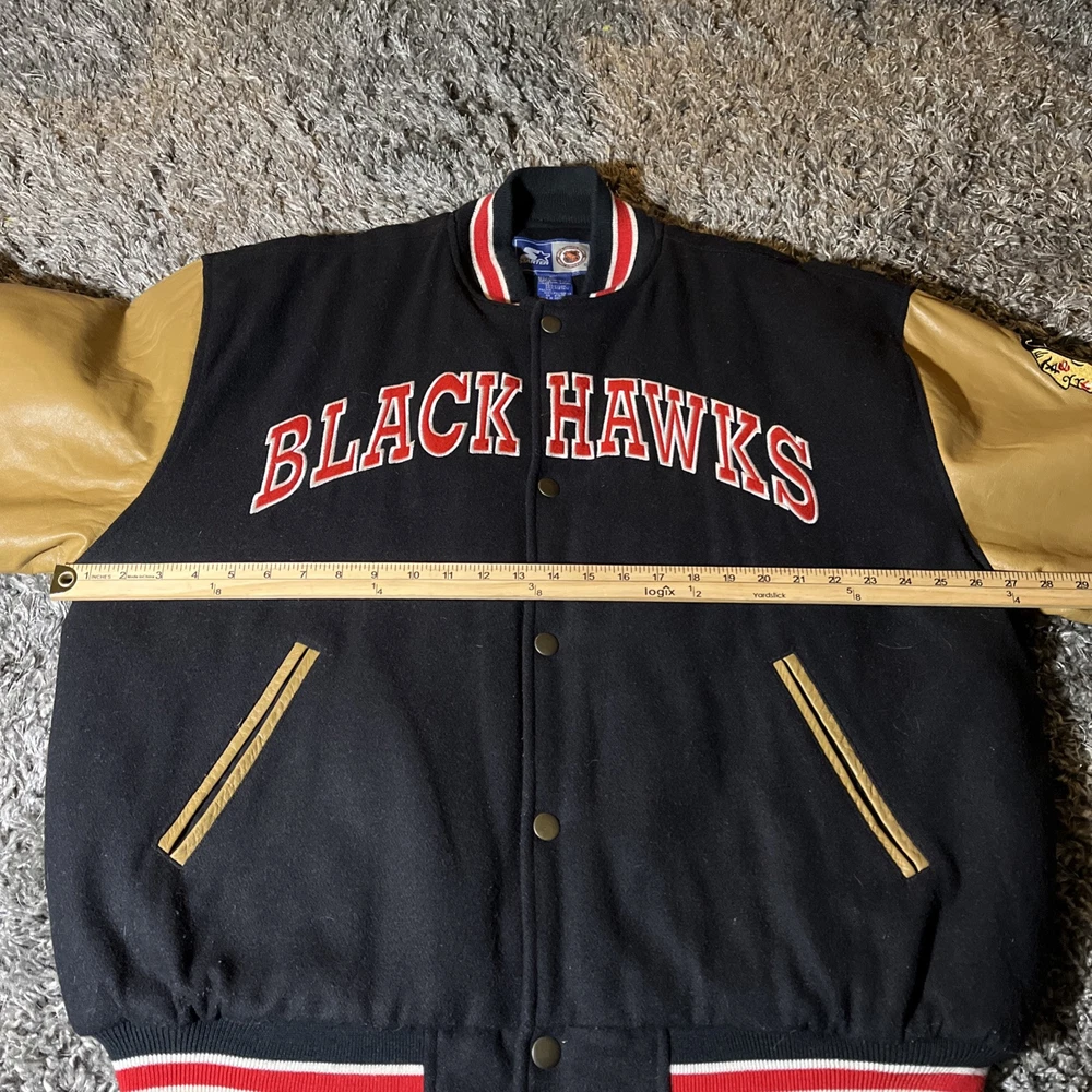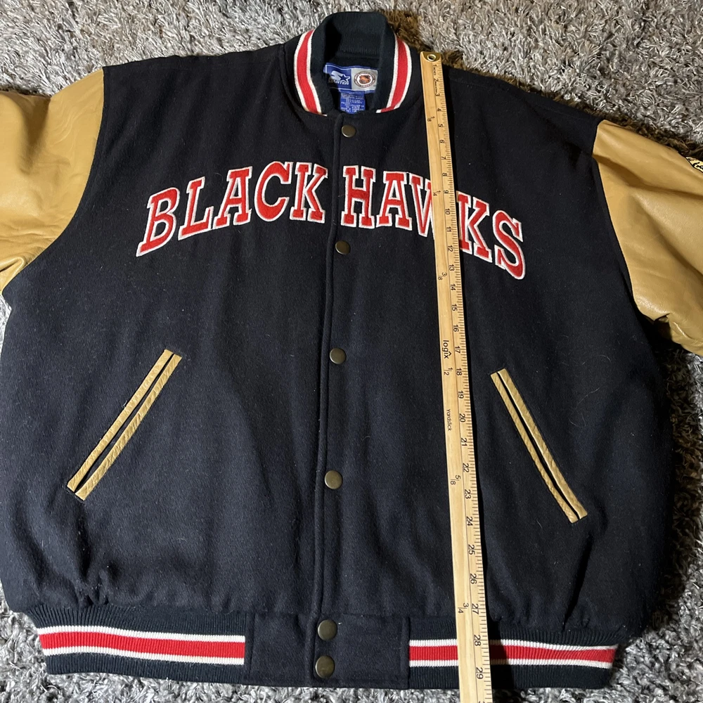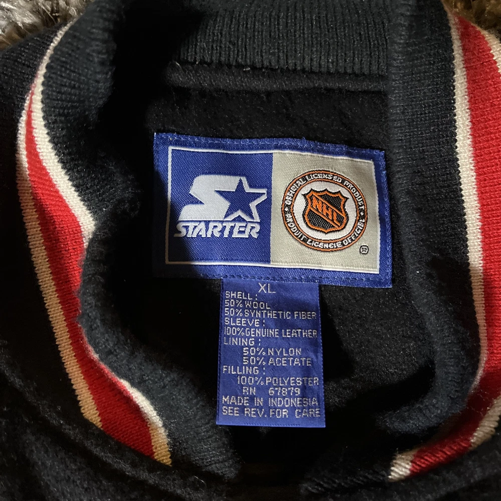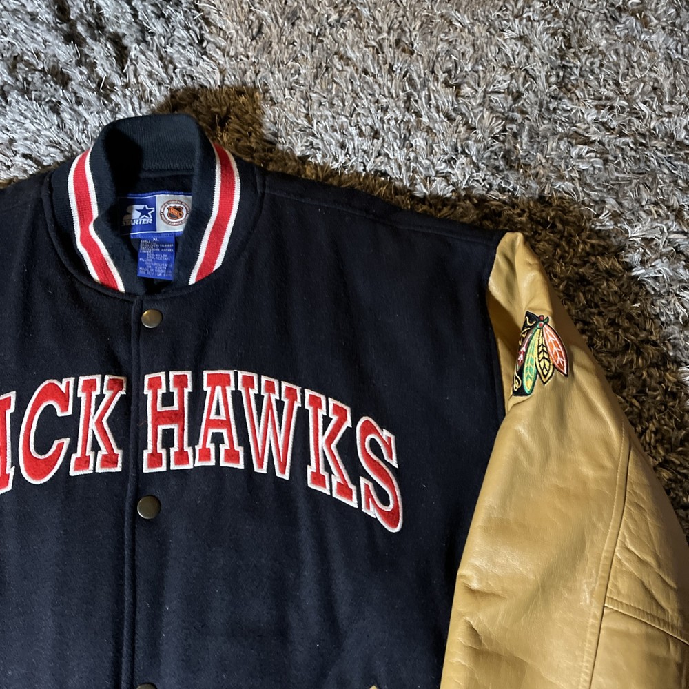 This is a vintage Chicago Blackhawks Starter Letterman Jacket in size XL for men, featuring leather sleeves. The jacket is officially licensed by the National Hockey League (NHL) and displays the team's branding prominently. Made in Indonesia, this multi-color jacket is a fan favorite for hockey enthusiasts wanting to show their support for the Chicago Blackhawks in style. The jacket is in excellent used condition, perfect for any fan looking to add a retro touch to their game day attire. Seller owned from original- worn only a few times, stored and kept clean over the years. Excellent vintage jacket/coat- purchased in the 90’s.