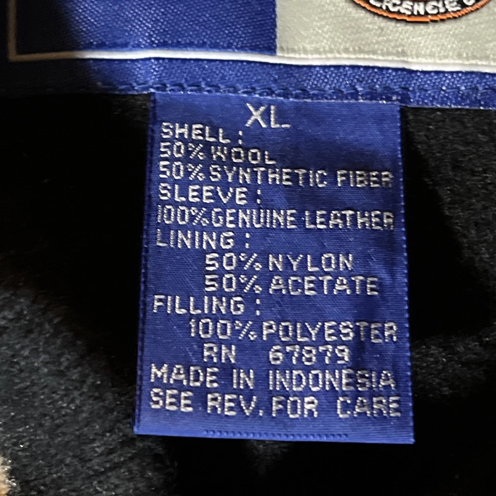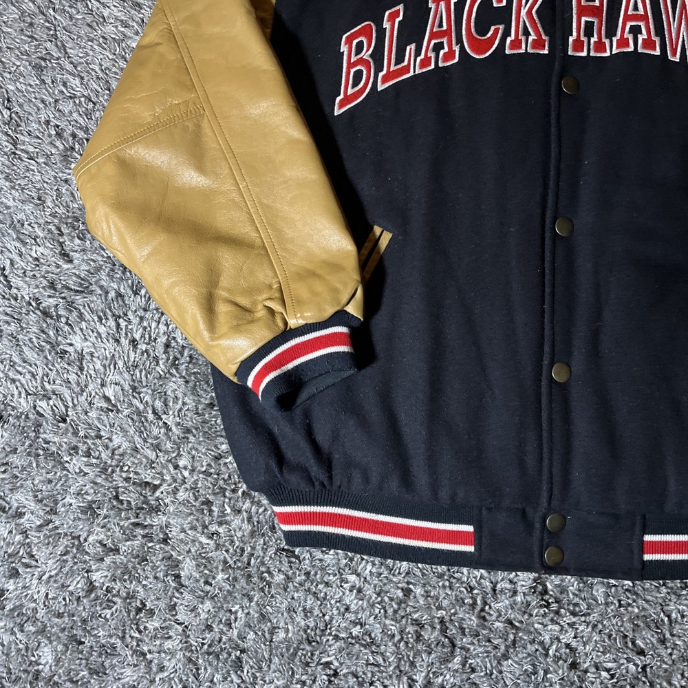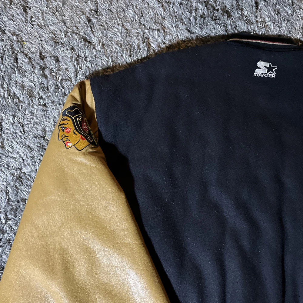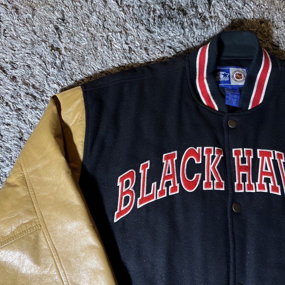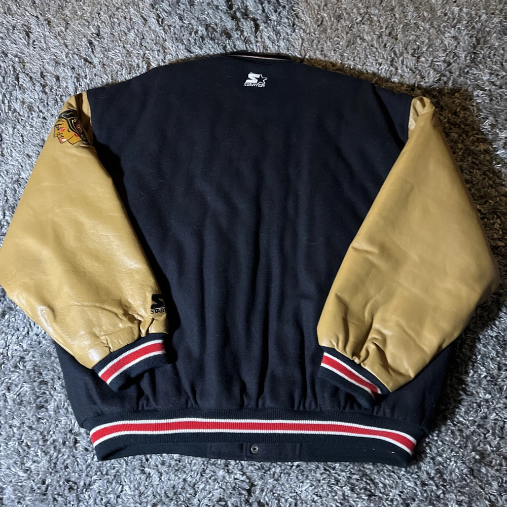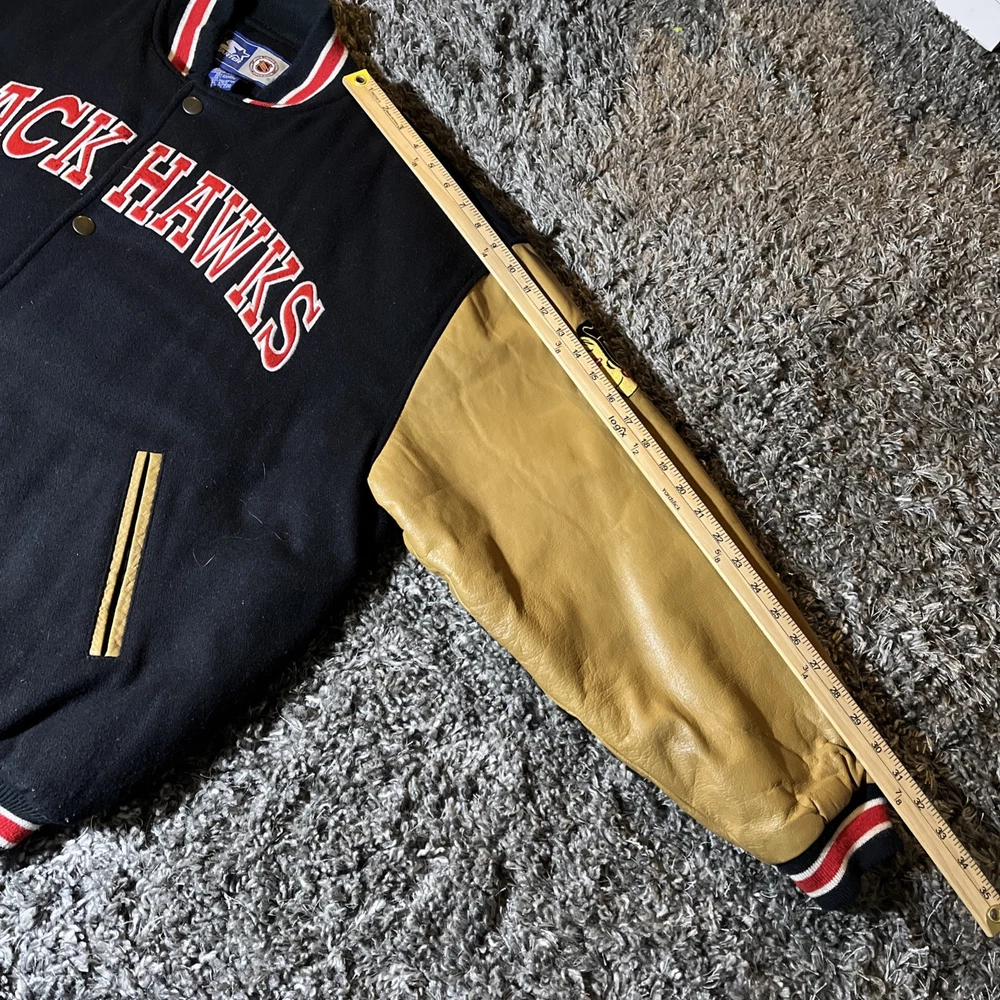 This is a vintage Chicago Blackhawks Starter Letterman Jacket in size XL for men, featuring leather sleeves. The jacket is officially licensed by the National Hockey League (NHL) and displays the team's branding prominently. Made in Indonesia, this multi-color jacket is a fan favorite for hockey enthusiasts wanting to show their support for the Chicago Blackhawks in style. The jacket is in excellent used condition, perfect for any fan looking to add a retro touch to their game day attire. Seller owned from original- worn only a few times, stored and kept clean over the years. Excellent vintage jacket/coat- purchased in the 90’s.