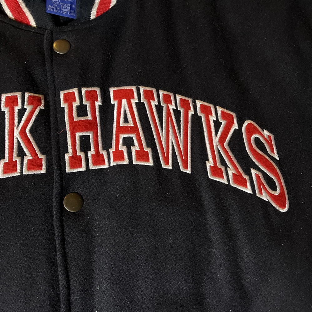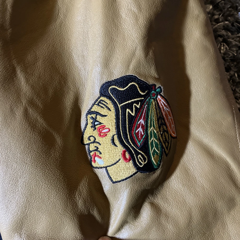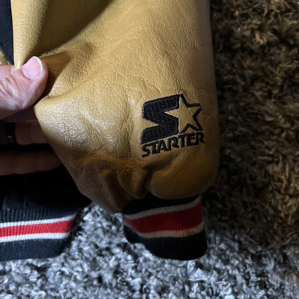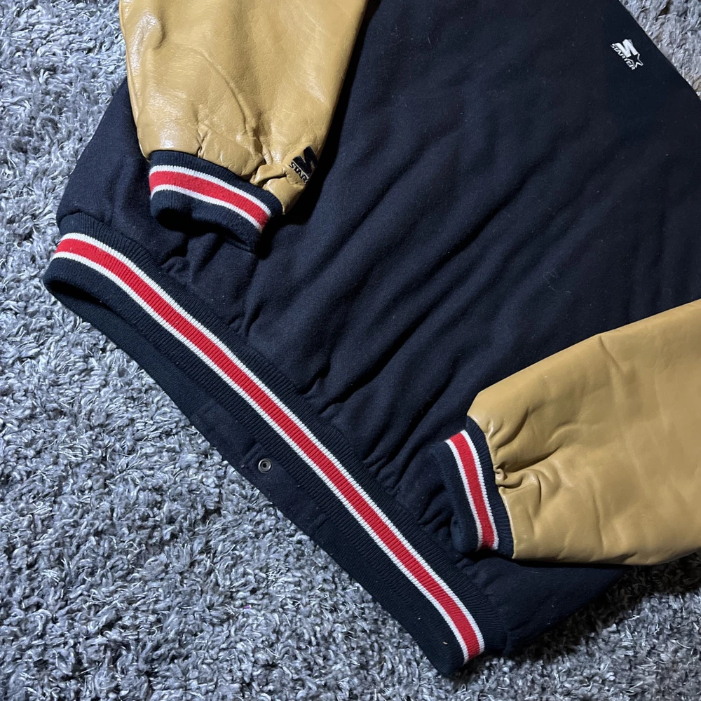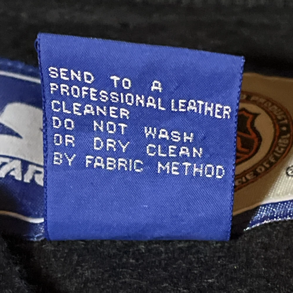 This is a vintage Chicago Blackhawks Starter Letterman Jacket in size XL for men, featuring leather sleeves. The jacket is officially licensed by the National Hockey League (NHL) and displays the team's branding prominently. Made in Indonesia, this multi-color jacket is a fan favorite for hockey enthusiasts wanting to show their support for the Chicago Blackhawks in style. The jacket is in excellent used condition, perfect for any fan looking to add a retro touch to their game day attire. Seller owned from original- worn only a few times, stored and kept clean over the years. Excellent vintage jacket/coat- purchased in the 90’s.