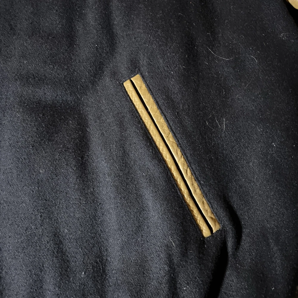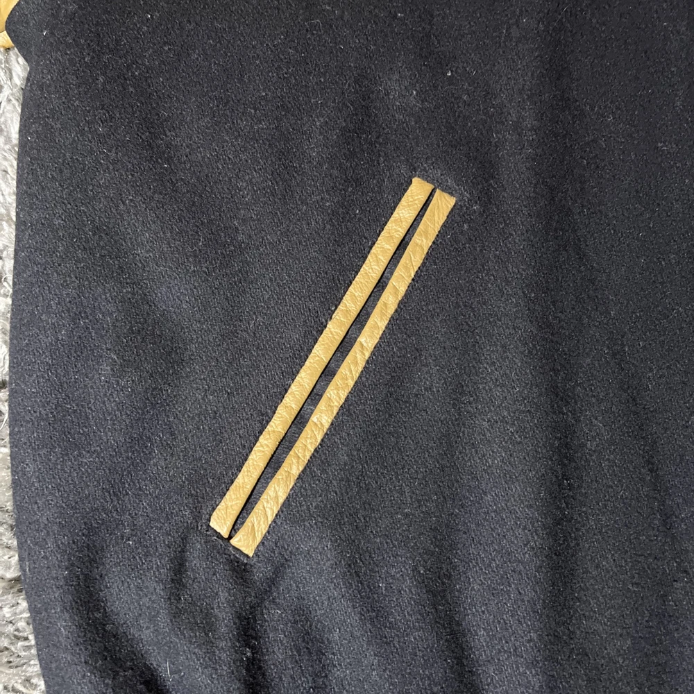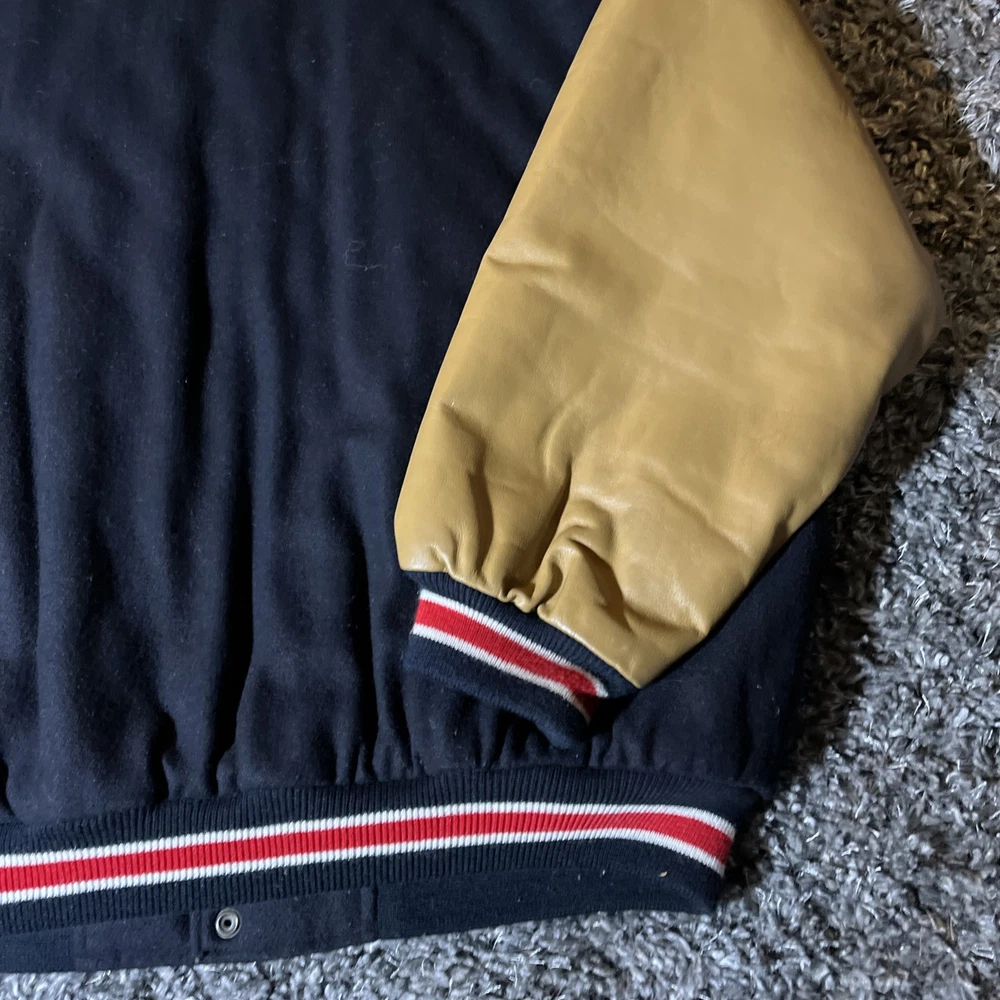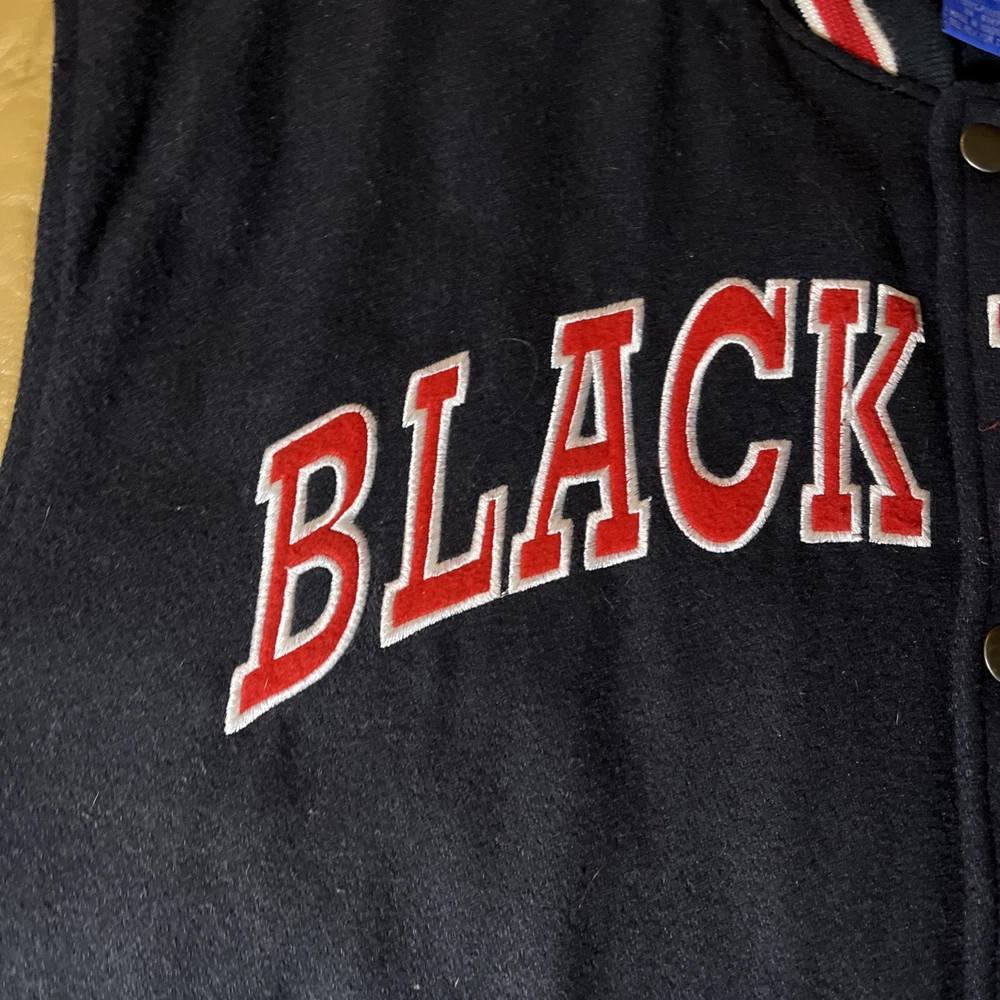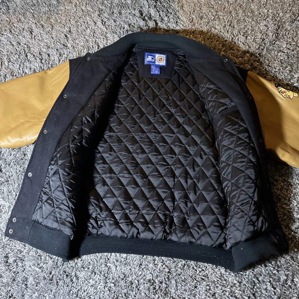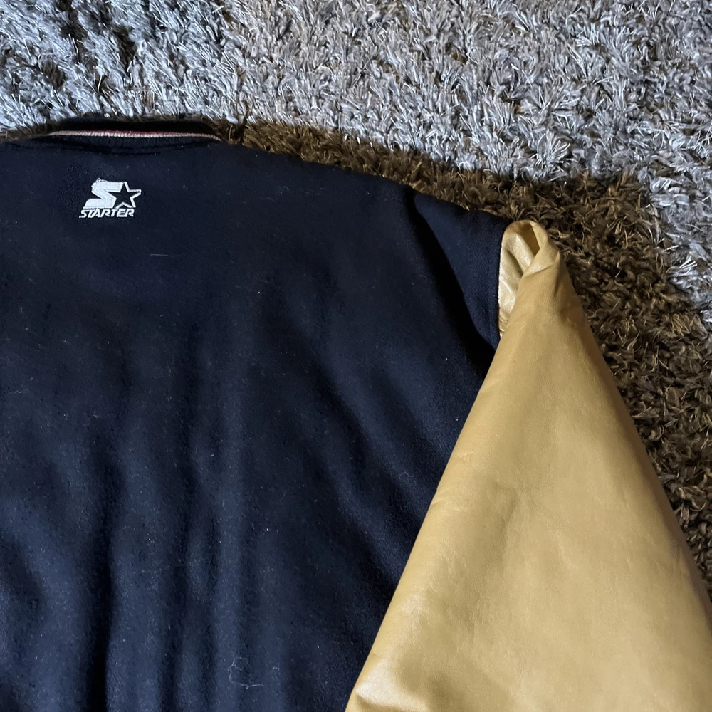 This is a vintage Chicago Blackhawks Starter Letterman Jacket in size XL for men, featuring leather sleeves. The jacket is officially licensed by the National Hockey League (NHL) and displays the team's branding prominently. Made in Indonesia, this multi-color jacket is a fan favorite for hockey enthusiasts wanting to show their support for the Chicago Blackhawks in style. The jacket is in excellent used condition, perfect for any fan looking to add a retro touch to their game day attire. Seller owned from original- worn only a few times, stored and kept clean over the years. Excellent vintage jacket/coat- purchased in the 90’s.