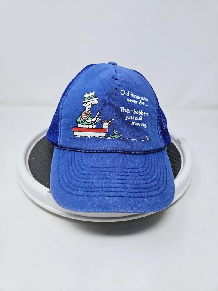 Department: Men Features: Adjustable, Mesh Back Size: Adjustable Occasion: Casual Color: Blue Style: Trucker Hat Brand: Designer Pro Theme: Funny, Fishing, boating hat, fishing hat, funny old hat, funny saying, longer poles, mens humor, mens humor hat, pick up line, raunchy mens hat, stiffer rods, trucker hat, two tone snapback hat Vintage: Yes