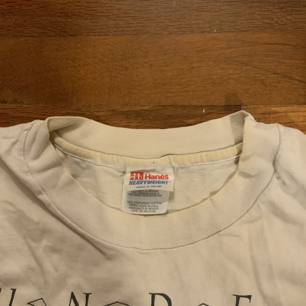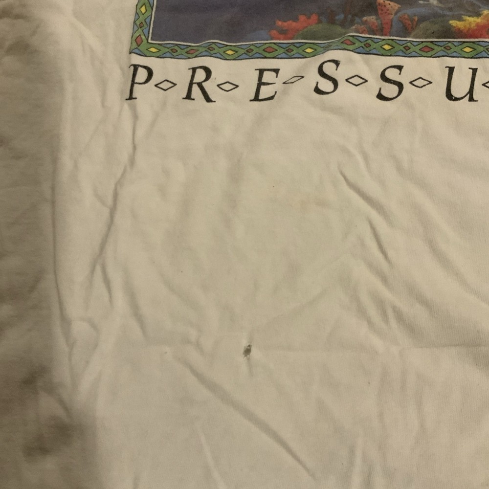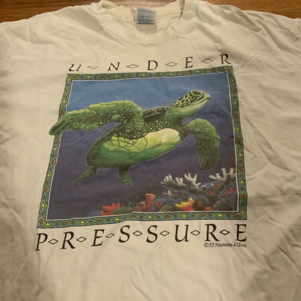 The product is a vintage 90s Human-I-Tees shirt for men in size XL. This white shirt features a graphic print of a sea turtle under pressure, with a crew neck and short sleeves. Made of cotton knit fabric, this single-stitch shirt is machine washable and has a regular fit. It also has a logo accent and is from the 90s, making it a unique and retro piece for any collection.