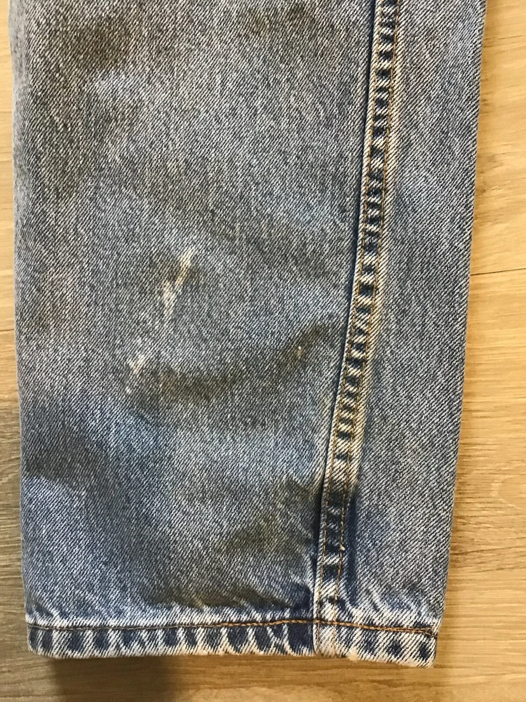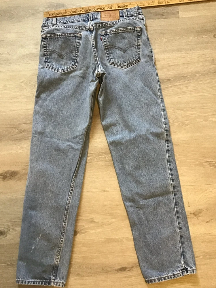 This vintage pair of Levi's 550 jeans features a classic design with 5-pocket styling, button accents, and a zip closure. The light wash denim is made in the USA and has a relaxed fit with a tapered leg, measuring 33 inches in inseam length and 34 inches in waist size. The jeans are in excellent condition and have not been personalized or distressed. The unique aspects of these jeans include their vintage status, solid pattern, and theme of USA. The garment care for these jeans is machine washable, and they have belt loops for suspenders or a belt. This product line is part of the Levi's 500 series, and the brand is well-known for its quality denim material. button shows plant 513 for mfg. sku 5 bin C2