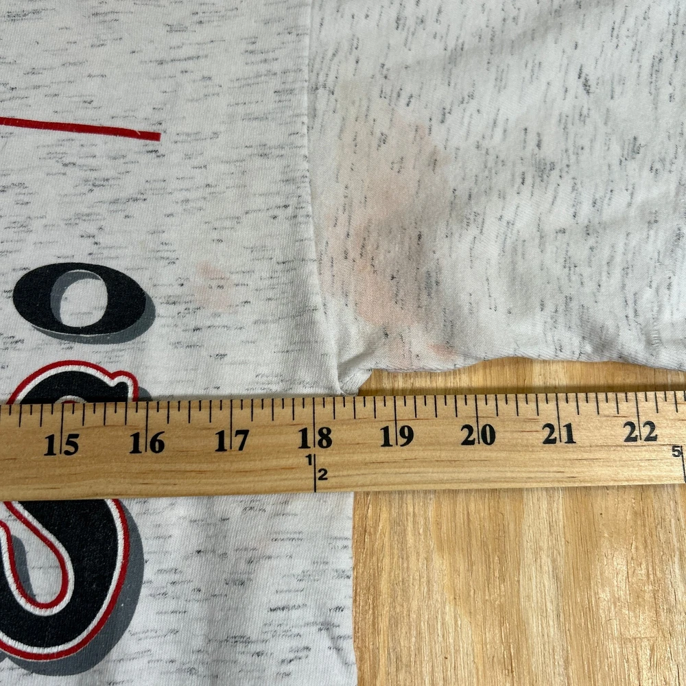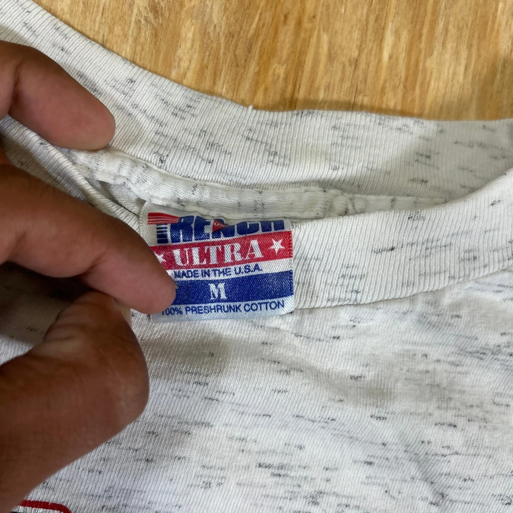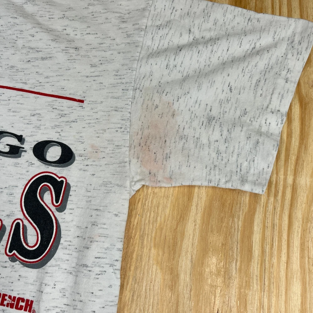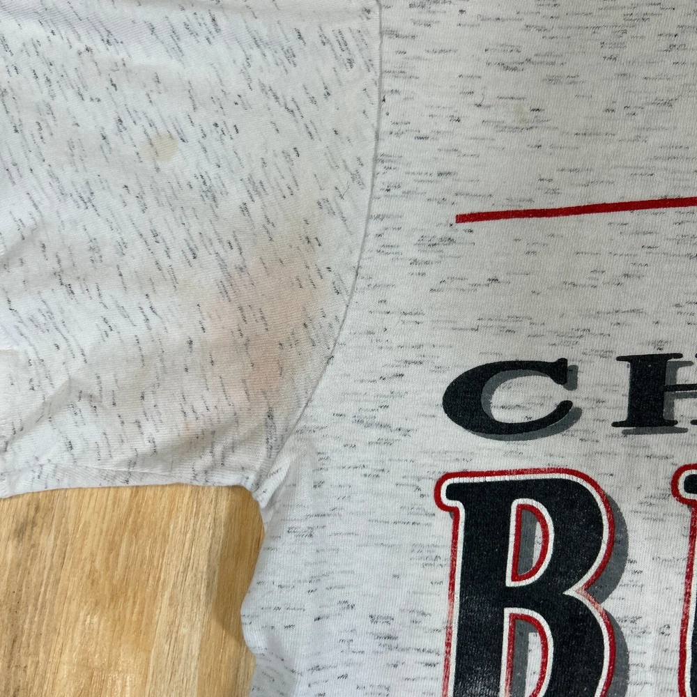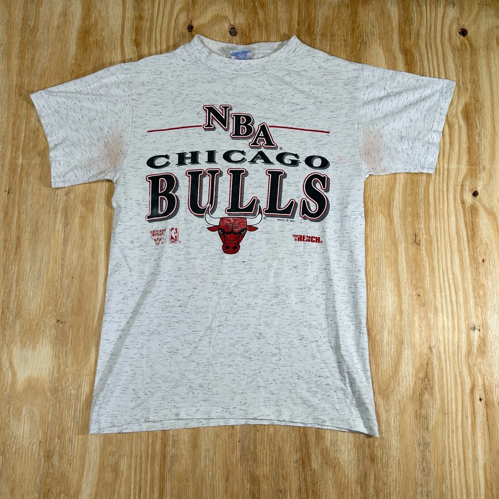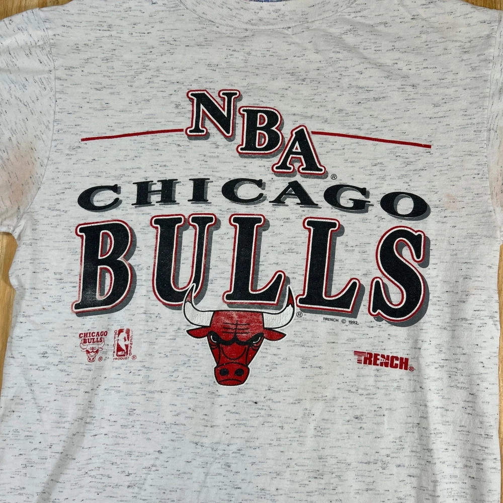 Show off your love for the Chicago Bulls with this vintage Trench NBA short sleeve crewneck T-shirt. This officially licensed shirt is perfect for any basketball fan and features the iconic Bulls logo in gray. Made in the United States, this shirt is available in size M and is perfect for men who want to show their support for the team during regular season games. Whether you're cheering on the Bulls from the stands or watching the game from home, this shirt is a must-have for any fan. It's made from high-quality materials and is designed to last. Don't miss out on this opportunity to show your love for the Chicago Bulls in style. SKU: N/A