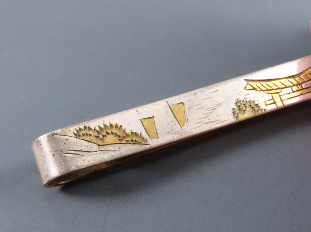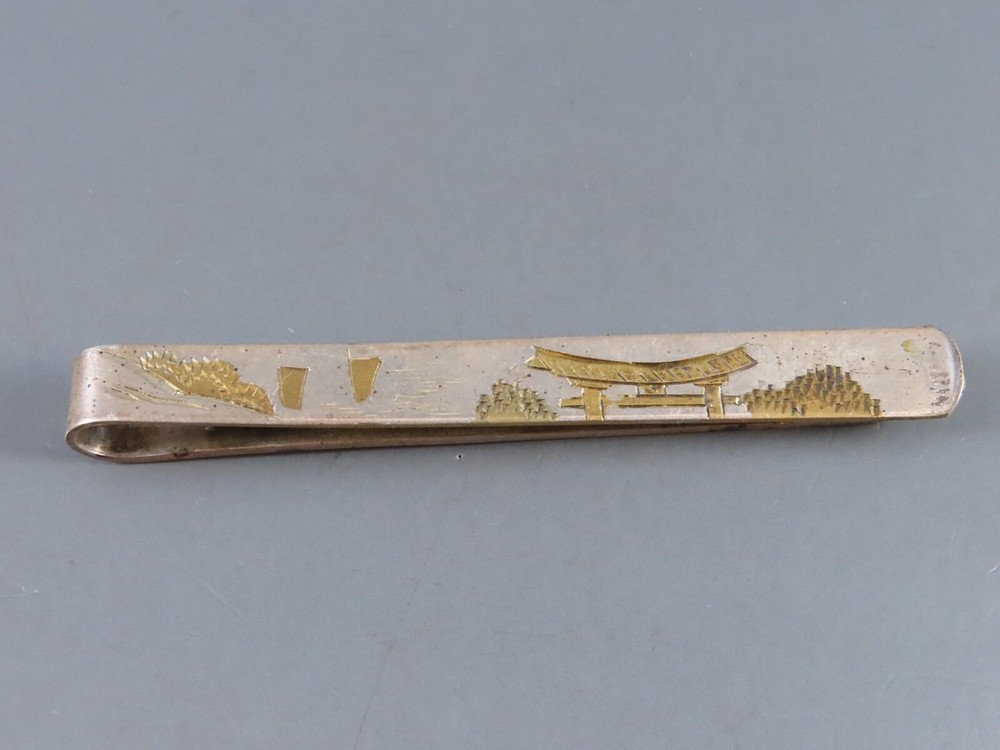 VTG 950 Silver Japanese Tie Bar with Gold Mount Fuji Pagoda Scene - Higher Than Sterling
