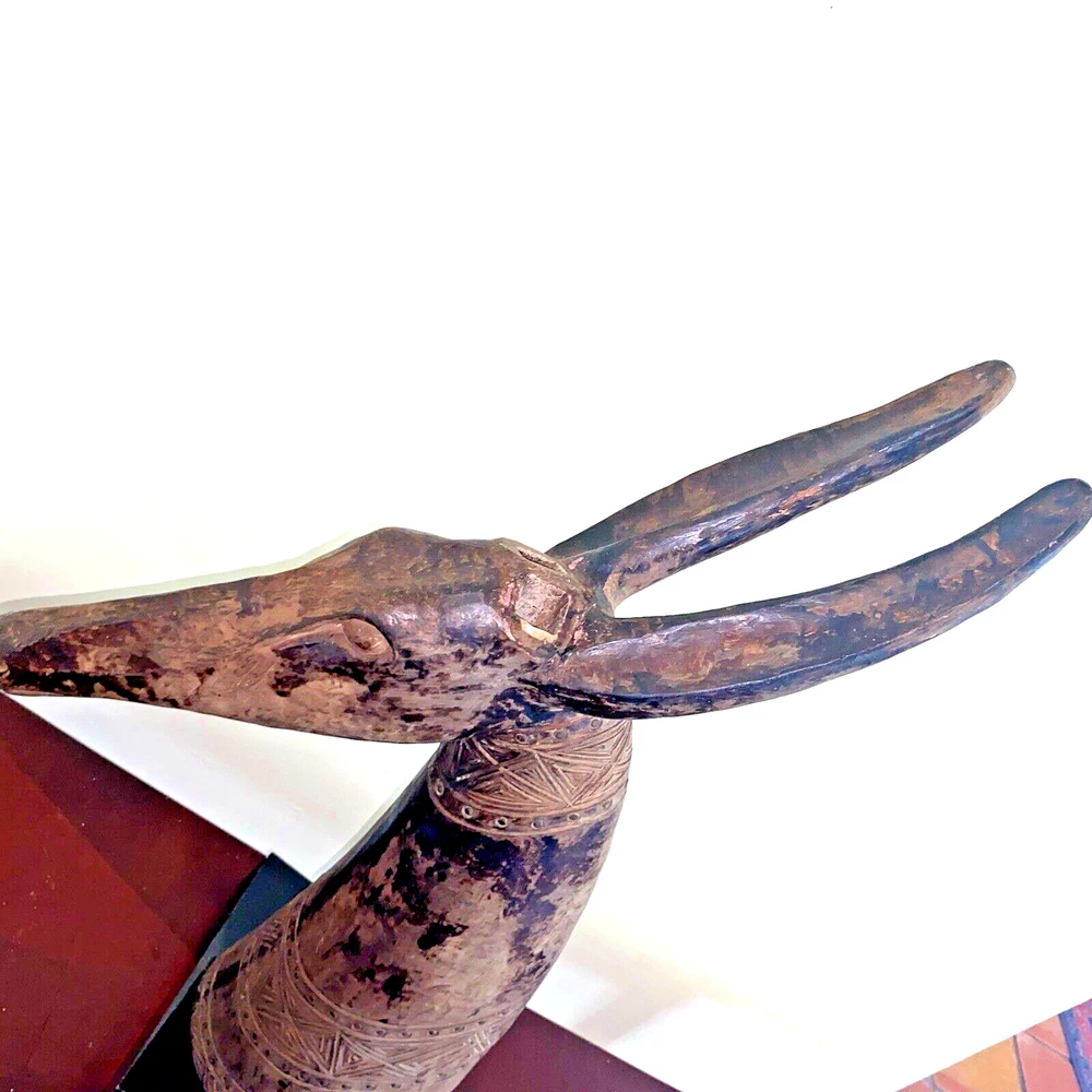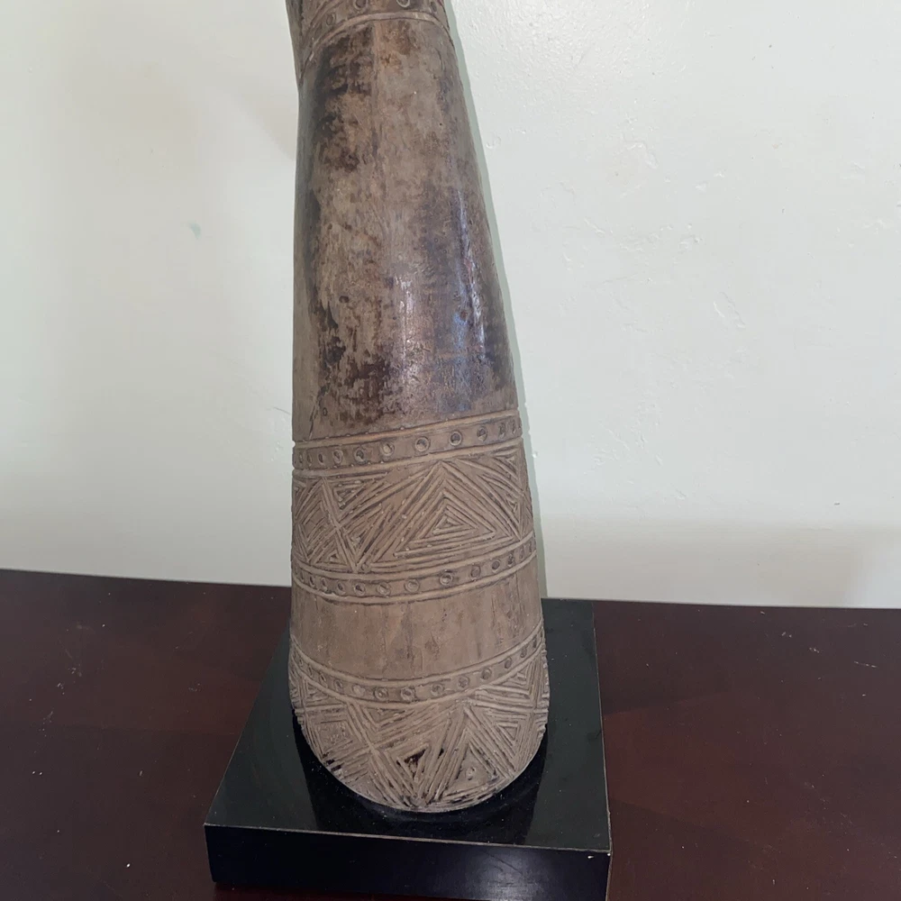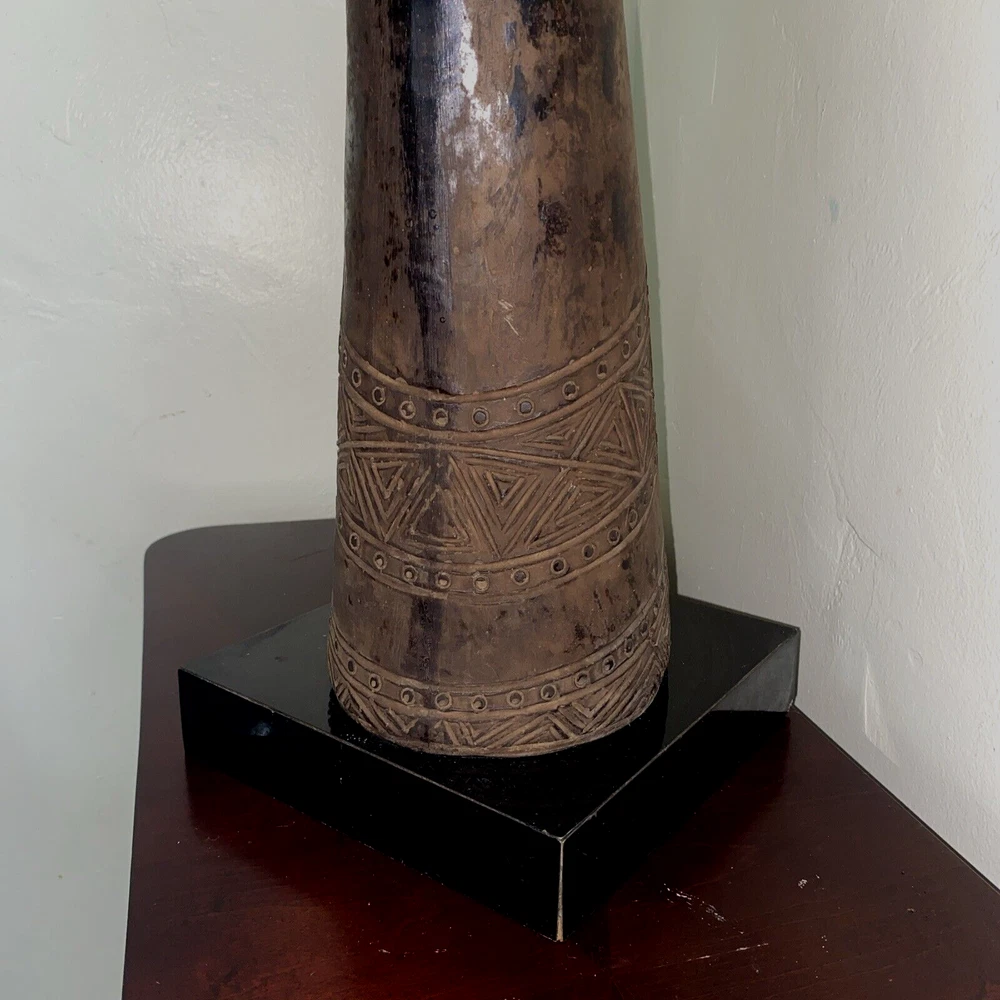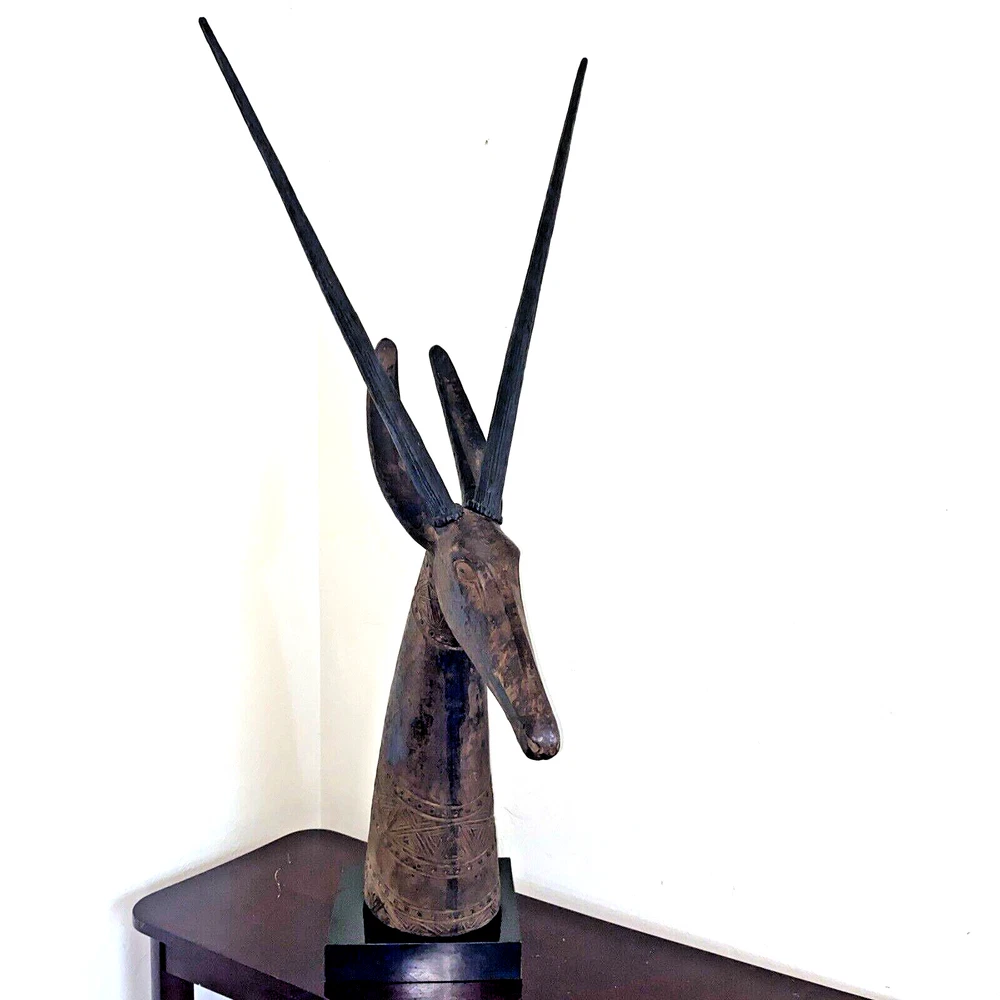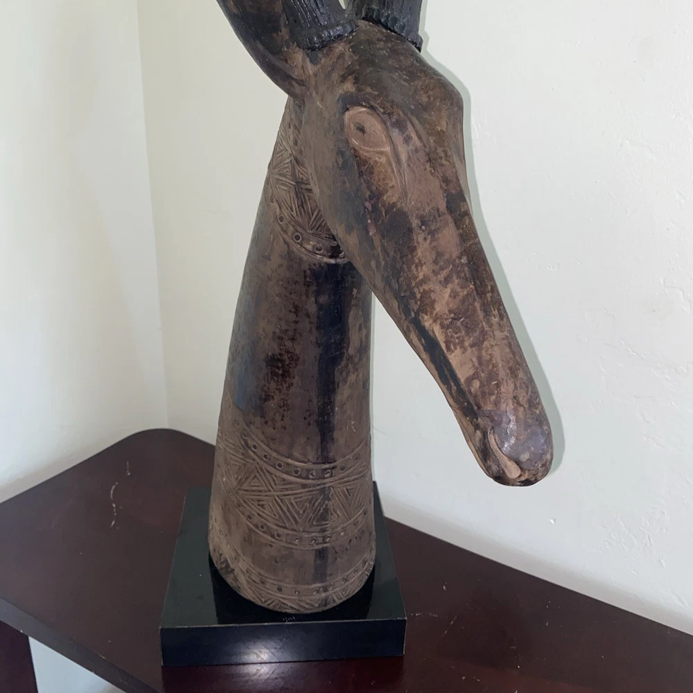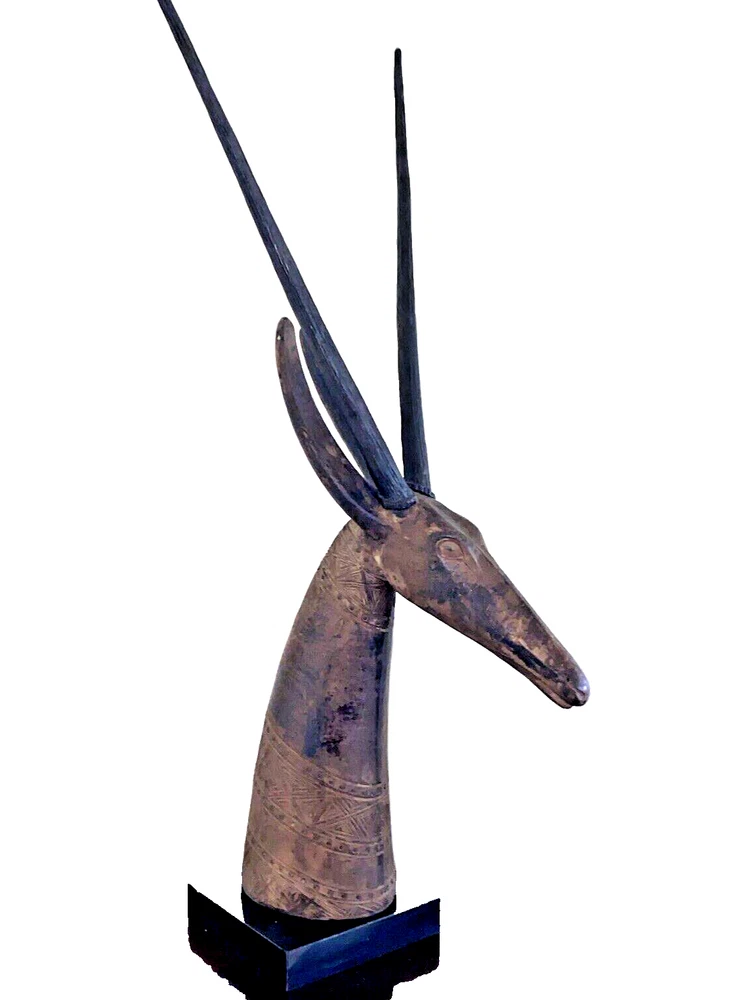 Magnificent mid-century style African Oryx Antelope ceramic Sculpture, with removable horns. According to my research, this beautiful sculpture is by Austin Productions Inc., made from cast ceramic, c. 1981. with black patina. Sits on a laminated box. Approximately 49 inches tall including the base and the horns. Base is 10 inches by 10 inches. Horns are removable. Luxury home decor that will grace a variety of rooms and decorating styles. Has only had one owner, is in good shape with some wear commensurate with age. Really beautiful, elegant and striking. Substantial item for shipping - if you prefer to pick up or to arrange own freight, that can certainly be arranged.