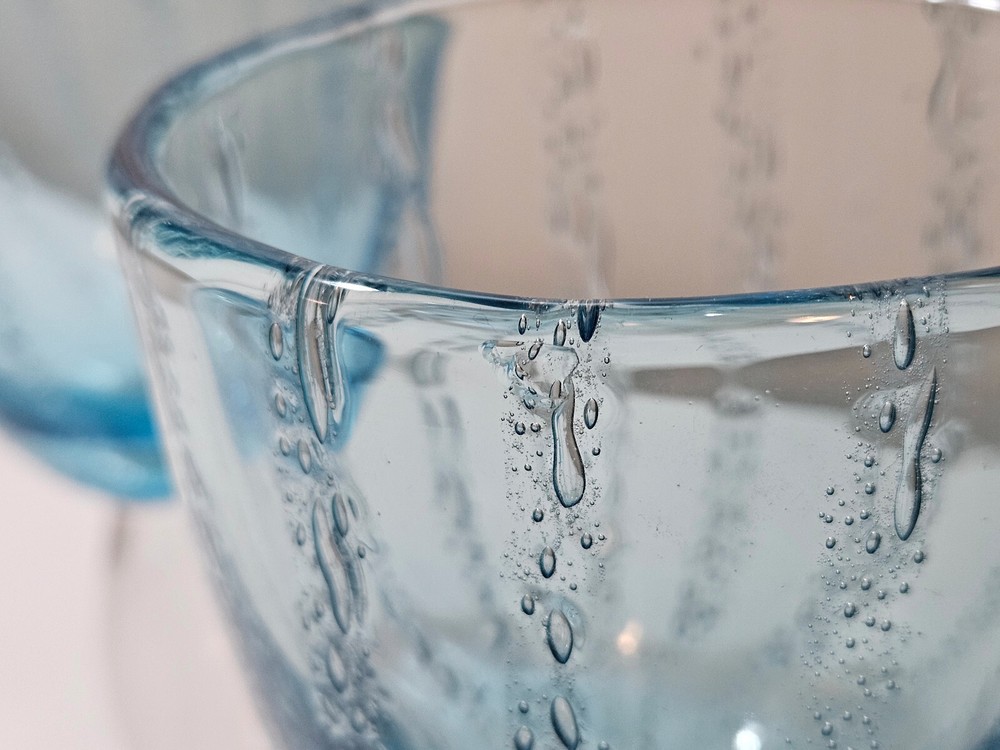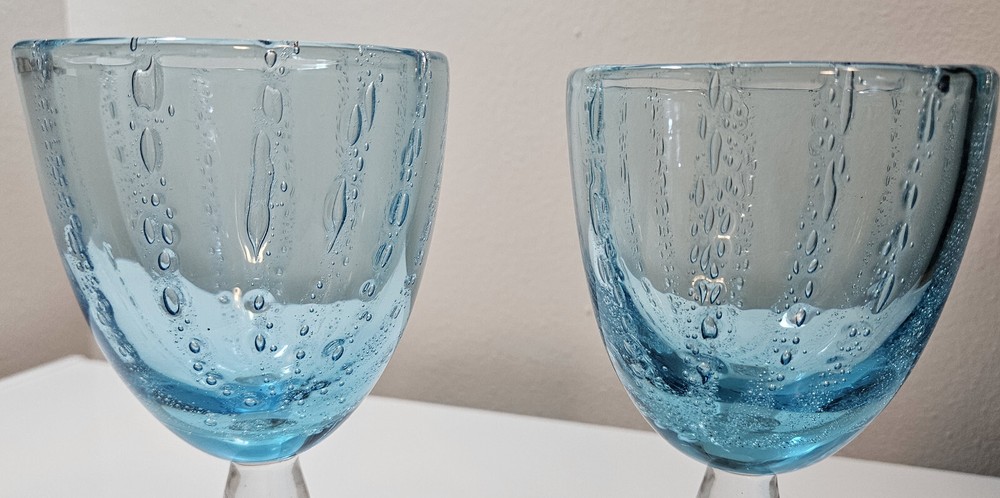 This vintage pair of bubble glass aqua blue wine glasses with clear stems standing at 8 inches tall is a unique addition to any dining or bar collection. The novelty design features a contemporary style with a Spring/Summer theme, making them standout pieces. Made of glass and hand wash only, these wine glasses are perfect for serving 2 guests in a stylish and elegant manner. Add a touch of vintage charm to your home with this eye-catching set of wine glasses.