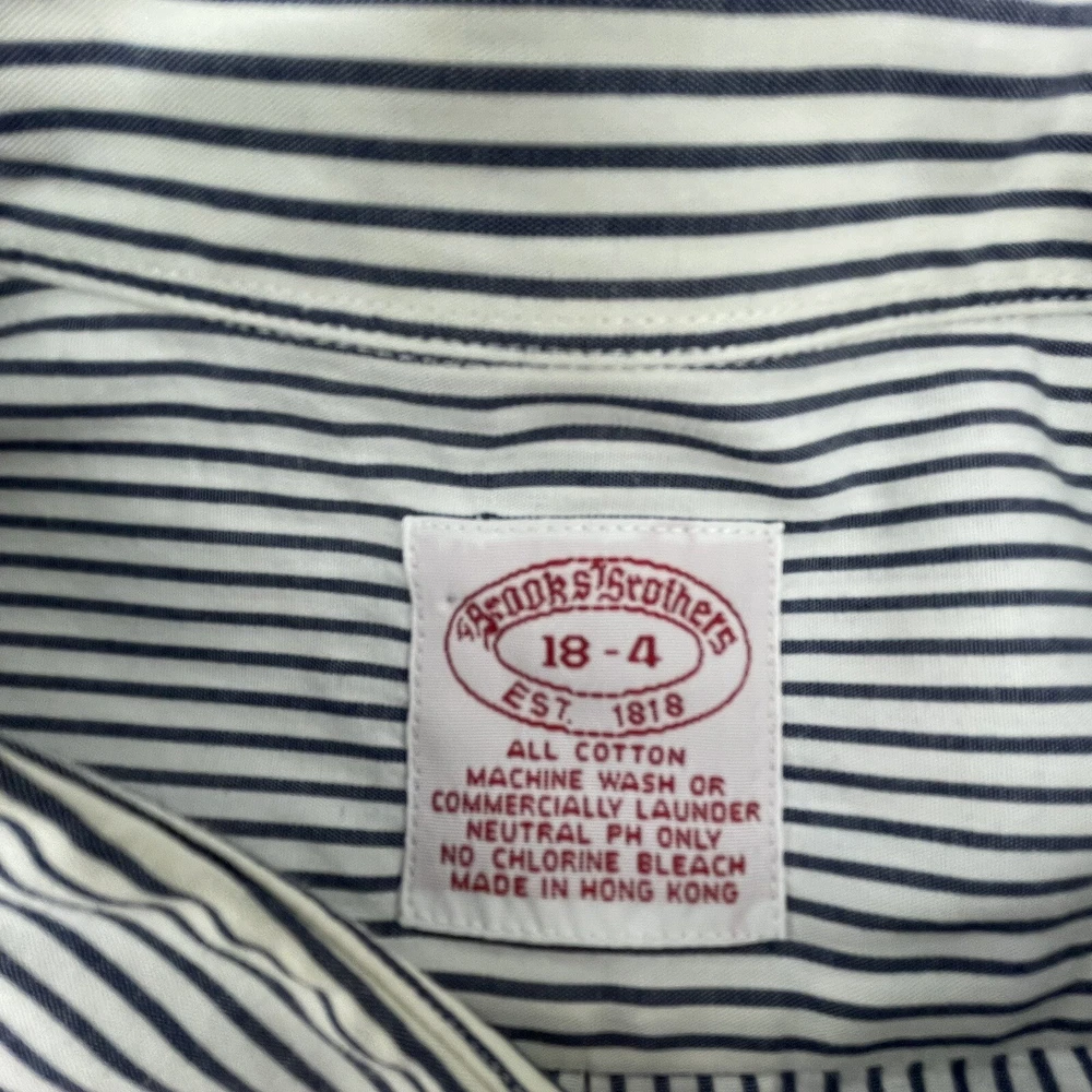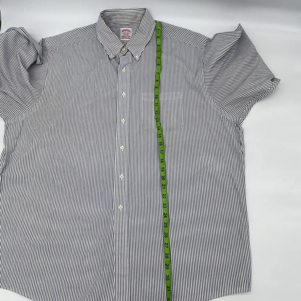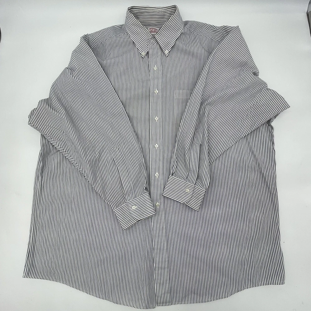 This vintage Brooks Brothers button-up shirt features a black and white striped pattern, long sleeves, and a collared neckline. The shirt is made of cotton fabric and has a regular fit. It also has button accents and a button-down collar style. *previously owned and as such may show signs of normal wear/wash wear including possible faint yellowing at the collar and two tiny holes on the back from a previous price tag. Clean, non smoking. Sold as seen in pictures. Feel free to reach out with any questions prior to purchase. Thank You!