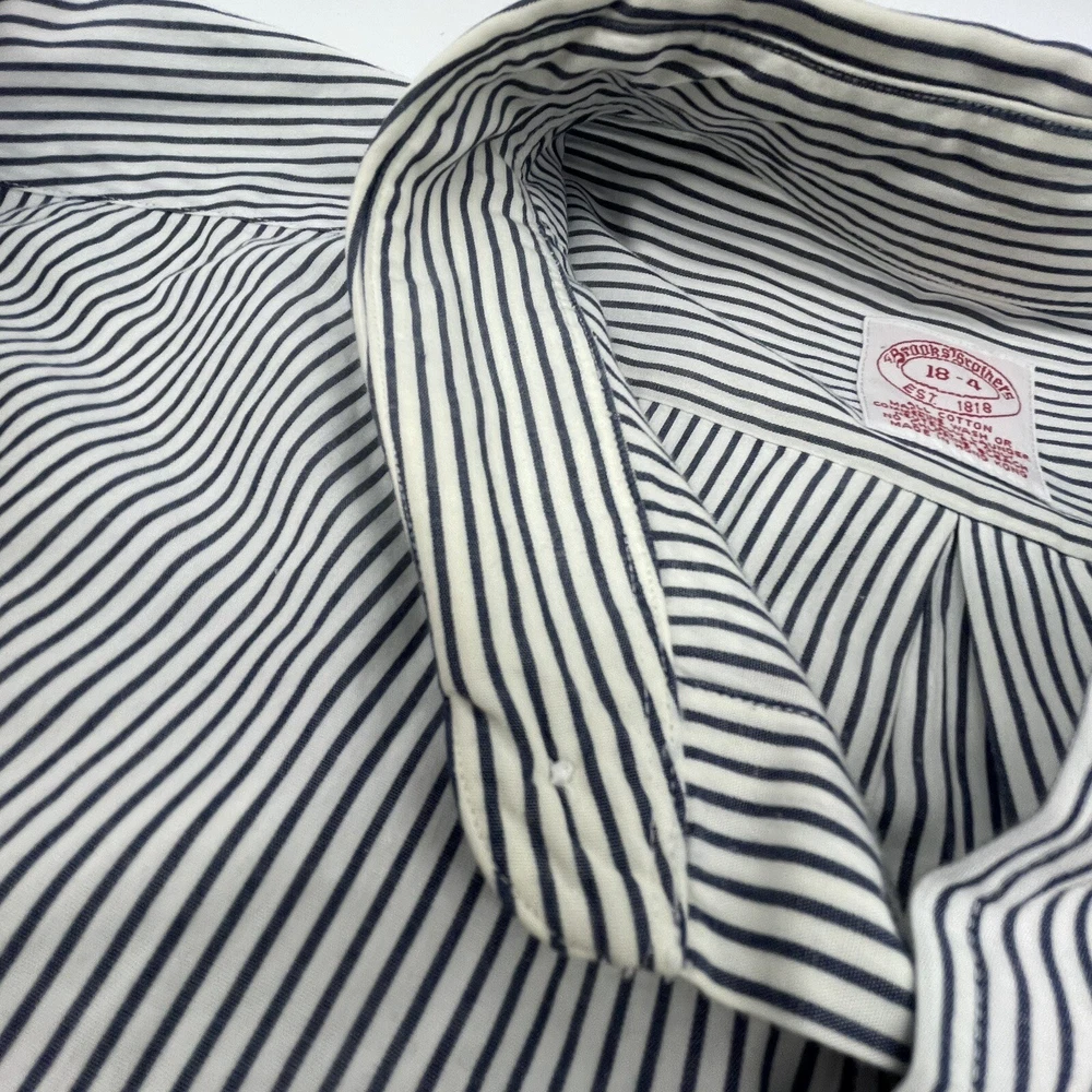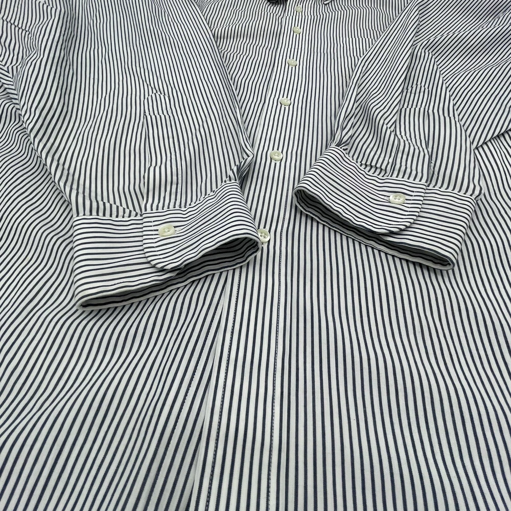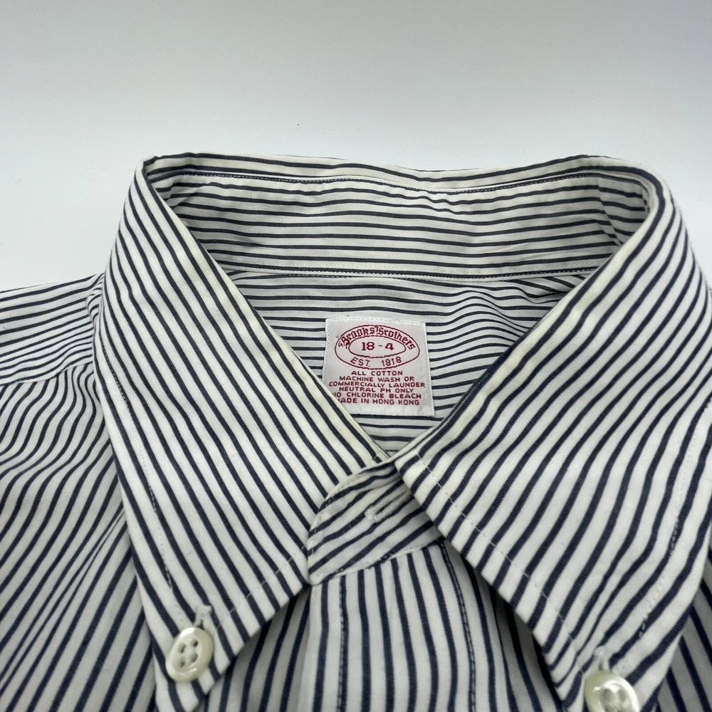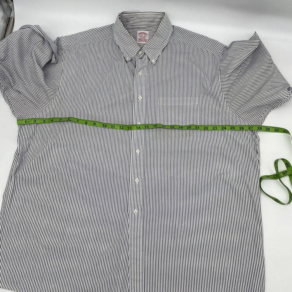 This vintage Brooks Brothers button-up shirt features a black and white striped pattern, long sleeves, and a collared neckline. The shirt is made of cotton fabric and has a regular fit. It also has button accents and a button-down collar style. *previously owned and as such may show signs of normal wear/wash wear including possible faint yellowing at the collar and two tiny holes on the back from a previous price tag. Clean, non smoking. Sold as seen in pictures. Feel free to reach out with any questions prior to purchase. Thank You!