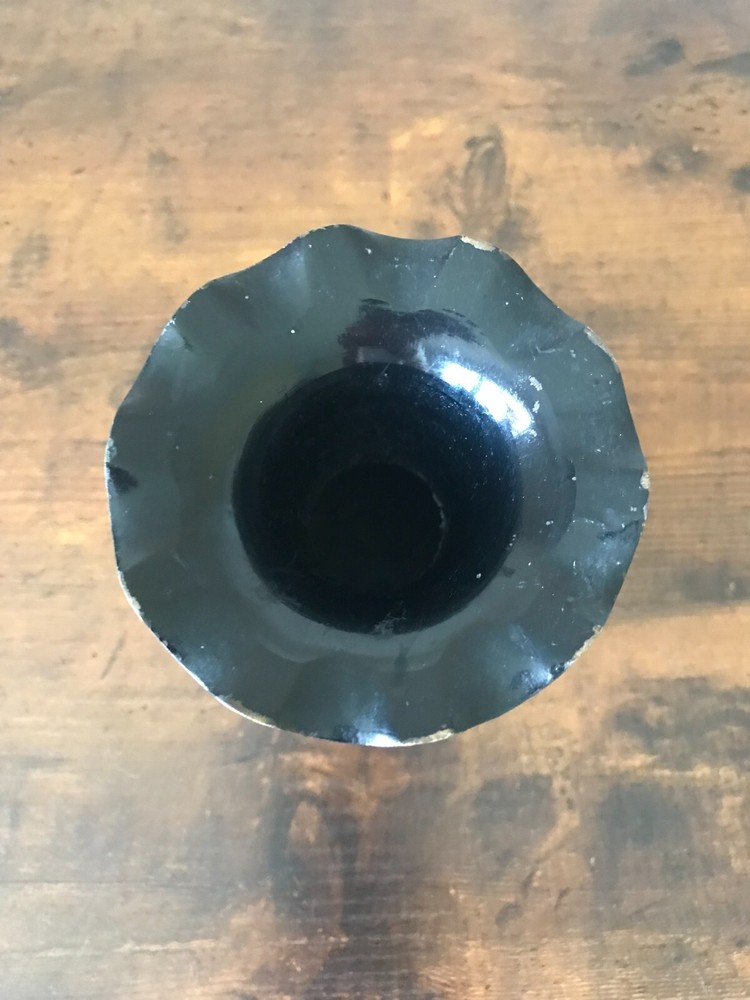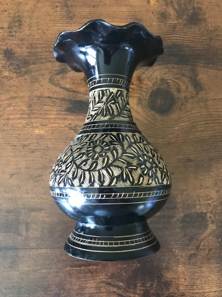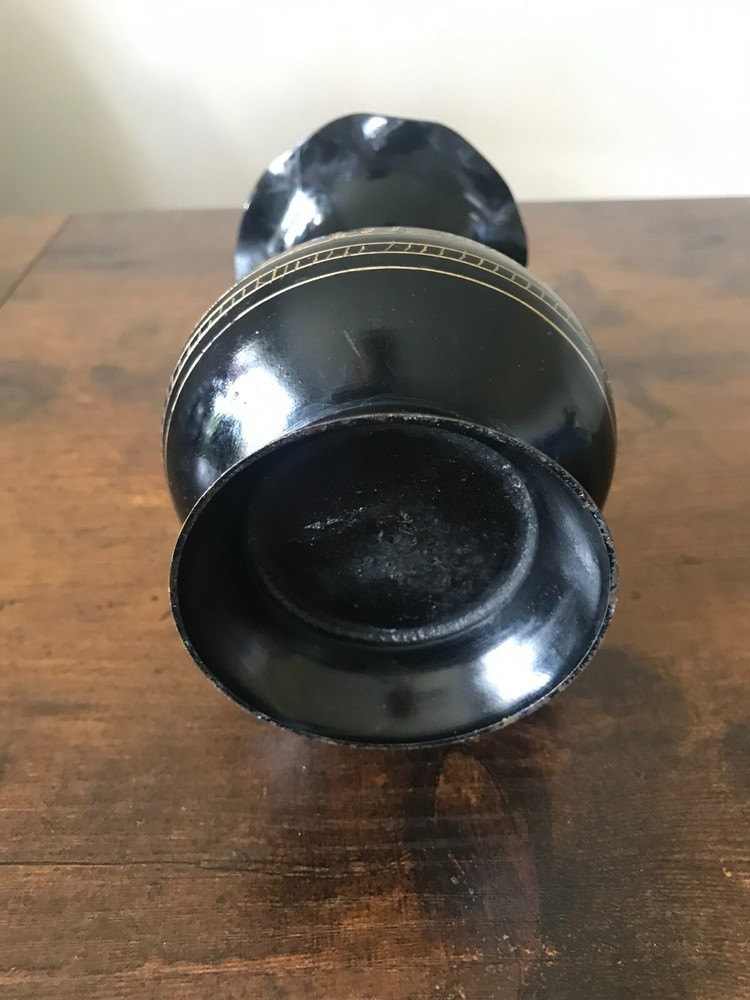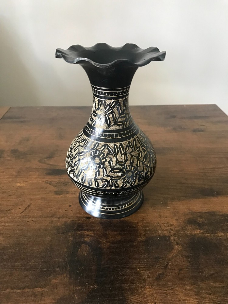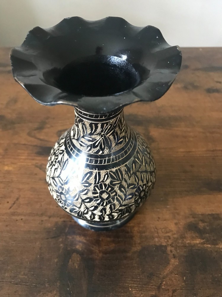 VTG Metal Black & Gold Etched Engraved Floral Vase Scallop Rim Table Art Decor