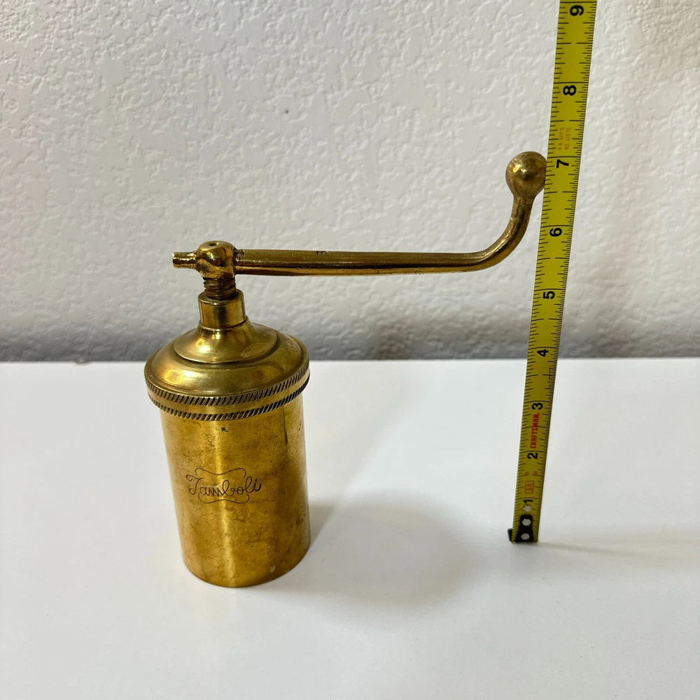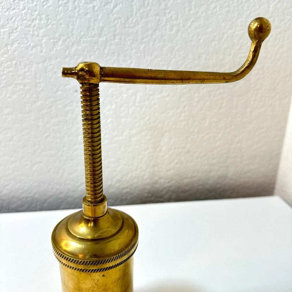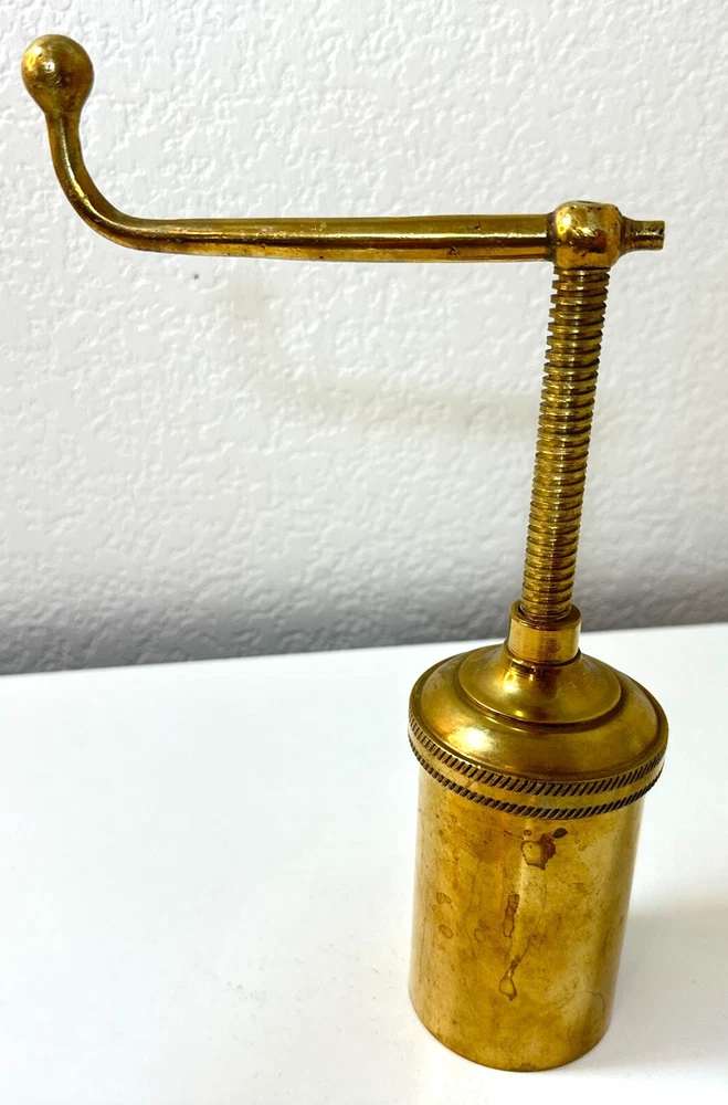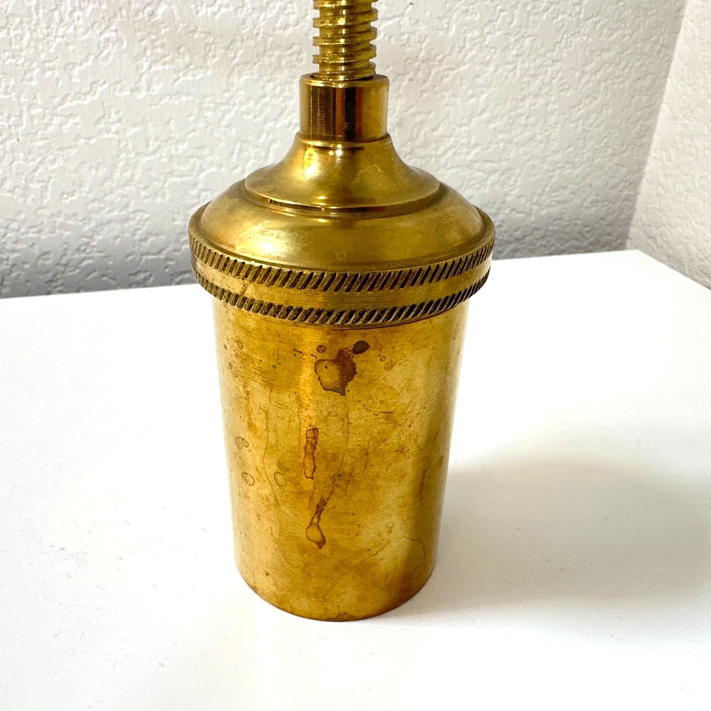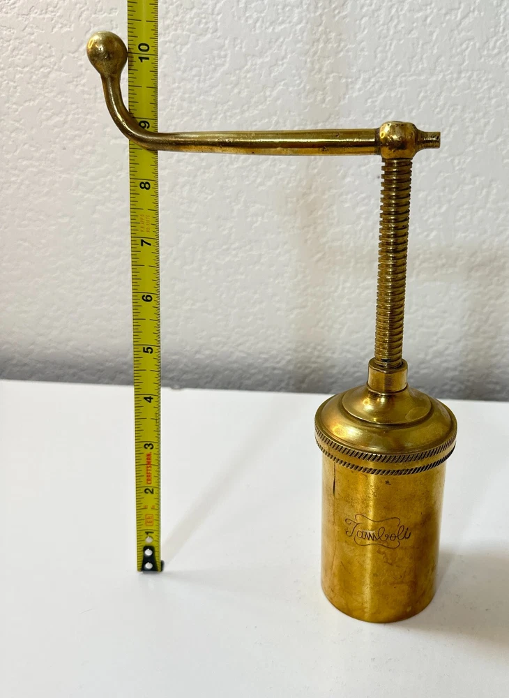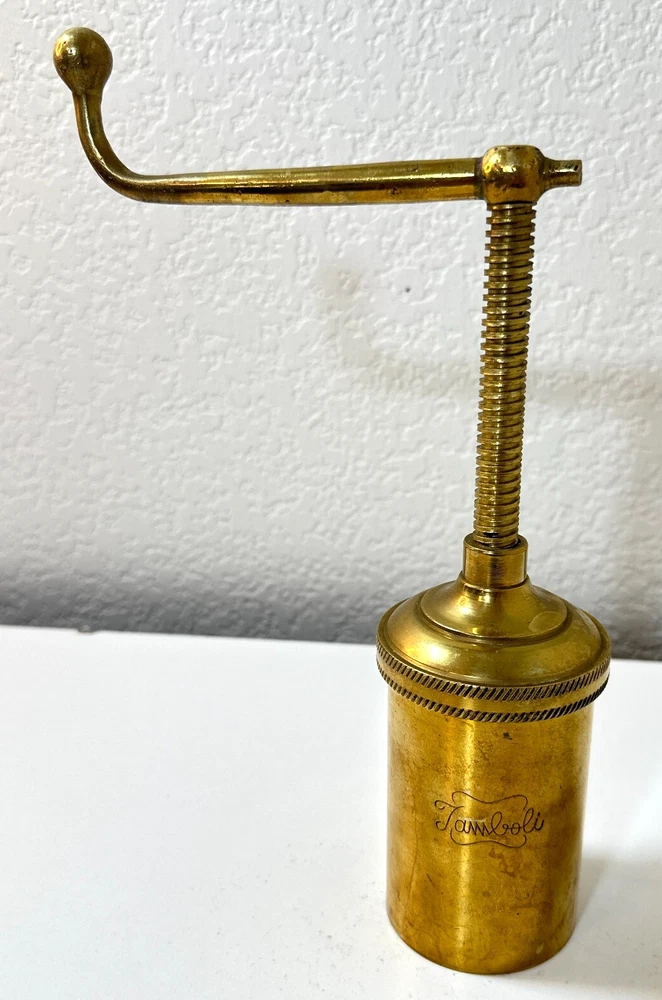 Vintage Brass Jamboli #5 Food Press Retro Kitchen Tool Hand Crank Brass Noodle Mill Approximate Measurements (inches): 2.5" round x 6" h at lowest setting x 9" h when fully unwound Weight: 1 lb, 7 oz The Vintage Brass Jamboli Food Press is a retro kitchen tool that features a hand crank mechanism. Made of brass, this small-sized food press includes 4 discs of varying shapes for pressing dough or pasta. Pre-loved & in great used condition. Some signs of age throughout consistent w/ age, including patina on multiple surfaces. See photos for close ups & measurements. Ready to ship!