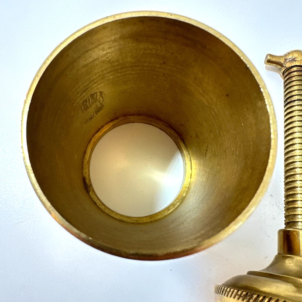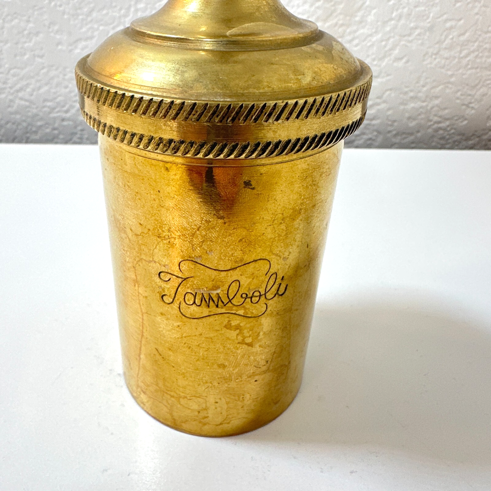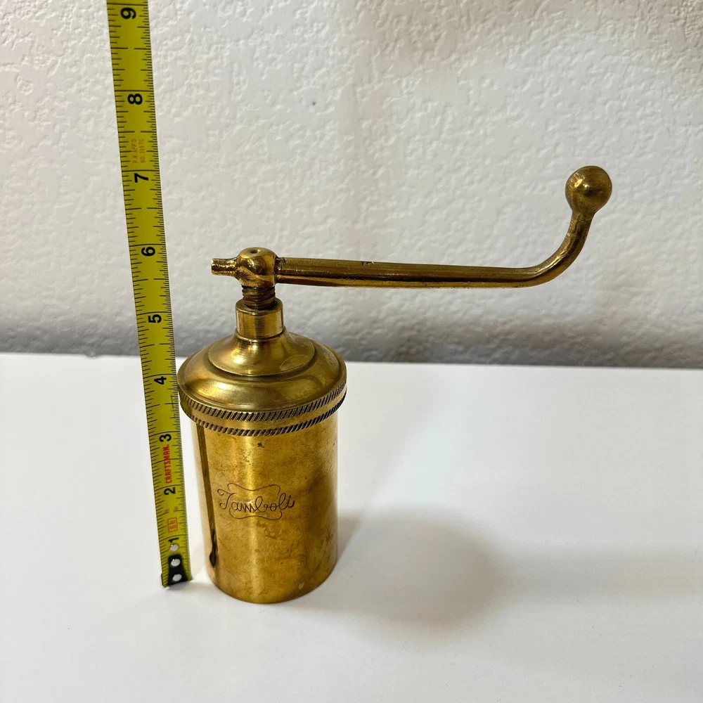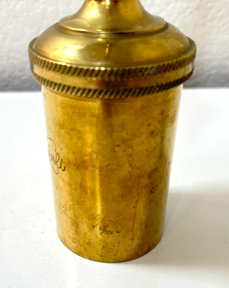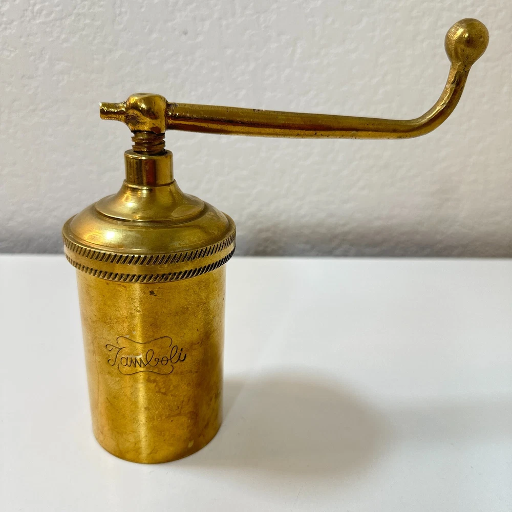 Vintage Brass Jamboli #5 Food Press Retro Kitchen Tool Hand Crank Brass Noodle Mill Approximate Measurements (inches): 2.5" round x 6" h at lowest setting x 9" h when fully unwound Weight: 1 lb, 7 oz The Vintage Brass Jamboli Food Press is a retro kitchen tool that features a hand crank mechanism. Made of brass, this small-sized food press includes 4 discs of varying shapes for pressing dough or pasta. Pre-loved & in great used condition. Some signs of age throughout consistent w/ age, including patina on multiple surfaces. See photos for close ups & measurements. Ready to ship!