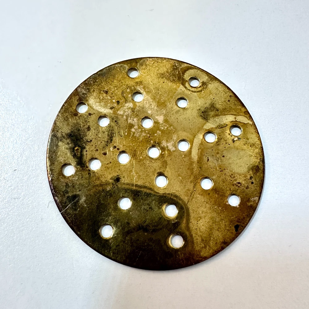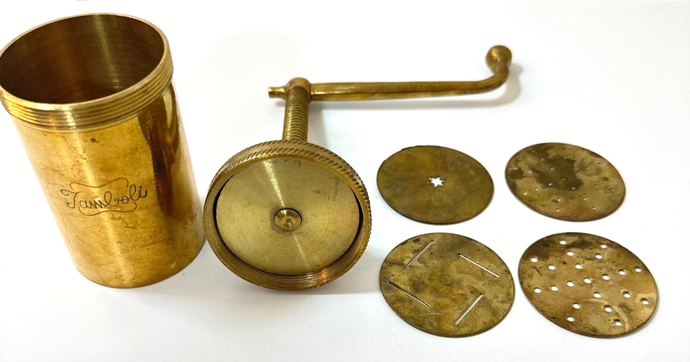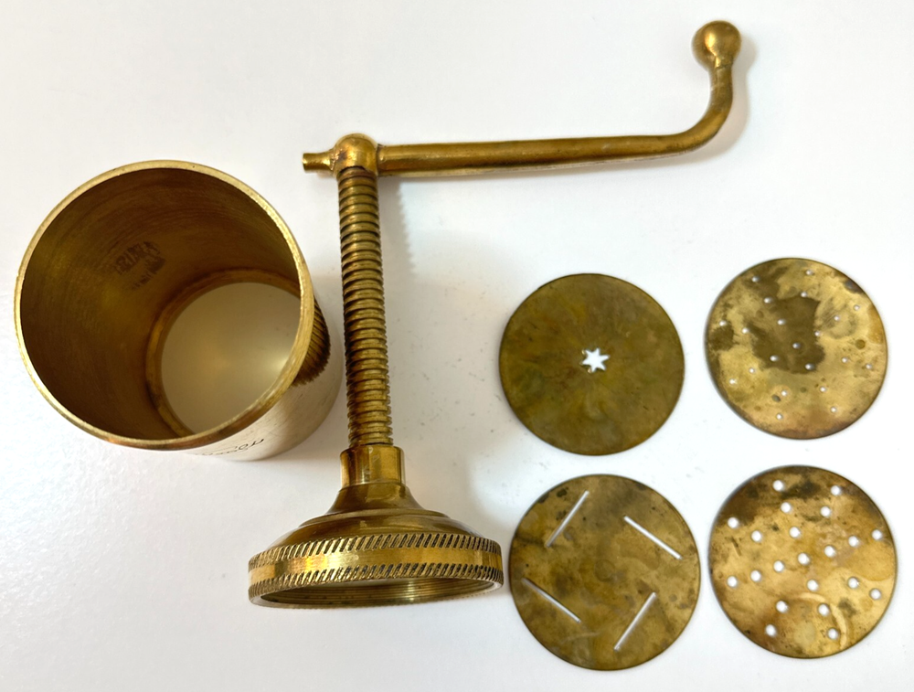 Item Depth: Less Than 10 in Antique: No Components Included: Handle, 4 Discs Item Width: 2.5 in Power Source: Hand Theme: Food Item Height: 6 in - 9 in Item Diameter: 2.5 in Color: Gold Country/Region of Manufacture: India Style: Retro Features: 4 Discs Pattern: Solid Item Weight: 1 lb, 7 oz Shape: Round Brand: Jamboli Number of Items in Set: 5 Food Compatibility: Dough / Pasta Material: Brass Set Includes: 4 Discs Size: Small Type: Food Press Original/Reproduction: Original