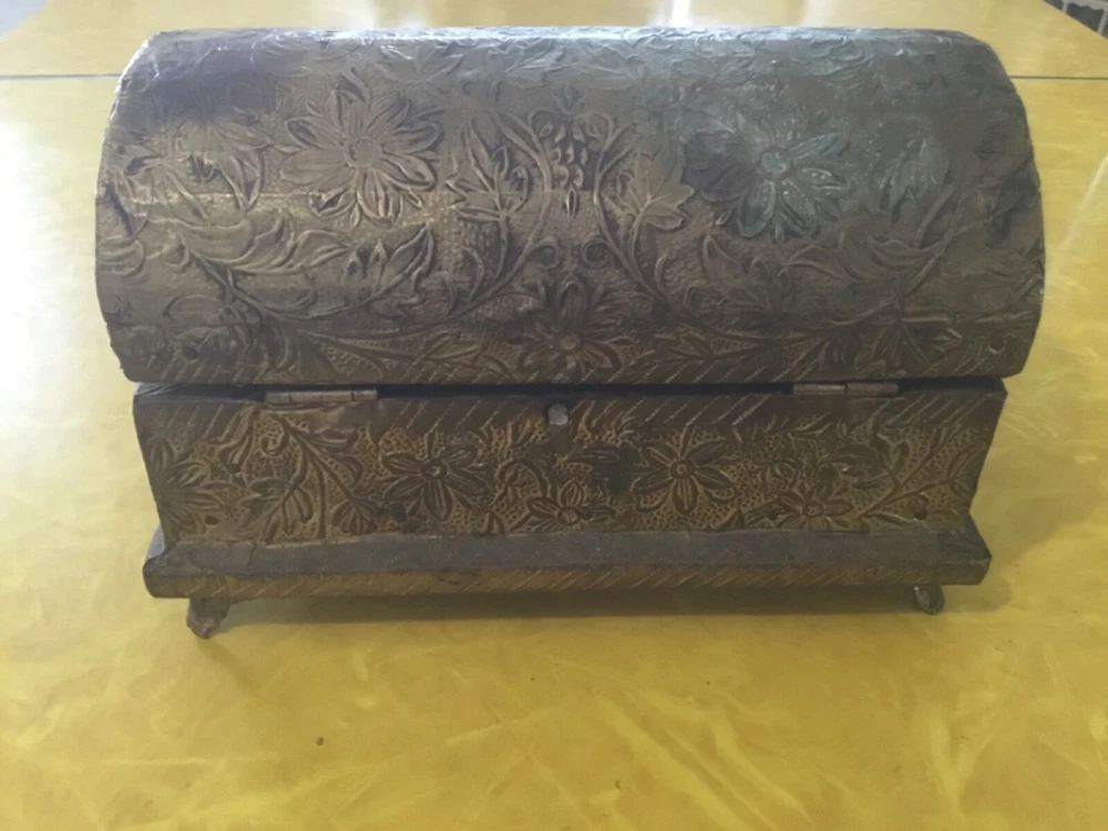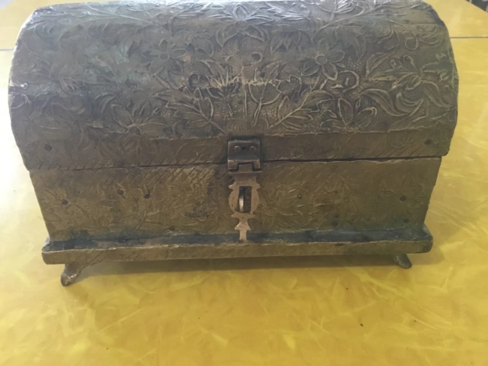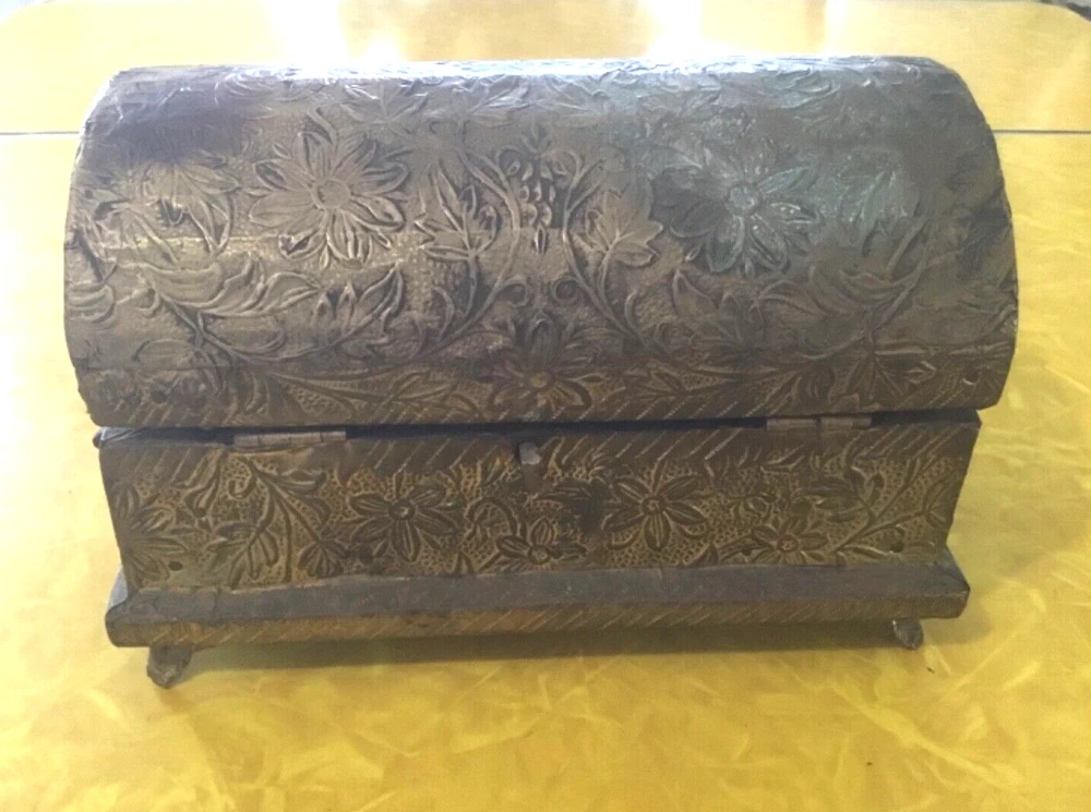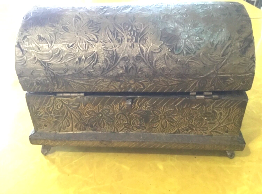 Brass metallic leaf design hinged treasure chest 8”x 5”x5”One hinged needs repair. I put a piece of copper wire thru to stabilize.Lining is worn.