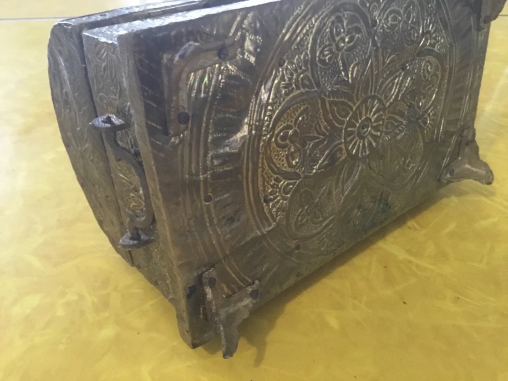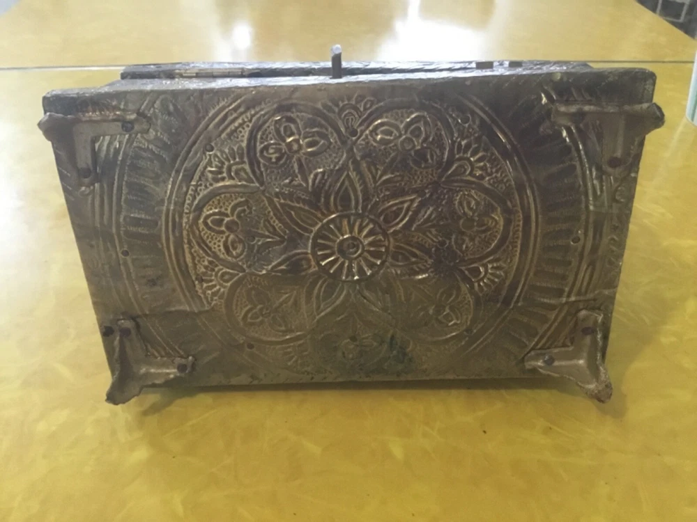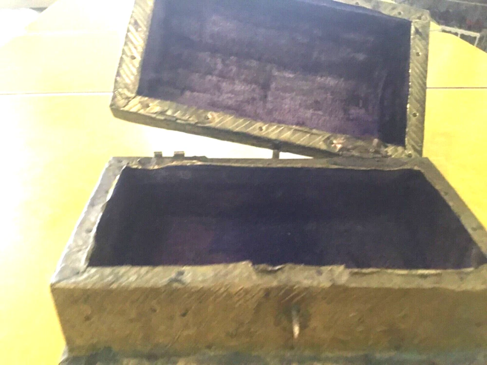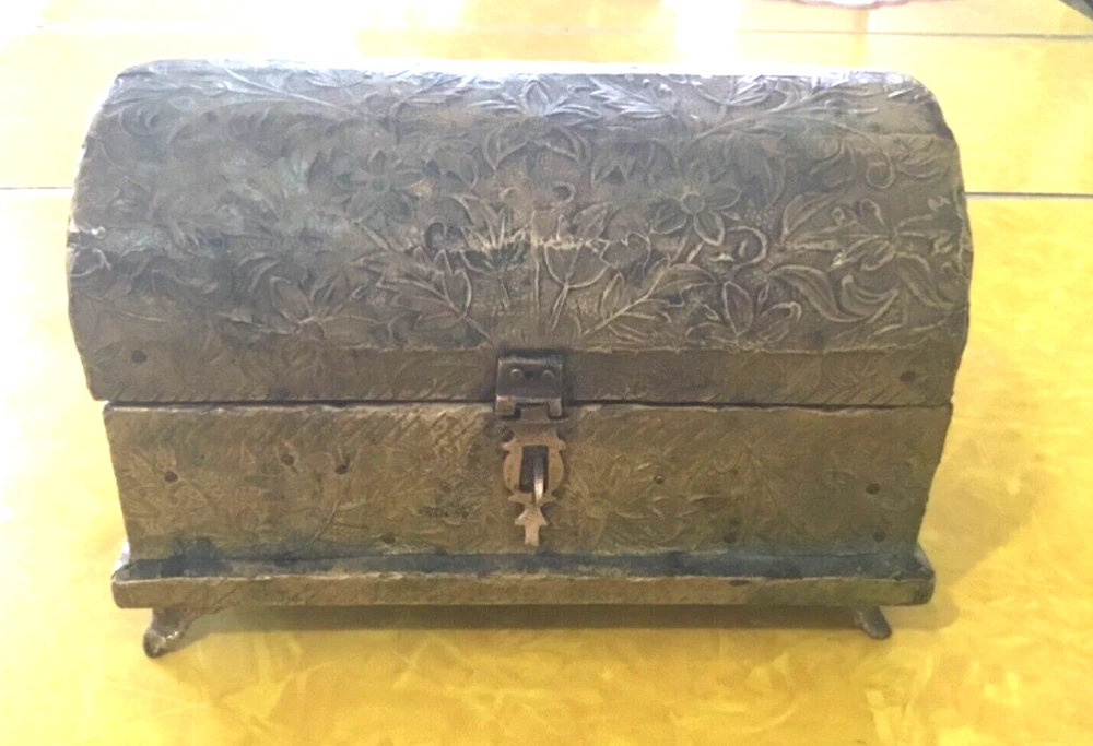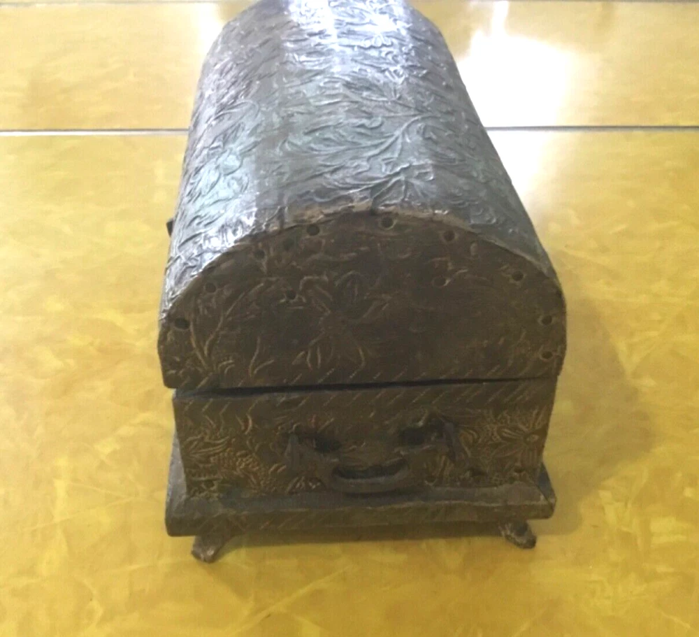 Brass metallic leaf design hinged treasure chest 8”x 5”x5”One hinged needs repair. I put a piece of copper wire thru to stabilize.Lining is worn.
