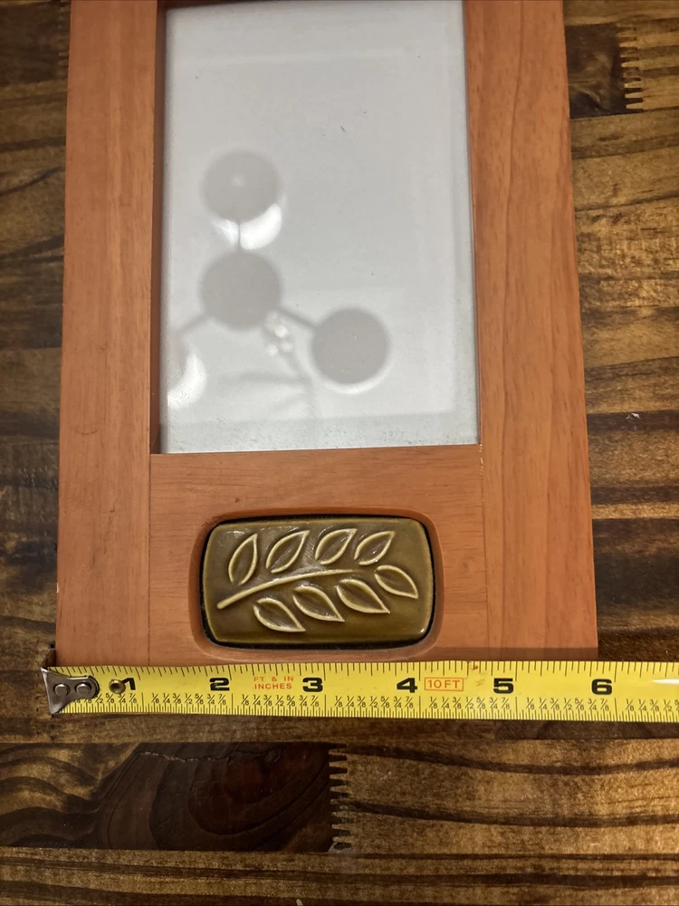 This vintage Burnes of Boston Rare Woods picture frame features an ornate Art Deco style with a ceramic tile insert, suitable for a 4x6 inch photo. Handmade from wood with a brown finish, it has an adjustable viewing angle and can be displayed vertically. The frame also includes intricate foliage patterns and clear glass. This item was manufactured in 2000 in Thailand as part of the Rare Woods 2000 collection.