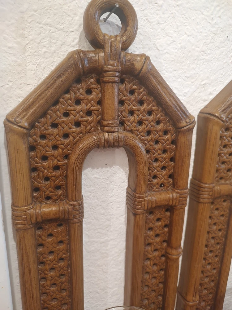 Set of 2 VTG Burwood Homco Faux Rattan Boho Wall Sconces Hanging Candle Holders With Glass Votives, Floral Candle Rings and Candles, good condition.