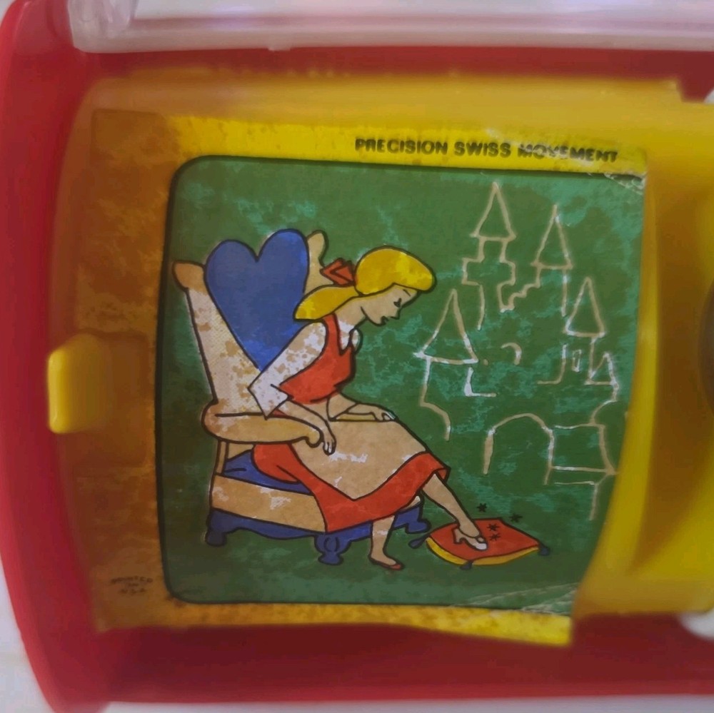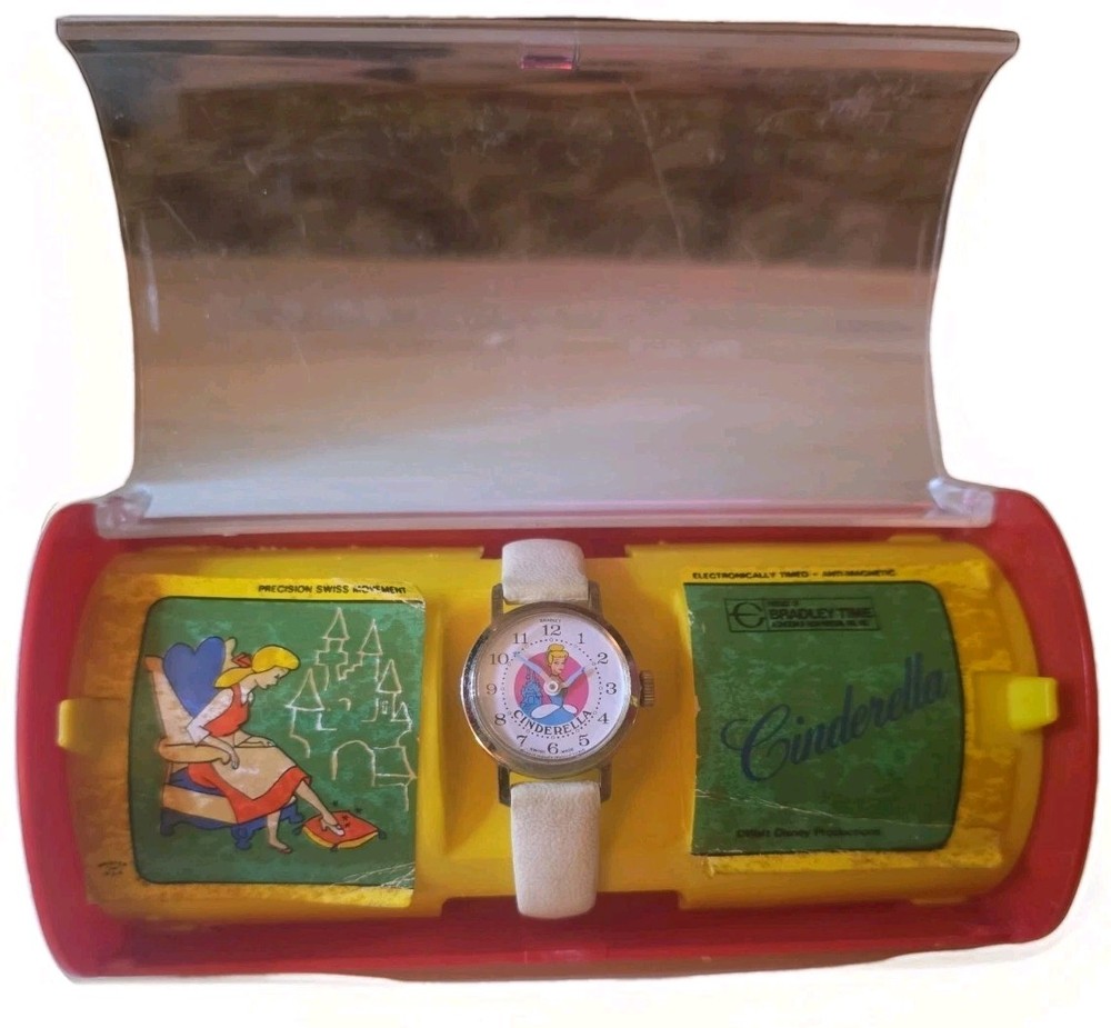 The princess piece is a vintage Walt Disney production Cinderella watch with a Swiss movement, housed in its original case and in working condition. This collectible timepiece features the iconic Disney character Cinderella, making it a unique and nostalgic piece for fans of Disney memorabilia and character-themed accessories. The watch showcases the classic tale of Cinderella and brings a touch of magical charm to its wearer, making it a special addition to any Disney collection.