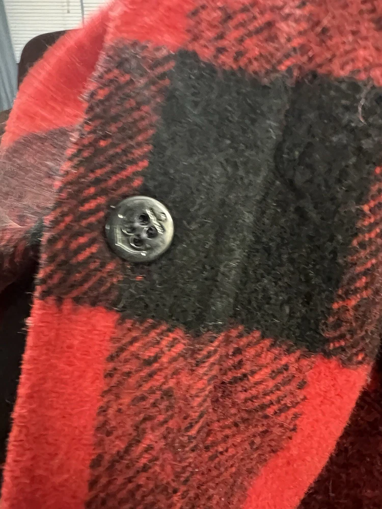 The care, size and material tag has been removed. This is a thick material like wool or wool blend. In good condition with a hole on the collar as pictured. Pit to pit: 24โ Length: 26โ Please see photos. FOLLOW FOR MORE ๐