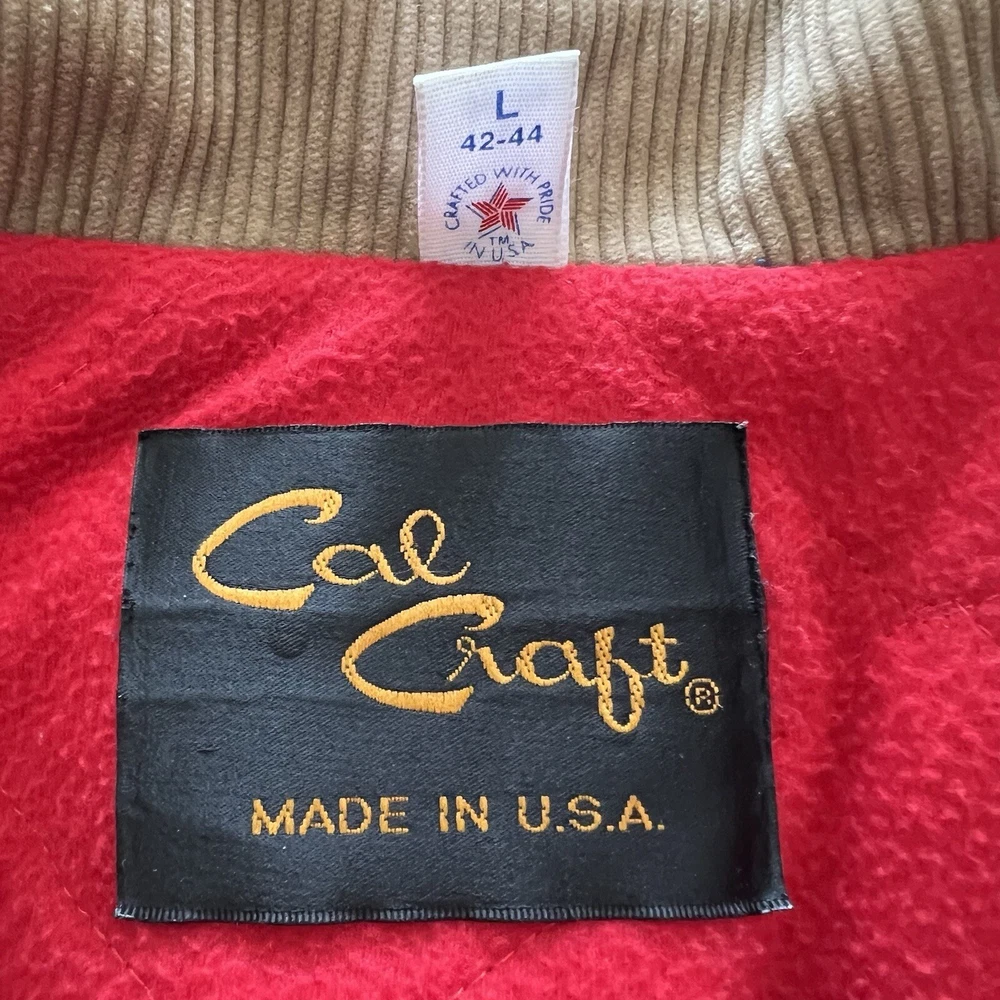 Pattern: Solid Size: L UPC: Does Not Apply Style: Quilted Product Line: Made & Crafted Insulation Material: Synthetic Garment Care: Machine Washable Fit: Regular Jacket/Coat Length: Mid-Length Accents: Button Country/Region of Manufacture: United States Warmth Weight: 300 Collar Style: Point Model: Cal Craft Department: Men gtin13: Does Not Apply Personalize: No Fabric Type: Corduroy Lining Material: Cotton Handmade: No Occasion: Workwear Features: Lined Vintage: Yes Outer Shell Material: Cotton Type: Jacket Brand: Cal Craft Performance/Activity: Walking Closure: Button Color: Blue Theme: Outdoor MPN: Does Not Apply Season: Fall, Winter Size Type: Regular