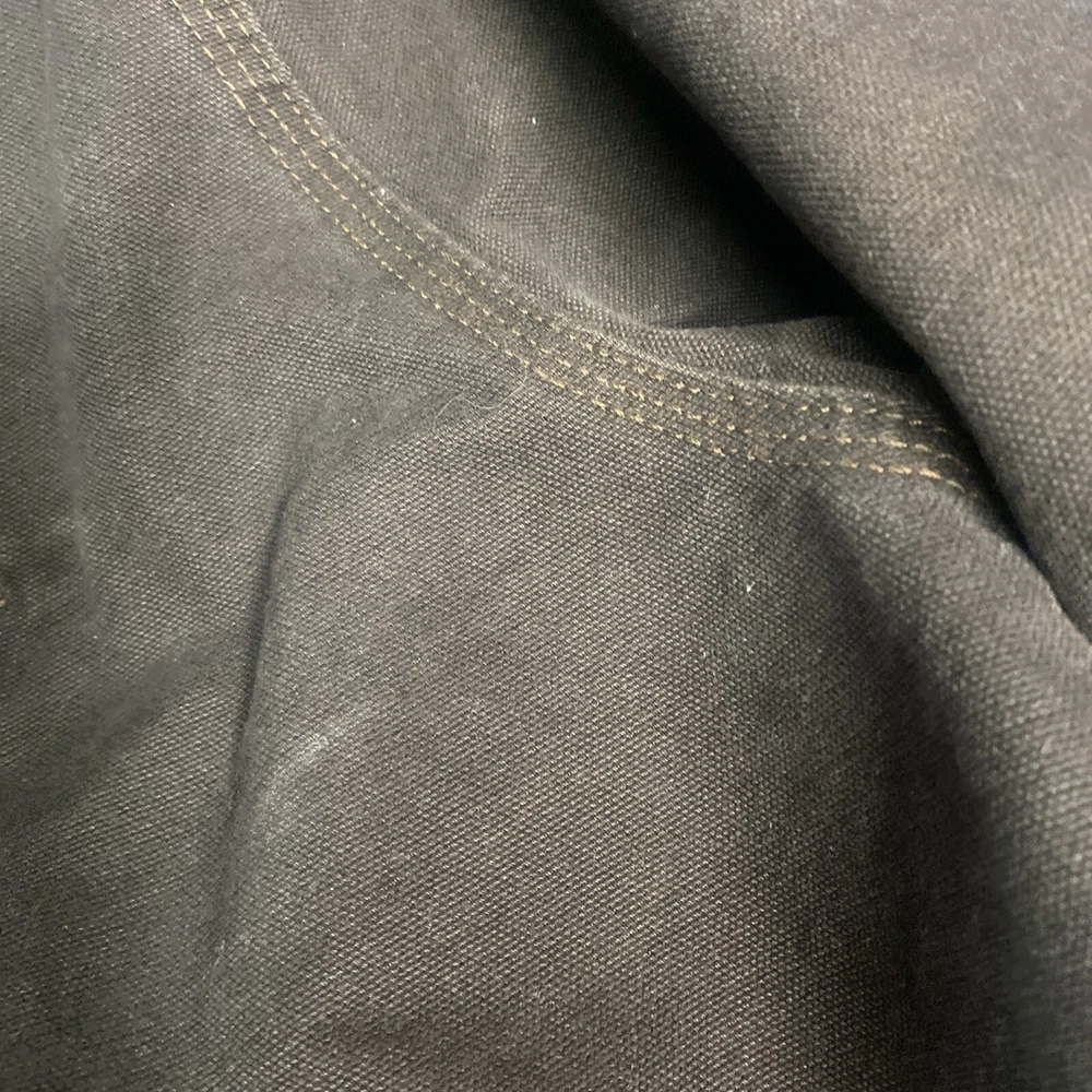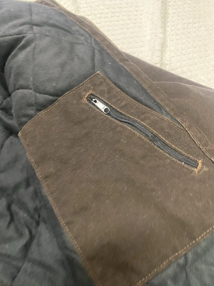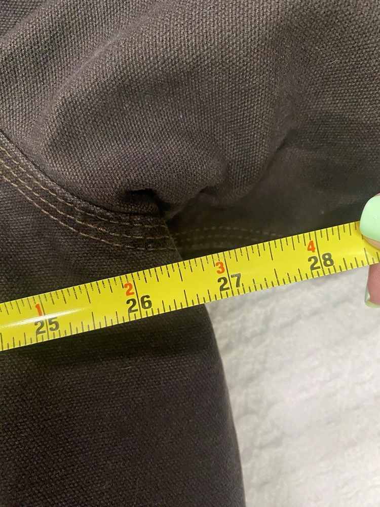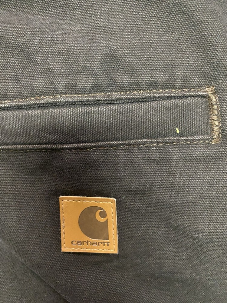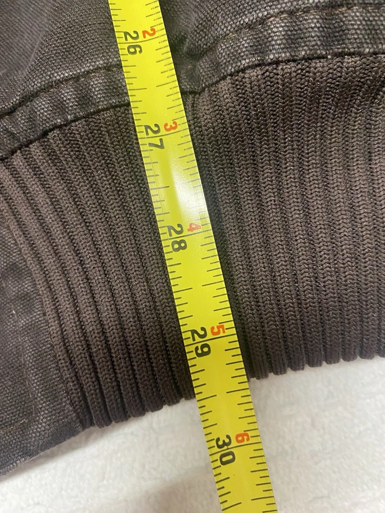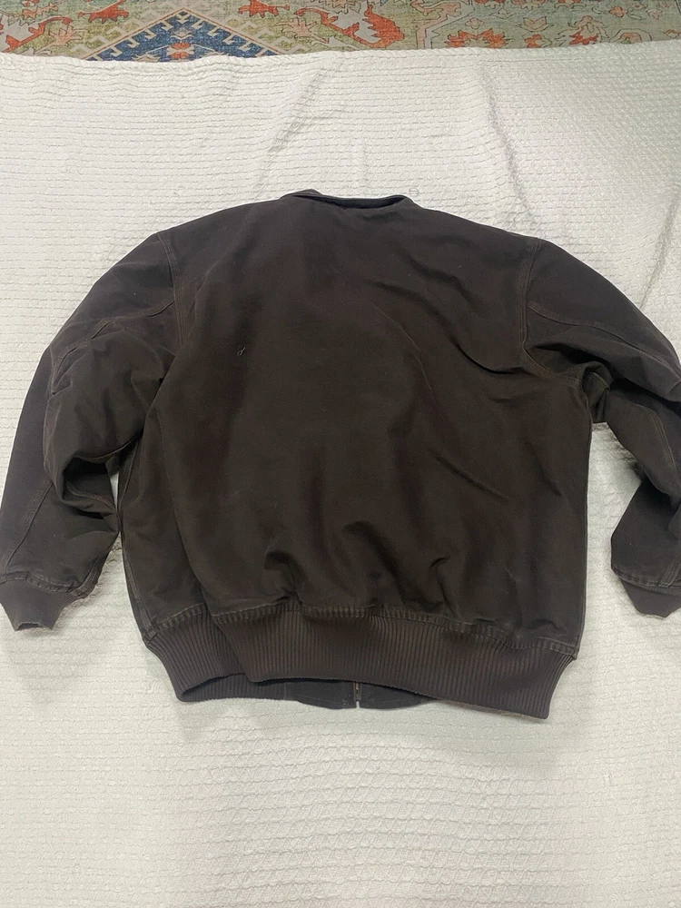 This vintge Carhartt bomber jacket is dark brown in color. It is quilt lined as shown. It does have hand pockets and a chest pocket on the outside. It also has one on each side inside. It has the stretch waist band and sleeve ends. This is in very good condition with normal signs of wear and wash. It does have some very small light spots on it in random places. They are not bad but I want you aware of them. You get the actual item pictured so please look at all photos and ask any questions before purchase.