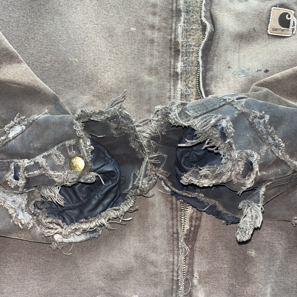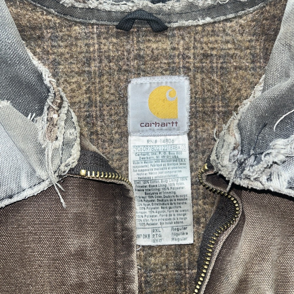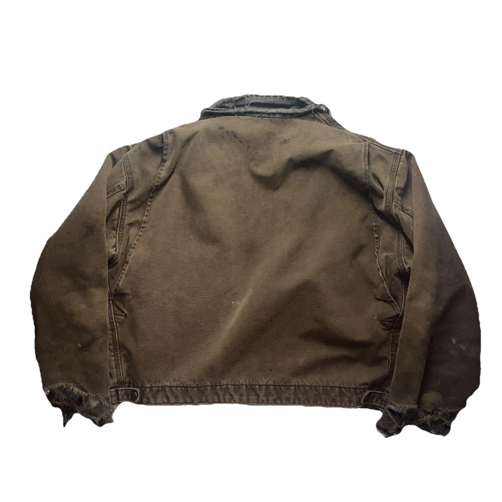 The Vintage Carhartt J97 Dkb Detroit Jacket is a stylish and durable outerwear piece for men. Made of cotton canvas with a solid brown color, this bomber jacket features a zip closure and is lined for added warmth. Carhartt, a well-known brand in the USA, adds a touch of authenticity with its logo accents. Perfect for casual or workwear occasions, this regular fit jacket in size M is a versatile addition to any wardrobe, embodying a classic American aesthetic.