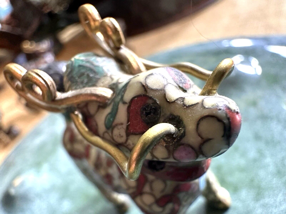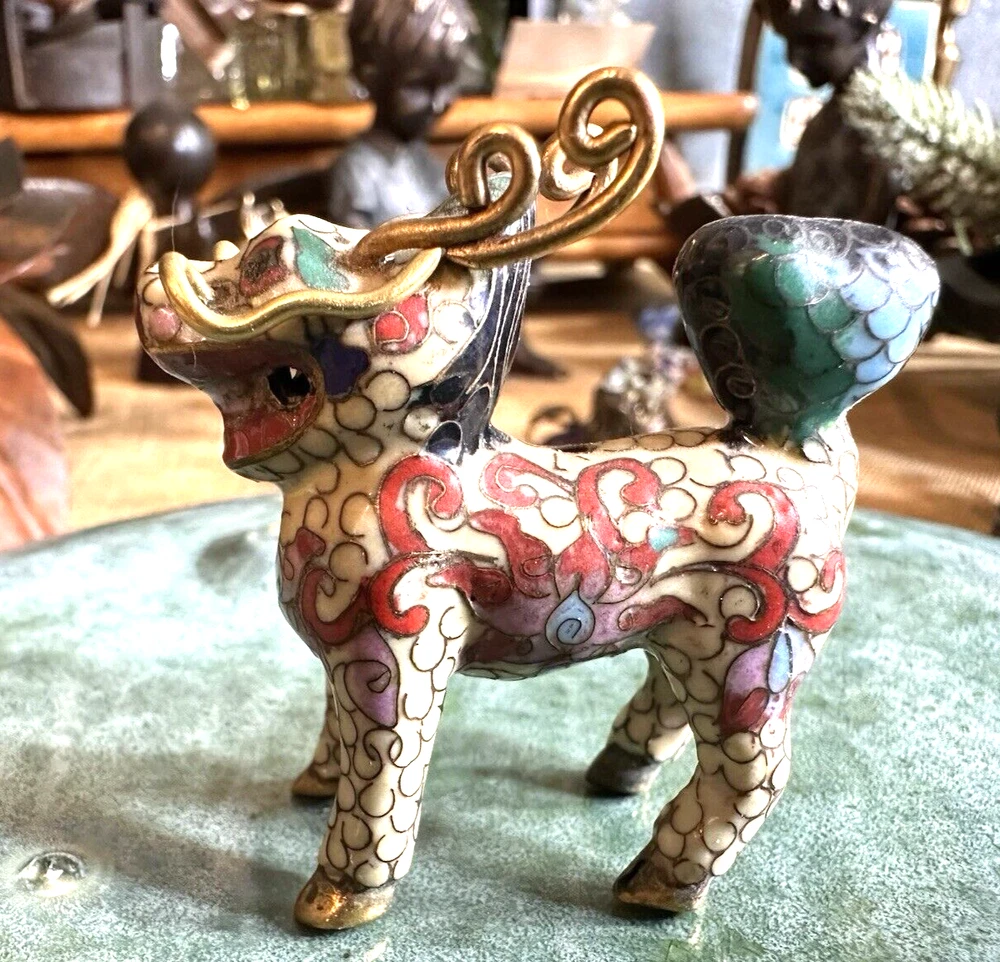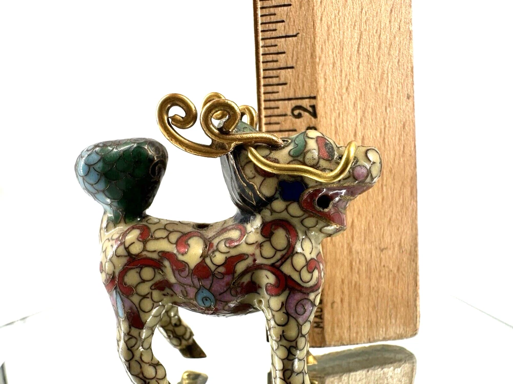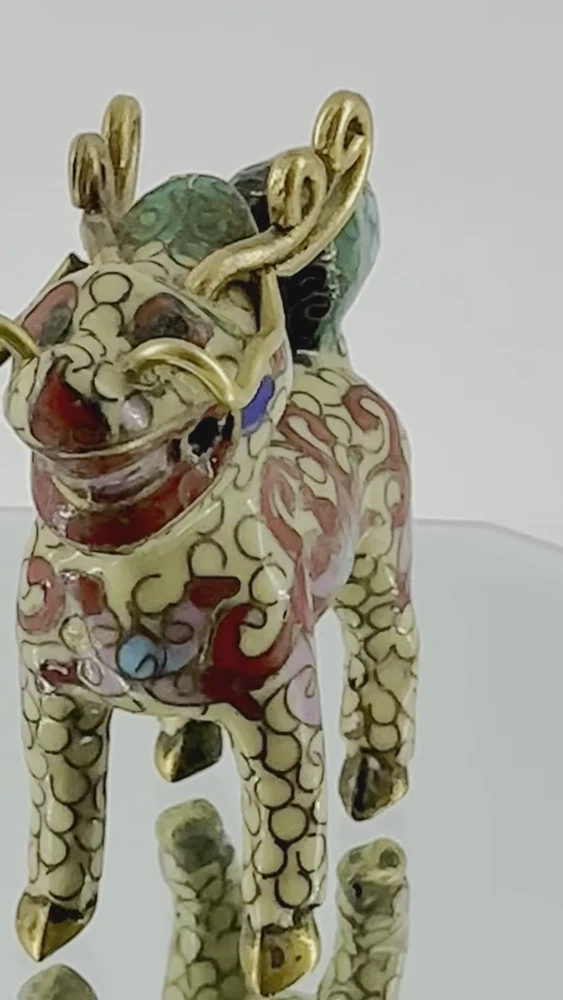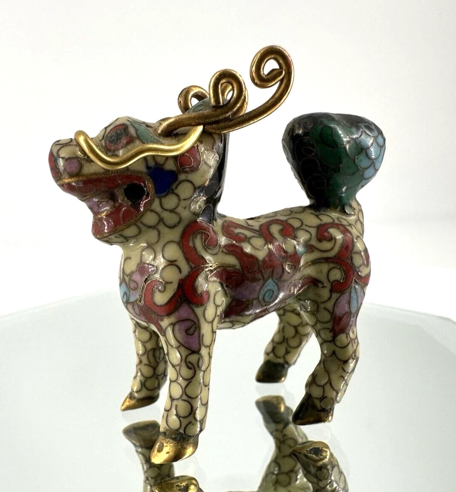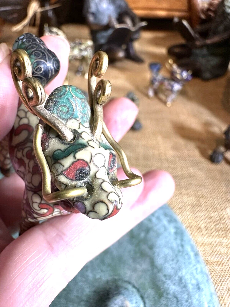 SEE VIDEO to appreciate this very vintage (believe is antique) Cloisonne fu / foo dog. This vintage bronze / brass lion beast statue is a Cloisonne Guardian Foo Dog, standing at 2 inches tall. Hand painted in a bronze color, this imperial guardian lion, also known as a shishi or Foo Dog, originates from China and dates back to the early to mid 20th century. The intricate design and craftsmanship of this Asian lion make it a unique and decorative piece for those interested in Asian antiques and animal-themed decor. It is such a great find -- for you. In great vintage condition. (Note: The holes within cloisonne pieces is where they enter to complete the detailing of the piece. I really love this fu dog -- and I am sure you will too! You may see other items in the background of the pictures, as well. If you are new here, these items will be listed either this week or next week. So, this gives you a sneak peak of what is coming up next. :) There are a couple of fu dogs that will be listed next week -- if you are a collector. Also, if you are a collector of cloisonne in itself -- I just listed a small horse, which too is gorgeous. Here is my Ebay Shop: YouBeYou LLC If you have any questions even after you have purchased the item --- I am here for you to answer any questions that you may have! I strive to work diligently with every buyer to ensure they are a satisfied buyer, so please contact me anytime. This is a pre-owned item and I take great care to accurately describe the item but please see the pictures for full details. While we do our best to list every item in detail, these are vintage and pre-owned items, and some flaws are to be expected. Please see all photos/ video as they are a large part of the description of our items. Items come from a smoke-free environment. Each item is described in accurate detail with multiple measurements and various photos at different angles front and back, side to side, top and bottom. I have additional similar items that I have yet to list that you may be interested in. Feel free to follow my store ( YouBeYou LLC ) to see those when posted. Please see all photos/ video as they are a large part of the description of our items. I strive to make every purchase a pleasant experience. Please feel confidence in you purchase that I'll make every effort to correct any issues that may arise. If used, there are always some signs of wear -- well, because it is used, vintage, or antique. Most items are used -- Each item is inspected for quality. It is very important to us that you have a happy Ebay experience! Thank you for supporting a small business like ours! (Note: pictures may include measurements, and some have a video.)