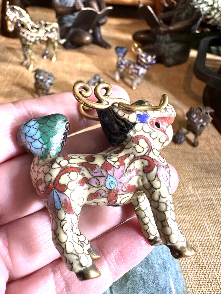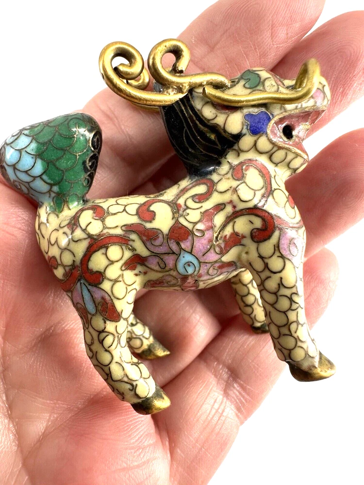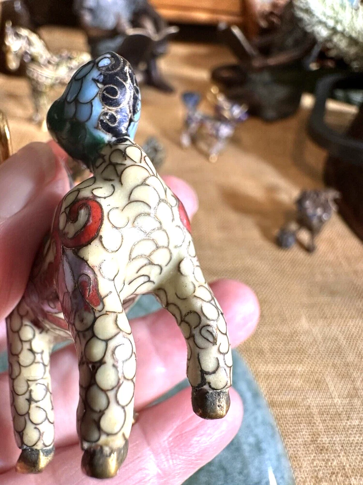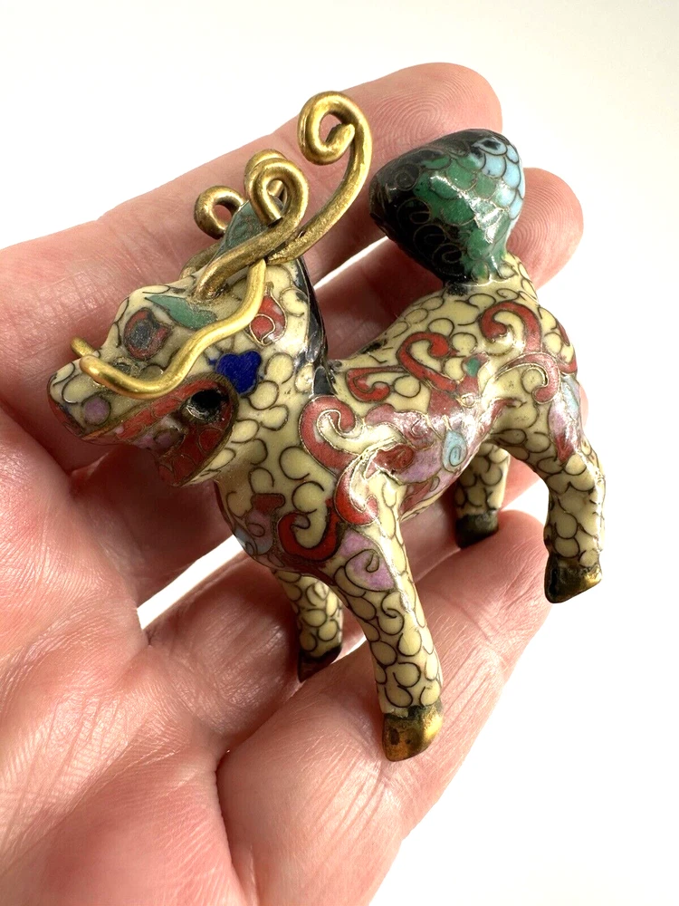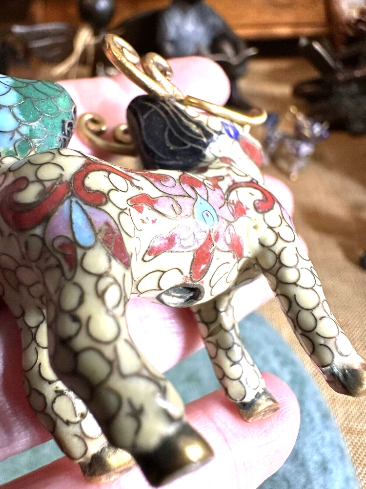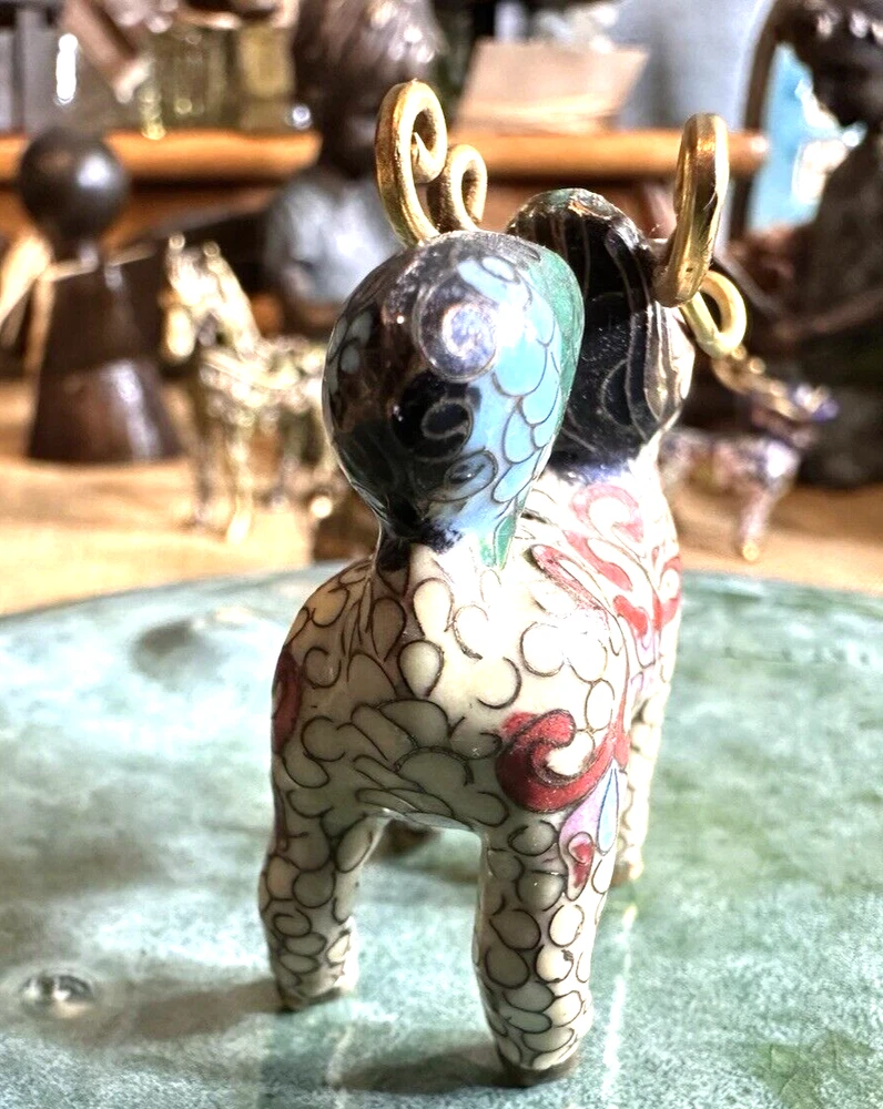 SEE VIDEO to appreciate this very vintage (believe is antique) Cloisonne fu / foo dog. This vintage bronze / brass lion beast statue is a Cloisonne Guardian Foo Dog, standing at 2 inches tall. Hand painted in a bronze color, this imperial guardian lion, also known as a shishi or Foo Dog, originates from China and dates back to the early to mid 20th century. The intricate design and craftsmanship of this Asian lion make it a unique and decorative piece for those interested in Asian antiques and animal-themed decor. It is such a great find -- for you. In great vintage condition. (Note: The holes within cloisonne pieces is where they enter to complete the detailing of the piece. I really love this fu dog -- and I am sure you will too! You may see other items in the background of the pictures, as well. If you are new here, these items will be listed either this week or next week. So, this gives you a sneak peak of what is coming up next. :) There are a couple of fu dogs that will be listed next week -- if you are a collector. Also, if you are a collector of cloisonne in itself -- I just listed a small horse, which too is gorgeous. Here is my Ebay Shop: YouBeYou LLC If you have any questions even after you have purchased the item --- I am here for you to answer any questions that you may have! I strive to work diligently with every buyer to ensure they are a satisfied buyer, so please contact me anytime. This is a pre-owned item and I take great care to accurately describe the item but please see the pictures for full details. While we do our best to list every item in detail, these are vintage and pre-owned items, and some flaws are to be expected. Please see all photos/ video as they are a large part of the description of our items. Items come from a smoke-free environment. Each item is described in accurate detail with multiple measurements and various photos at different angles front and back, side to side, top and bottom. I have additional similar items that I have yet to list that you may be interested in. Feel free to follow my store ( YouBeYou LLC ) to see those when posted. Please see all photos/ video as they are a large part of the description of our items. I strive to make every purchase a pleasant experience. Please feel confidence in you purchase that I'll make every effort to correct any issues that may arise. If used, there are always some signs of wear -- well, because it is used, vintage, or antique. Most items are used -- Each item is inspected for quality. It is very important to us that you have a happy Ebay experience! Thank you for supporting a small business like ours! (Note: pictures may include measurements, and some have a video.)