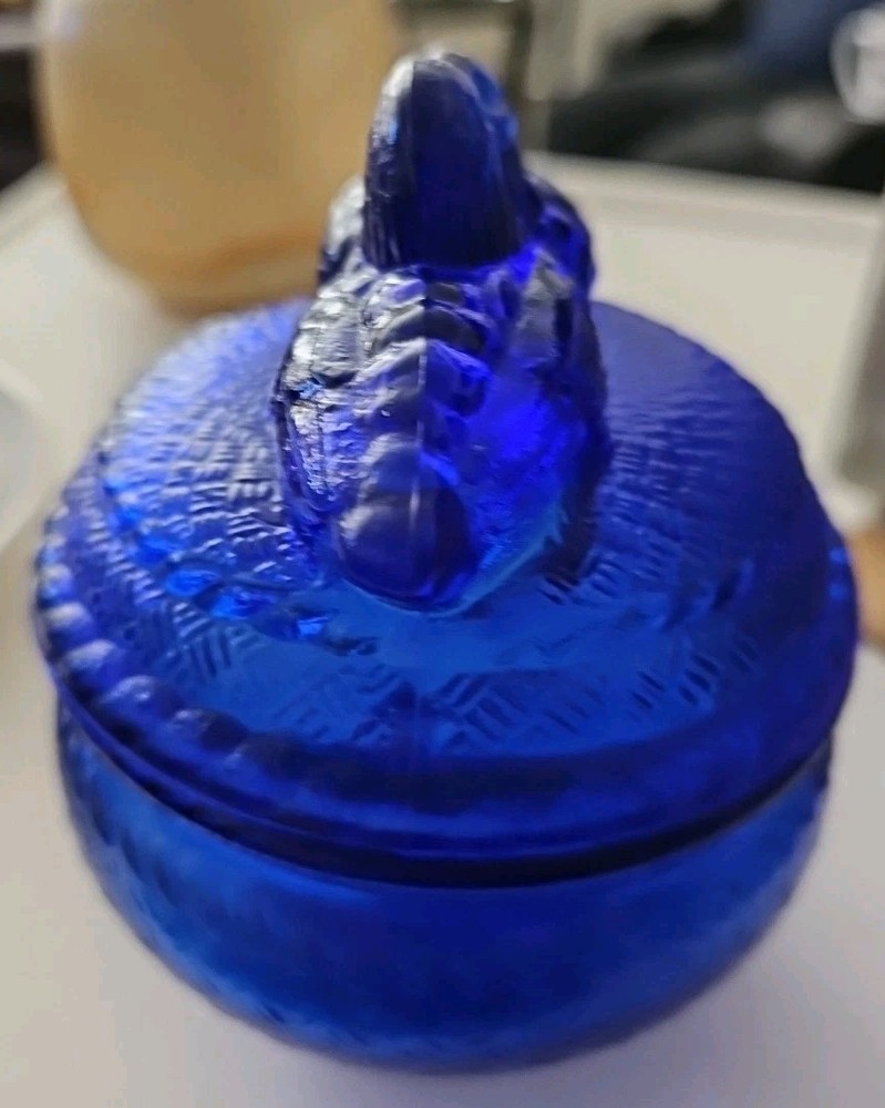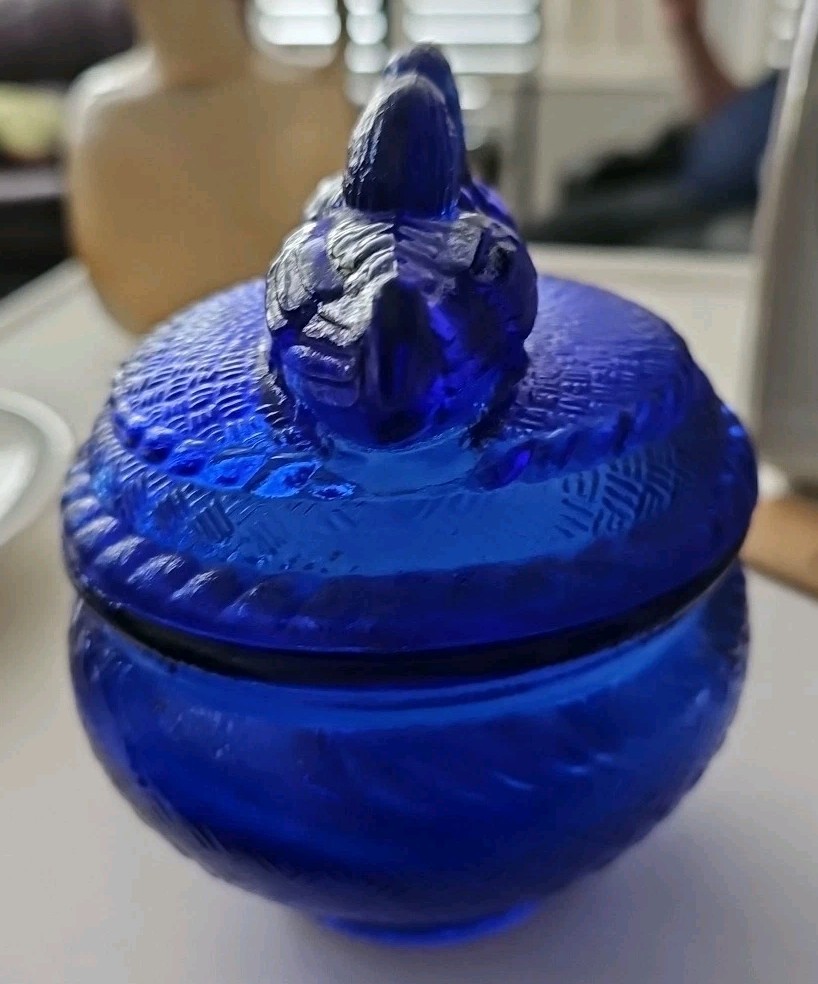 EXCELLENT CONDITION FREE FROM CHIPS, CRACKS OR SCRATCHES. The image shows a vintage cobalt blue glass candy dish with a lid featuring two kissing birds. Helpful information: It is likely from the 1950s. The dish is made of cobalt blue glass. It can be used for storing candy or small trinkets. Similar dishes are identified as "Hofbauer Byrdes" or "Westmoreland". The design is also known as "kissing love birds on nest". It's a collectible decorative piece. The item in the image is unmarked.